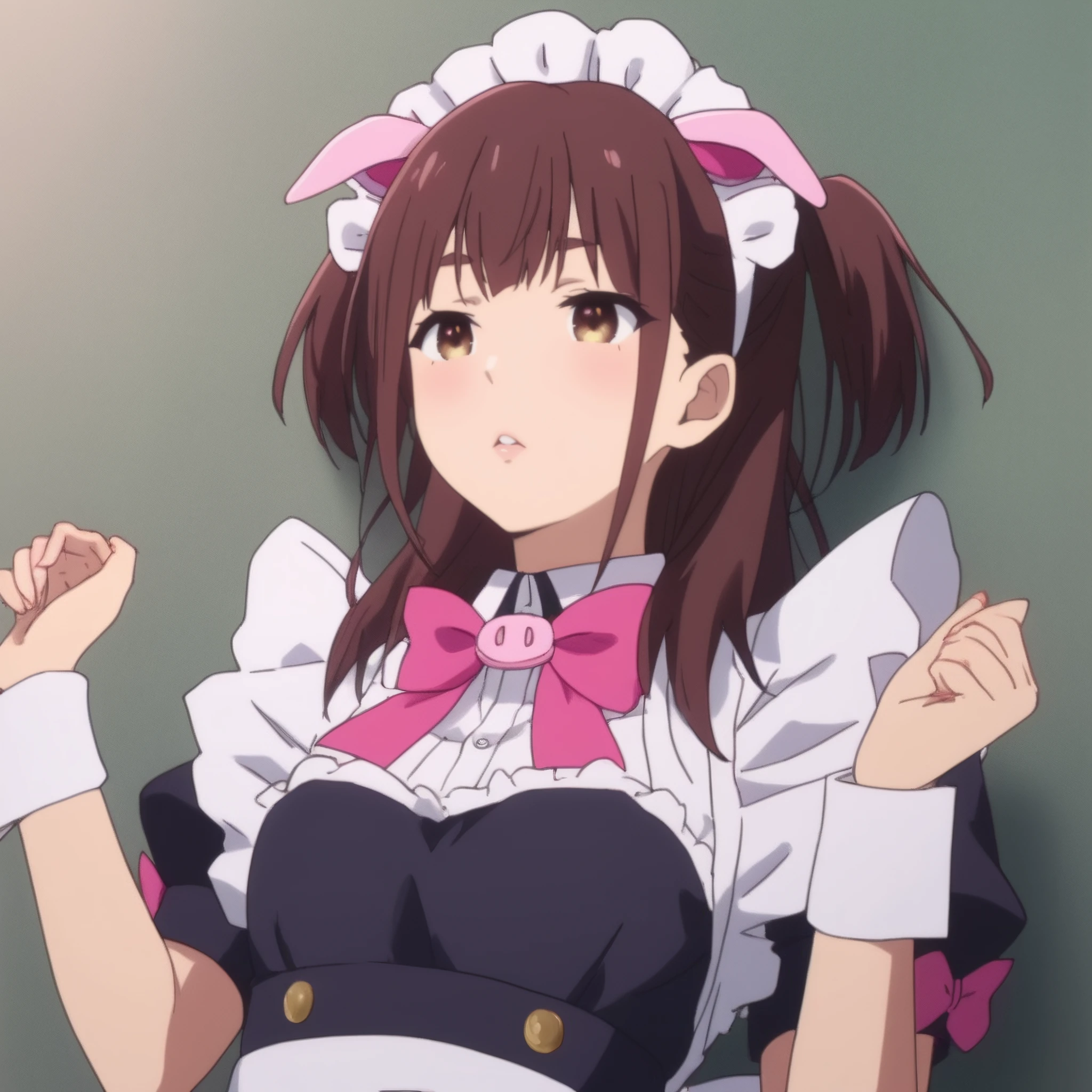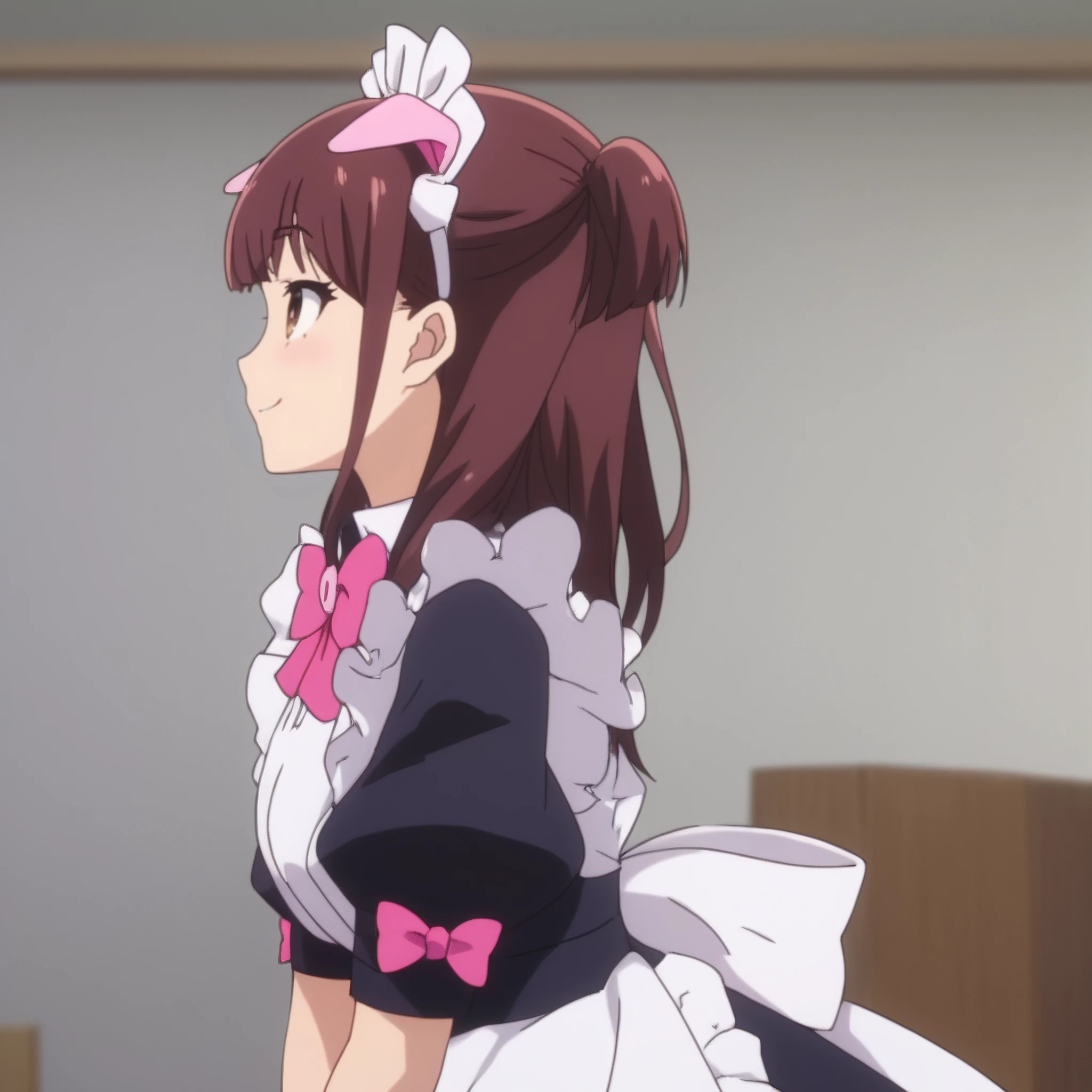 NagomiMaid, maid, maid headdress, bow, apron, maid apron, white apron, enmaided, pink bow, dress, frills, bowtie, frilled apron, two side up, puffy sleeves, pink bowtie, short sleeves, black dress,