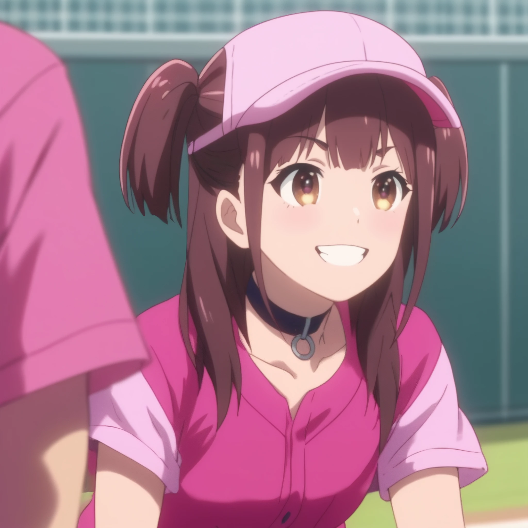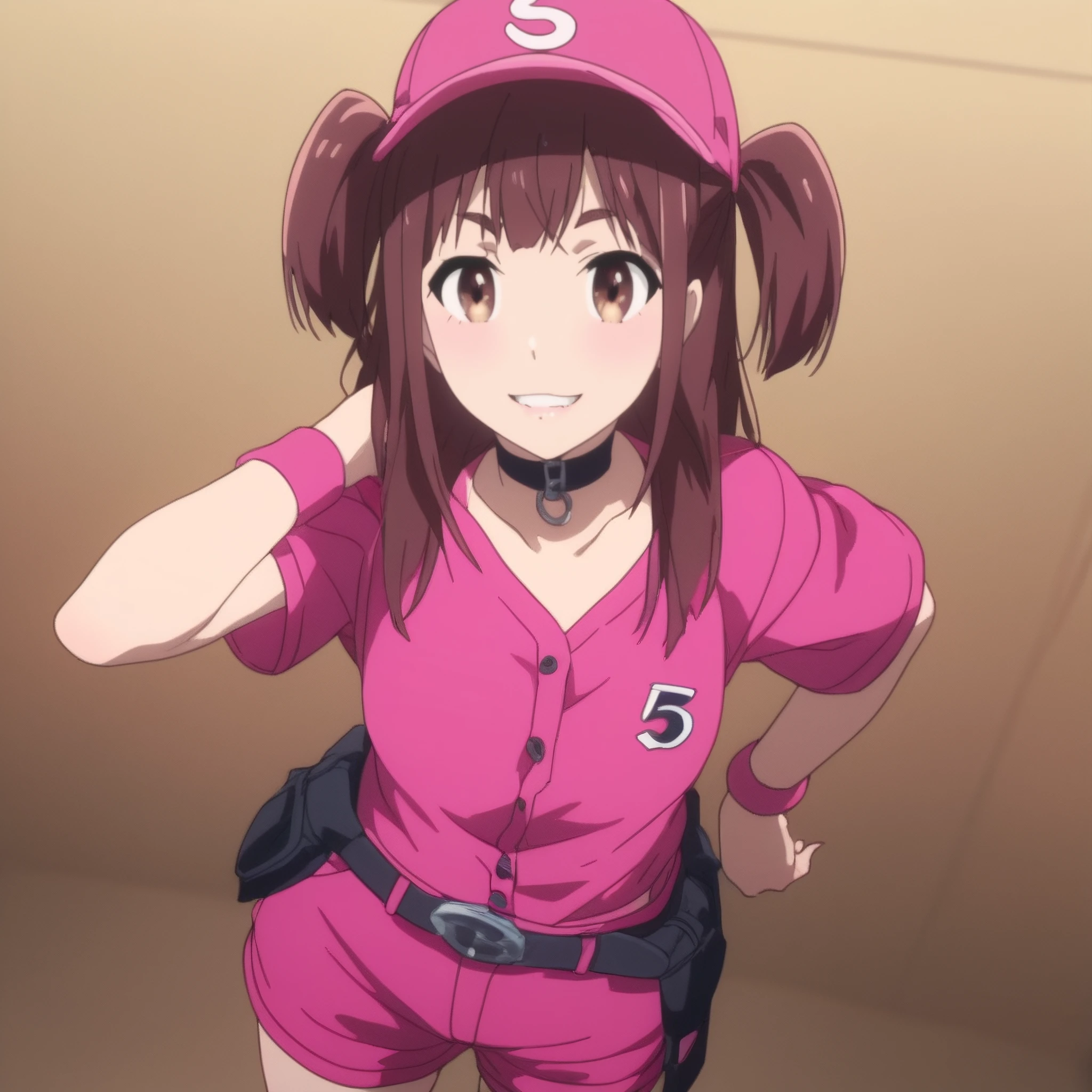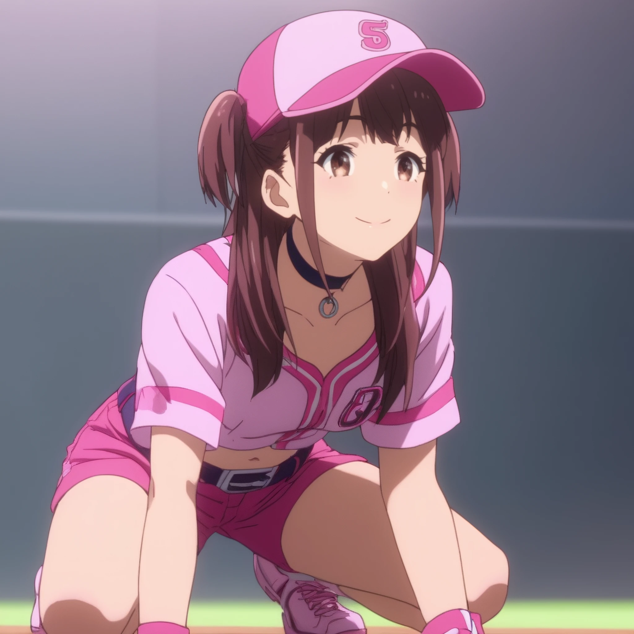 NagomiBaseball, hat, pink headwear, pink shirt, short sleeves, jacket, choker, collarbone, midriff, pink shorts, shirt, navel, belt, wristband,