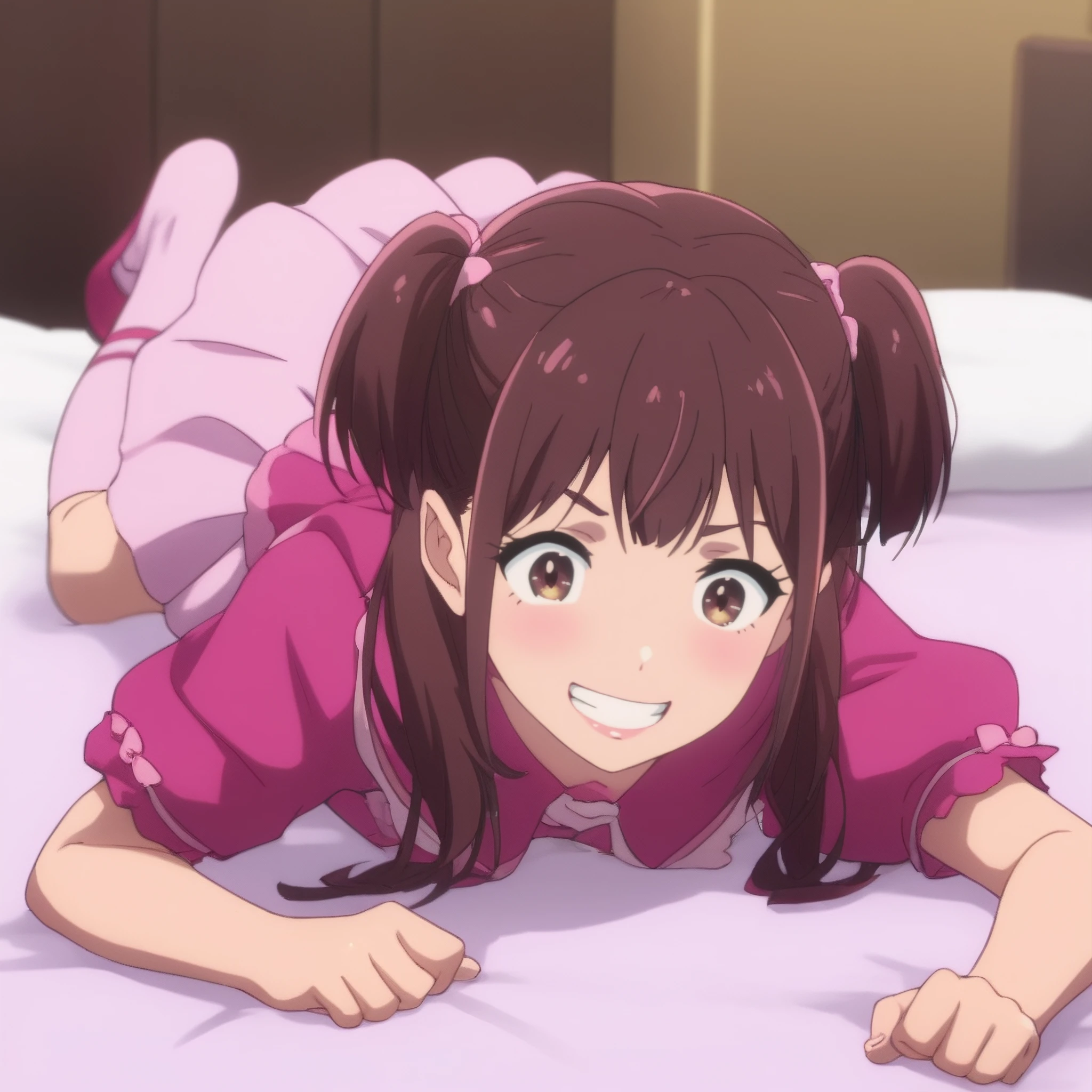 AMWNagomi, long hair, brown hair, brown eyes, bangs, eyebrows visible through hair, twintails,