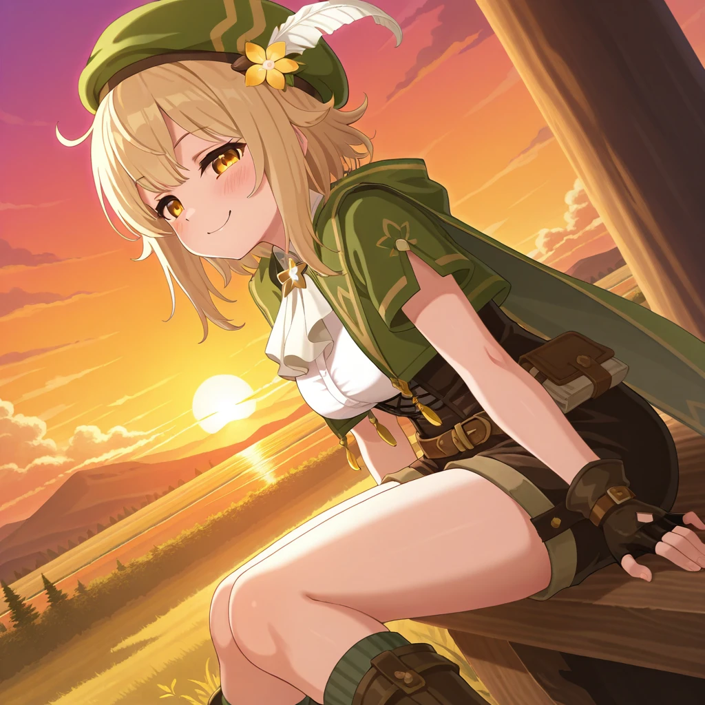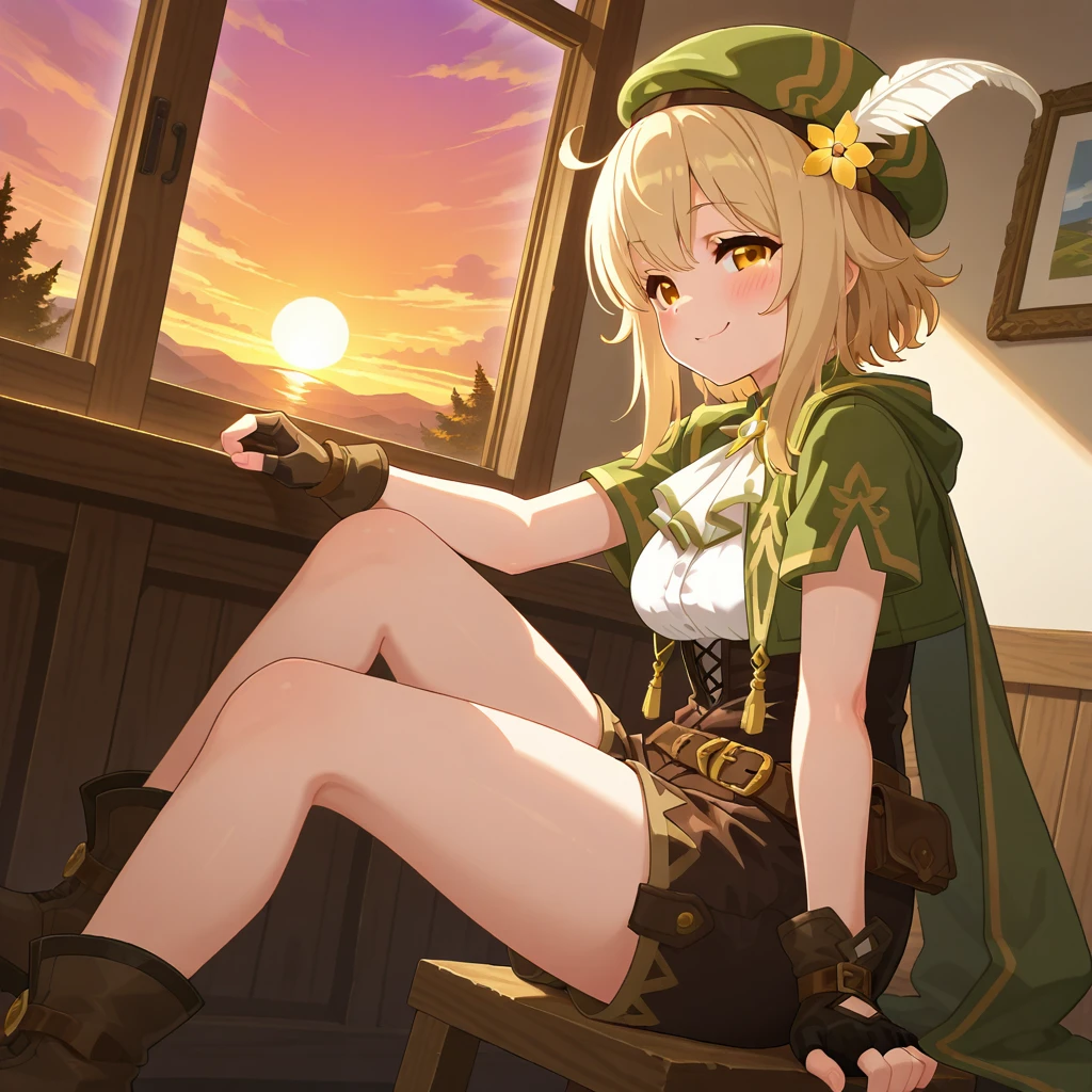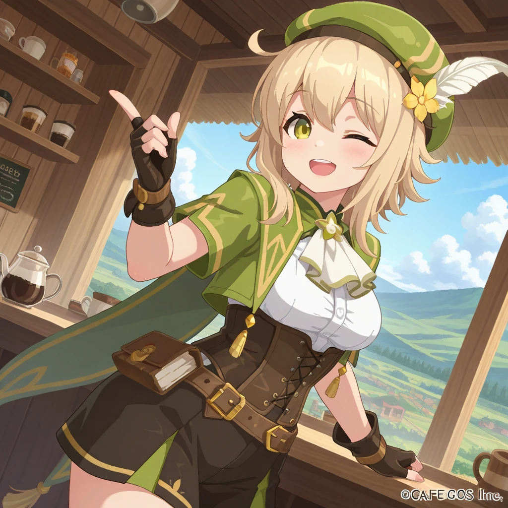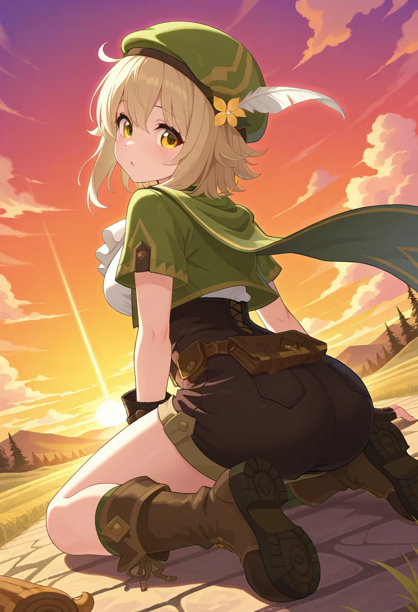 solo,beret feather, white ascot, green cropped jacket, green cape, fingerless gloves, white shirt, brown corsettyhose, brown boots,