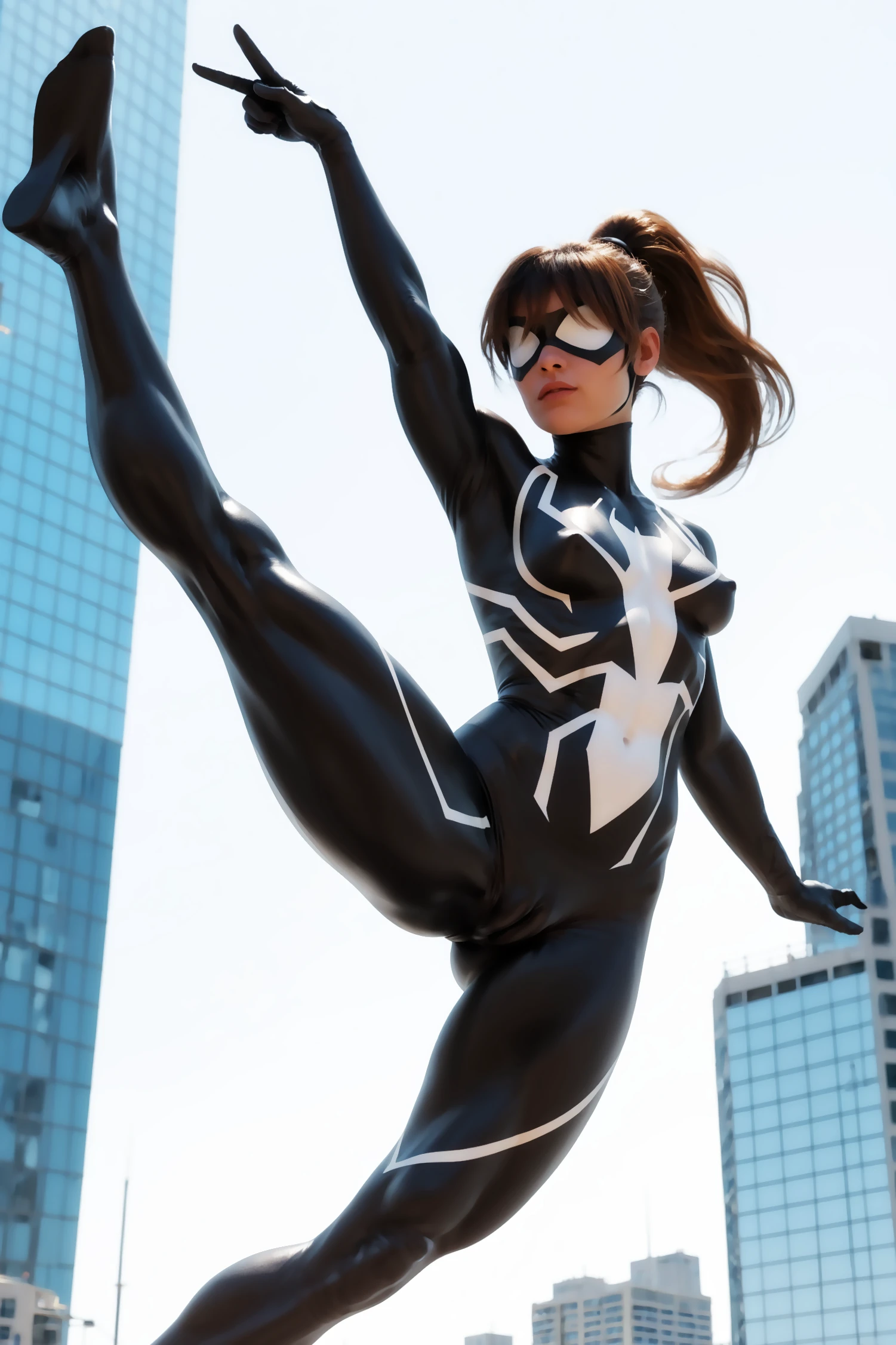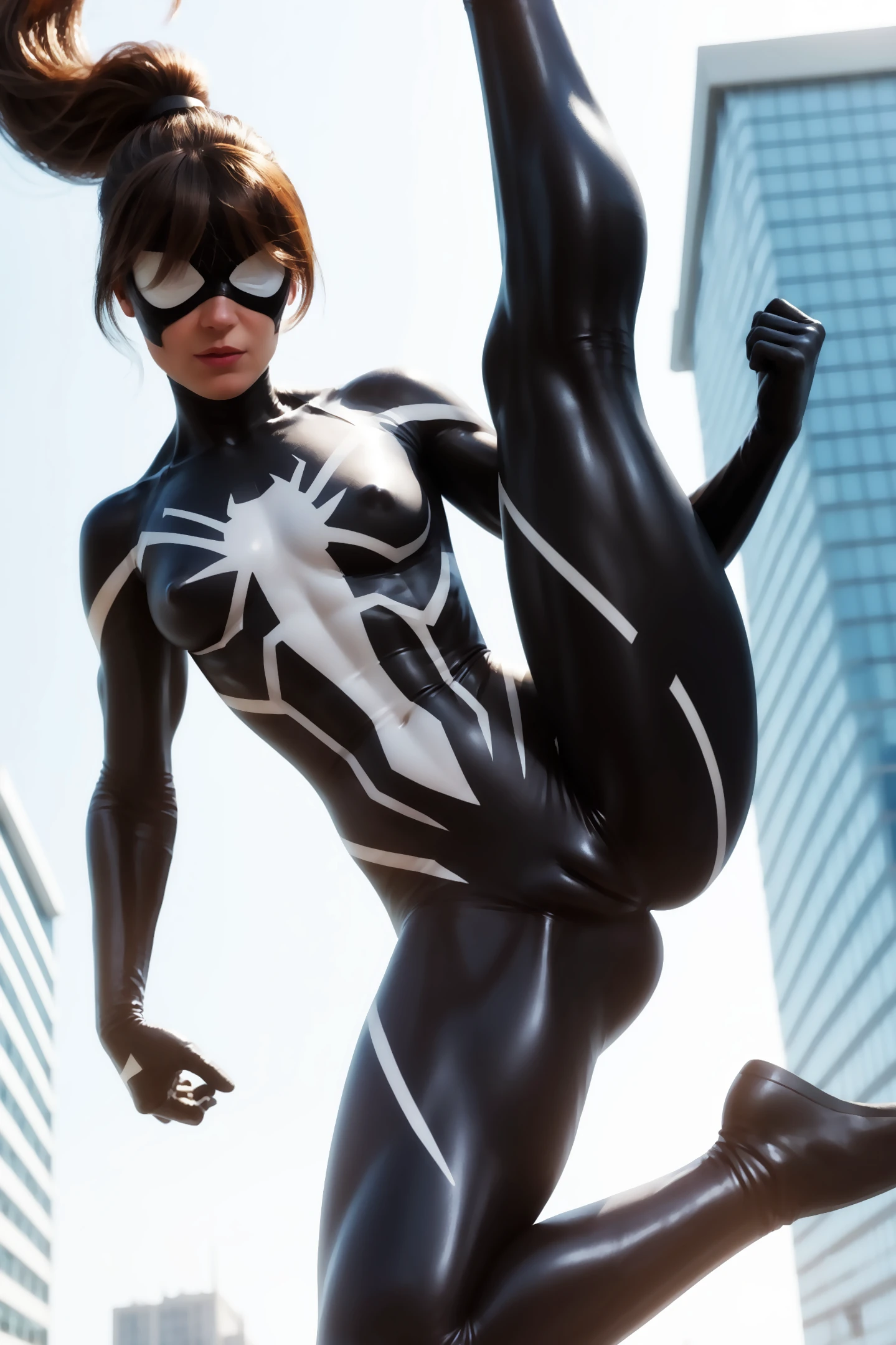 imtdanyasg, bodysuit, mask, brown hair, superhero, ponytail, long hair, covered eyes, domino mask, medium breast, skin tight, fit body