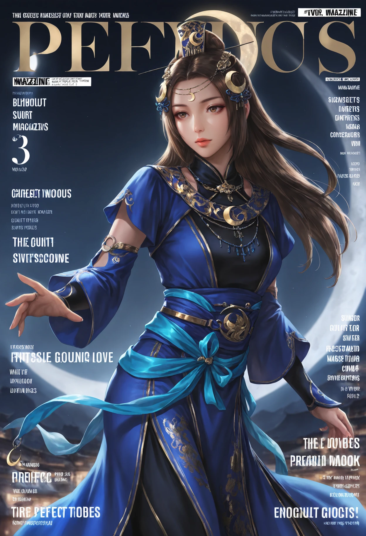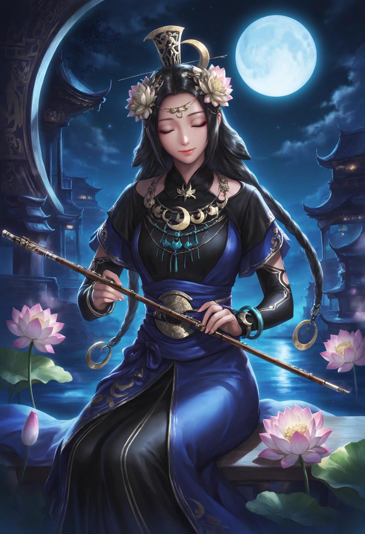 1girl,brown eyes,brown hair,black hair,long hair,headdress,hair ornament,crescent moon hair ornament