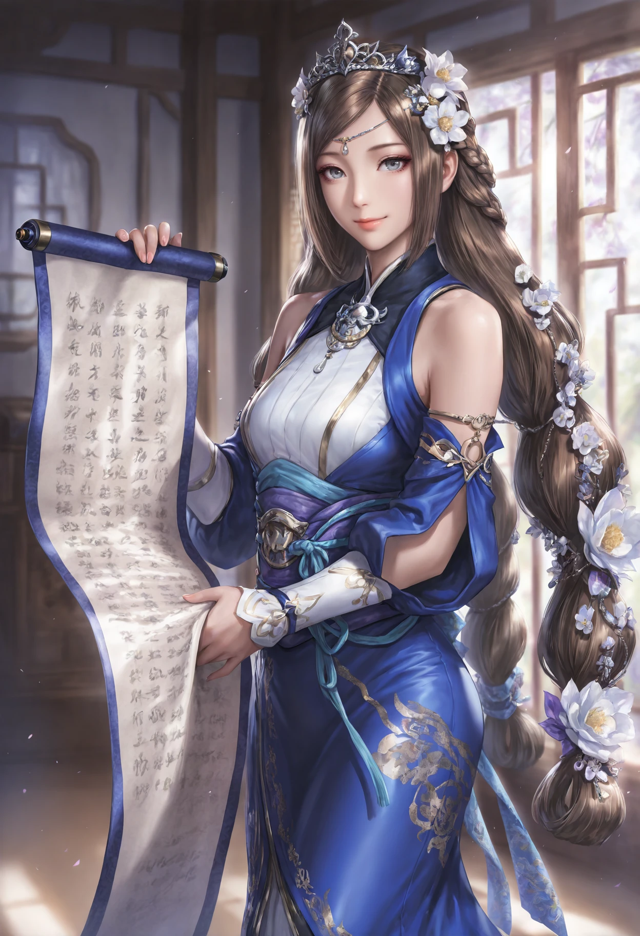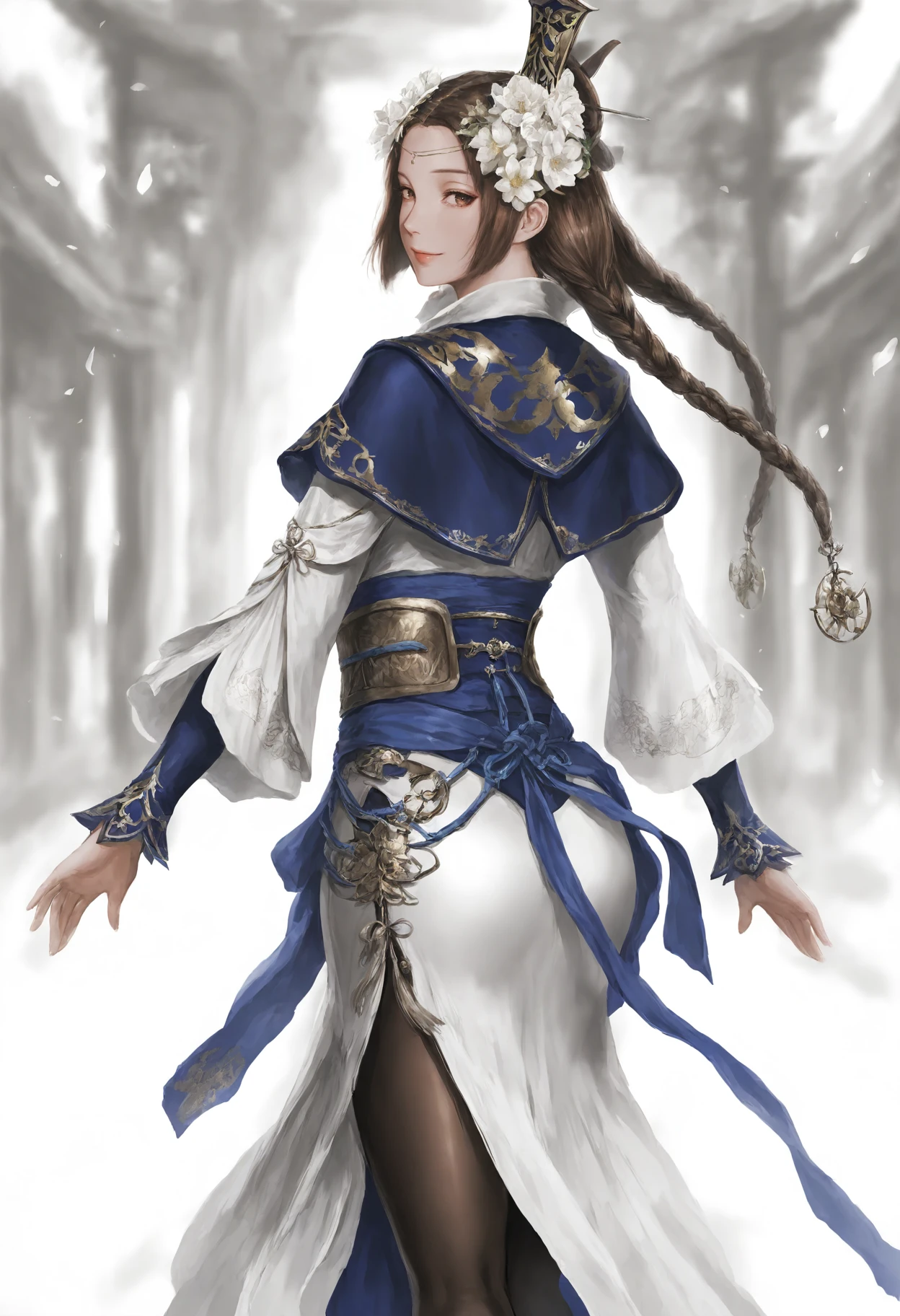 1girl,brown eyes,brown hair,long hair,braid,single braid,hair ornament,headdress,hat