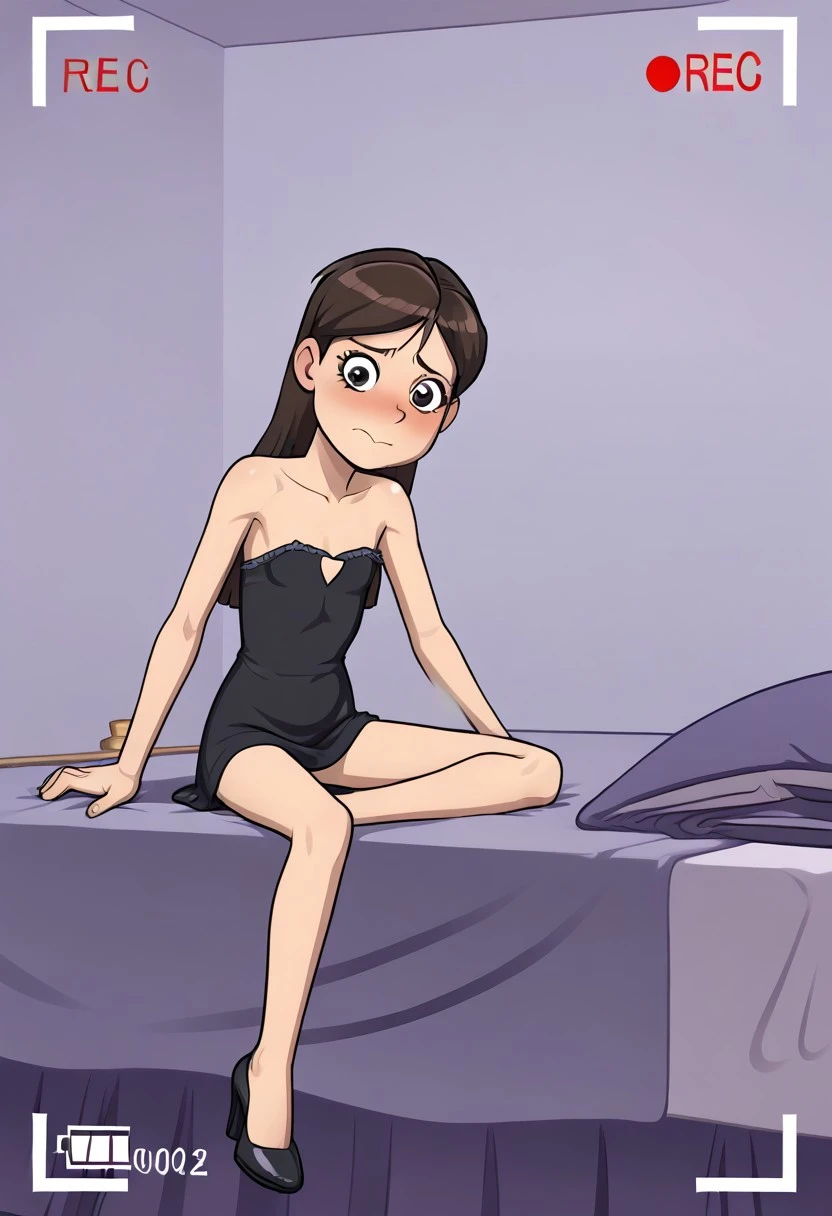 black hair, long hair, 1girl, short minidress, white socks, brown footwear,