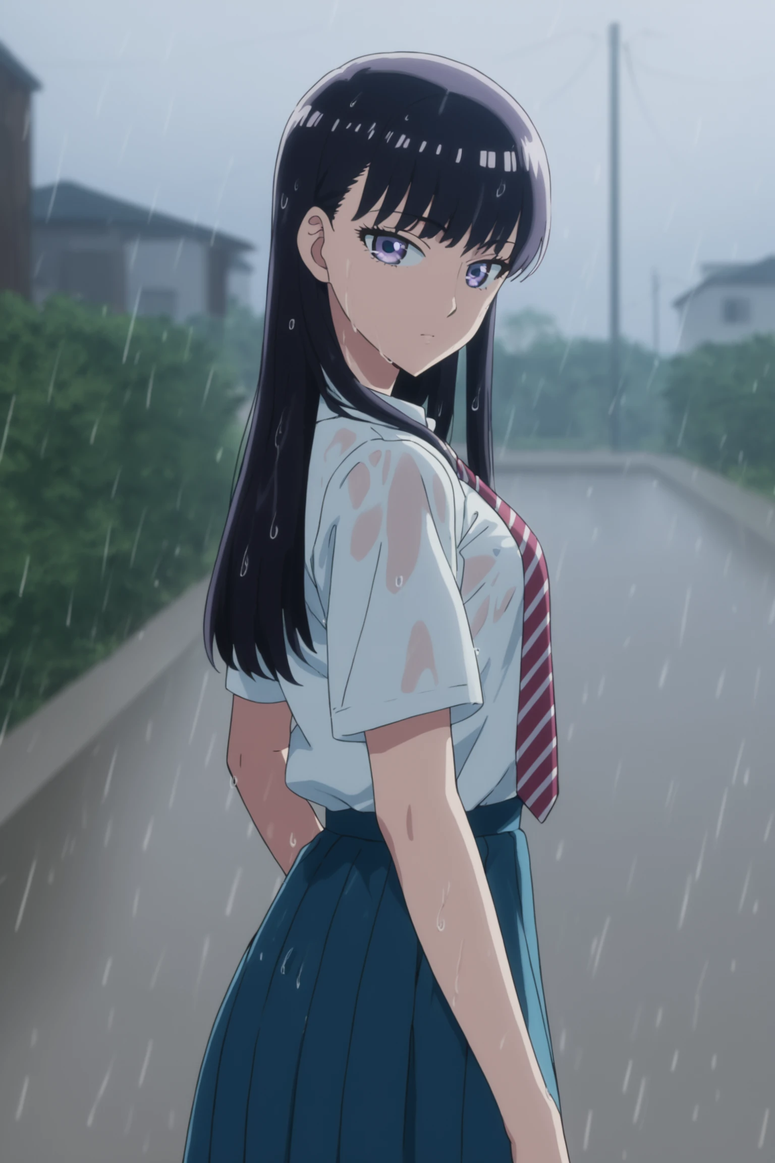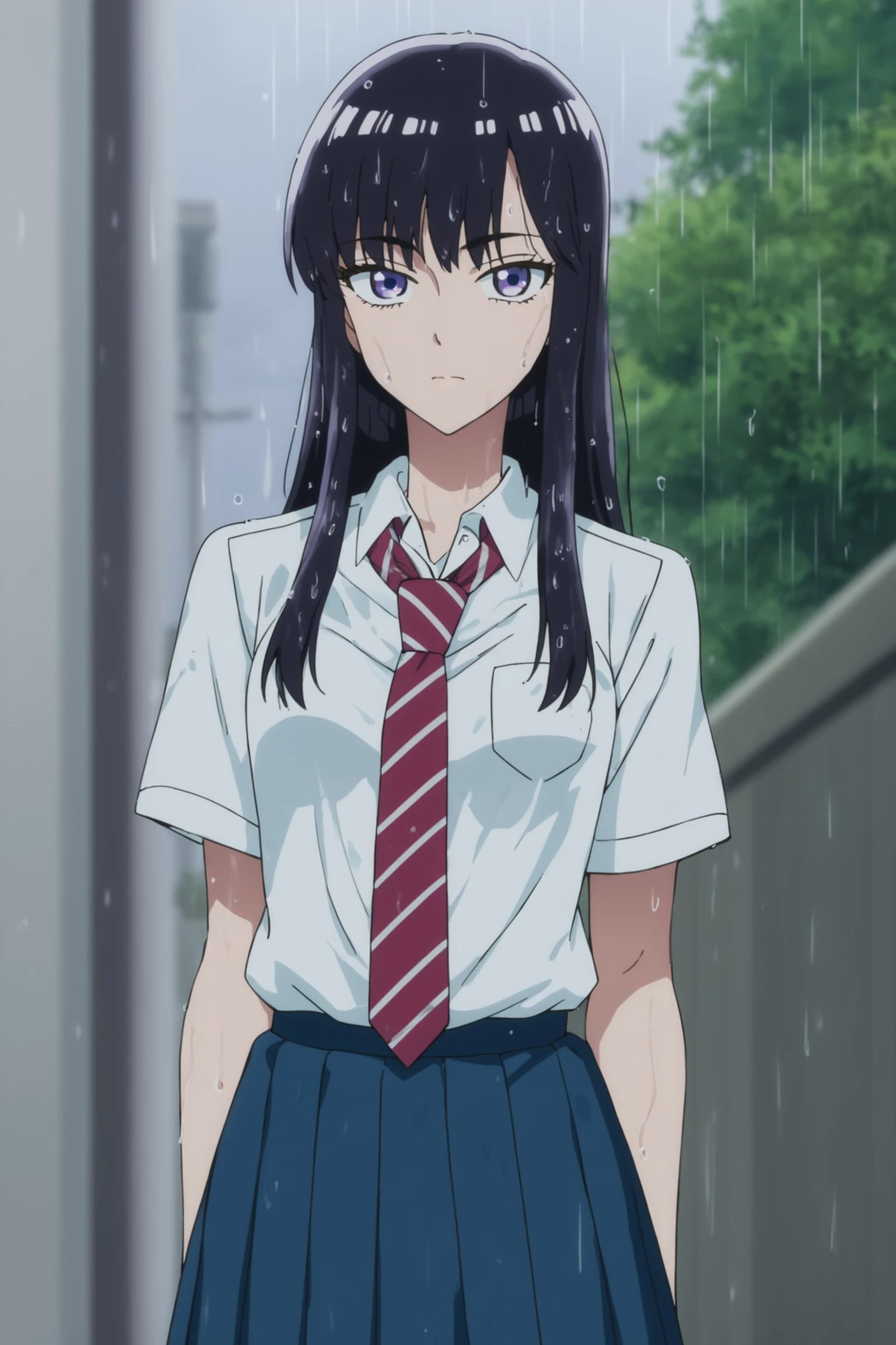 school uniform (summer) - tachibana akira, long hair, black hair, purple eyes, tachibanaschool, school uniform, white shirt, collared shirt, short sleeves, red necktie, striped necktie, pleated skirt, blue skirt, black kneehighs, loafers