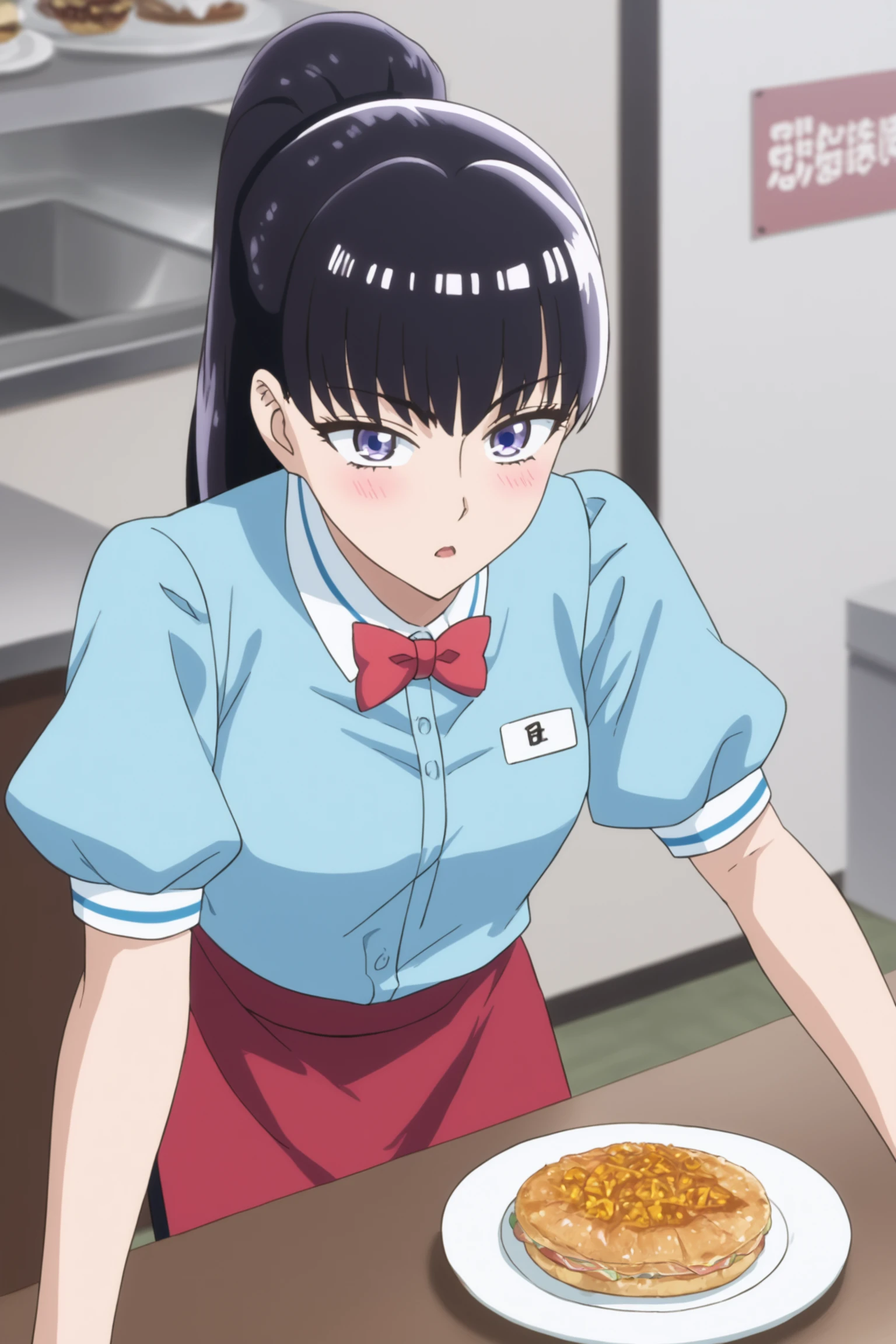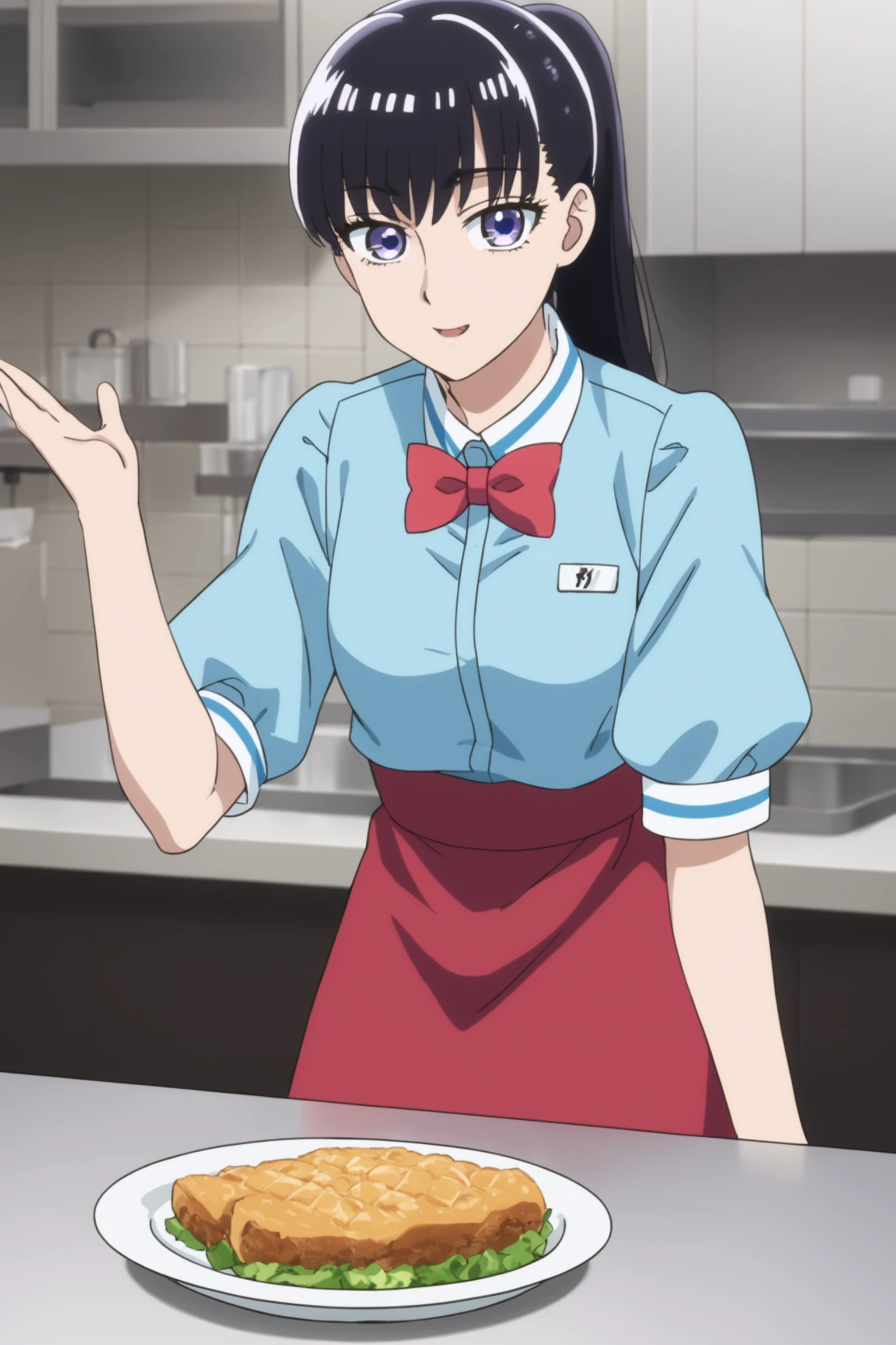waitress - tachibana akira, long hair, black hair, ponytails, purple eyes, tachibawaitress, blue shirt, white collar, red bowtie, short sleeves, puffy short sleeves, black skirt, red apron, white kneehighs, loafers