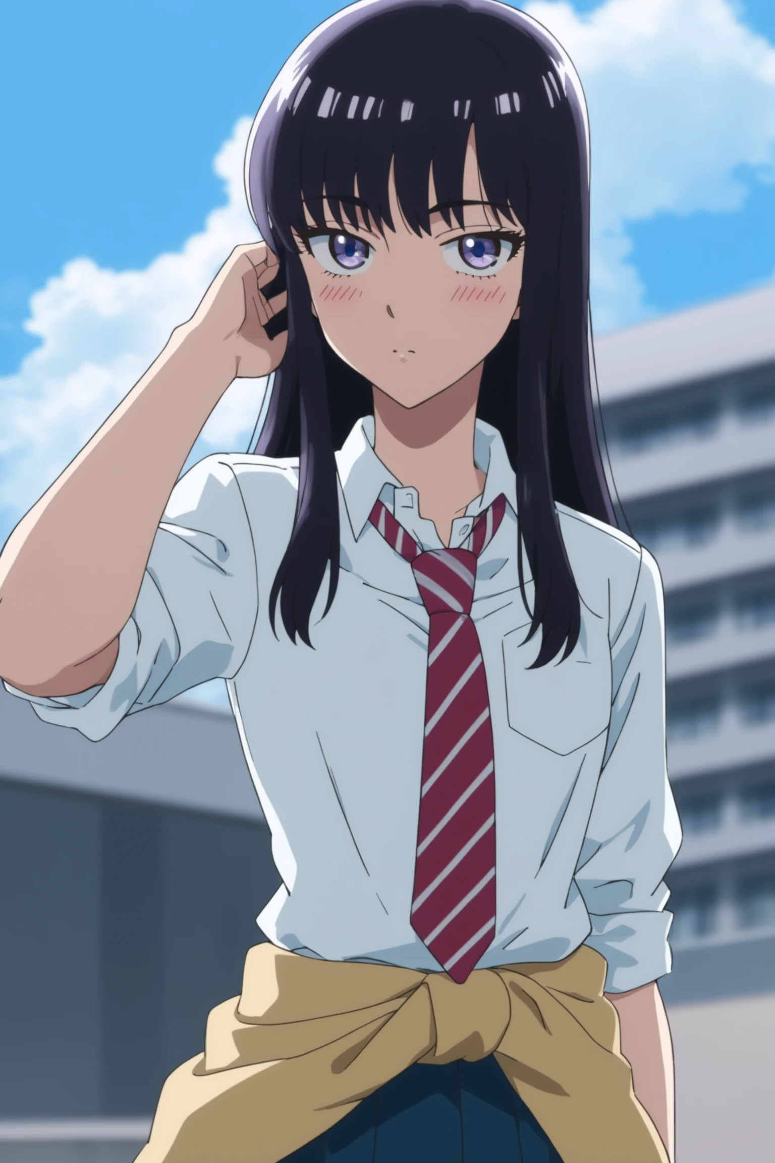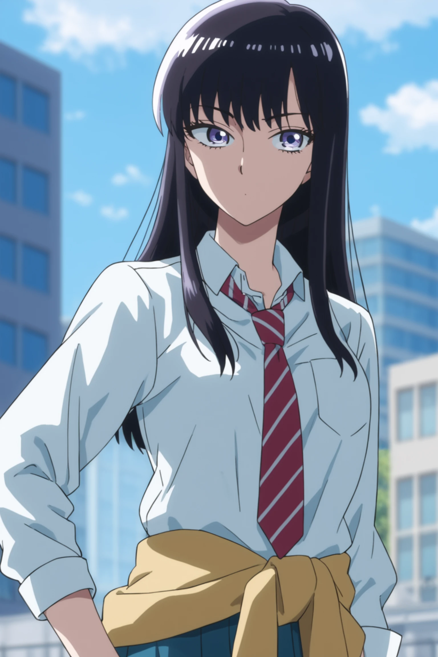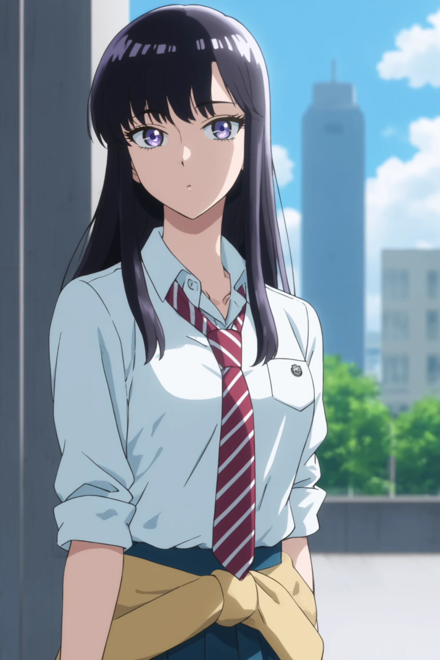 school uniform (spring) - tachibana akira, long hair, black hair, purple eyes, tachibanaschool, school uniform, white shirt, collared shirt, sleeves rolled up, red necktie, striped necktie, clothes around waist, yellow sweater around waist, pleated skirt, blue skirt, black kneehighs, loafers