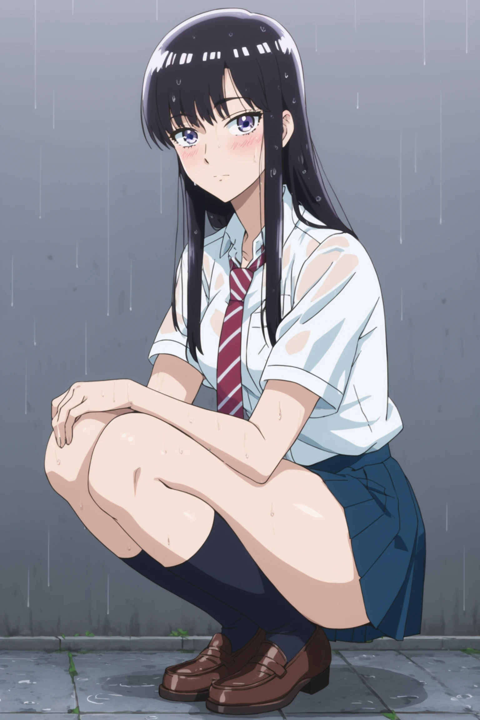 tachibanaschool, school uniform, white shirt, collared shirt, short sleeves, red necktie, striped necktie, pleated skirt, blue skirt, black kneehighs, loafers