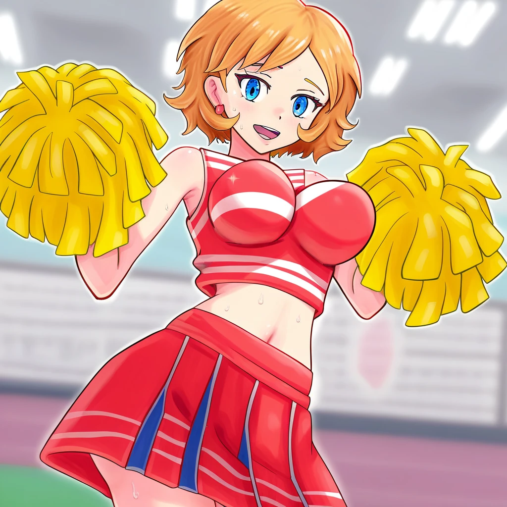 cheerleader, pom pom (cheerleading), navel, skirt, jewelry, earrings, red skirt, shirt, bangs, holding pom poms, sleeveless, sleeveless shirt, midriff, crop top