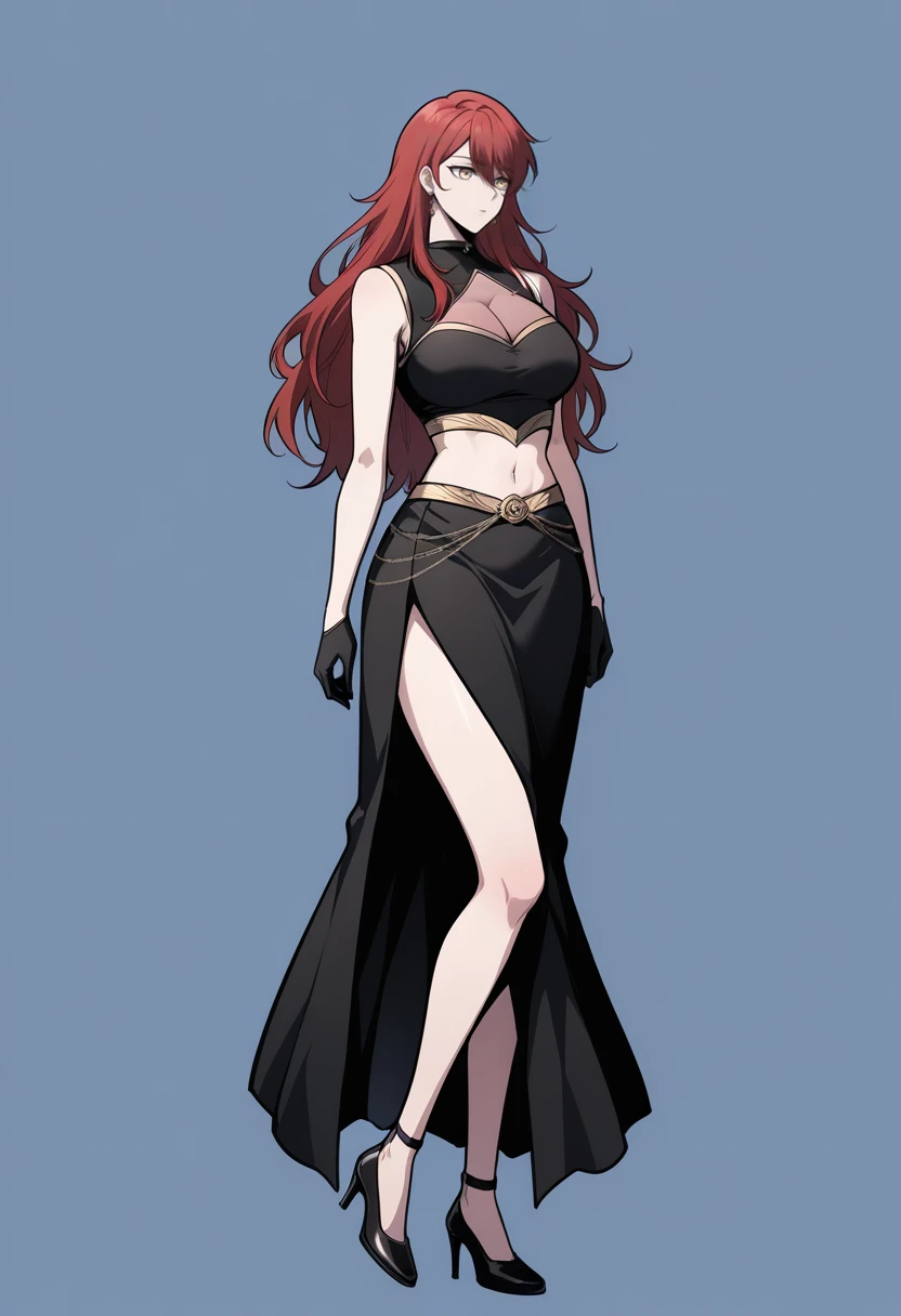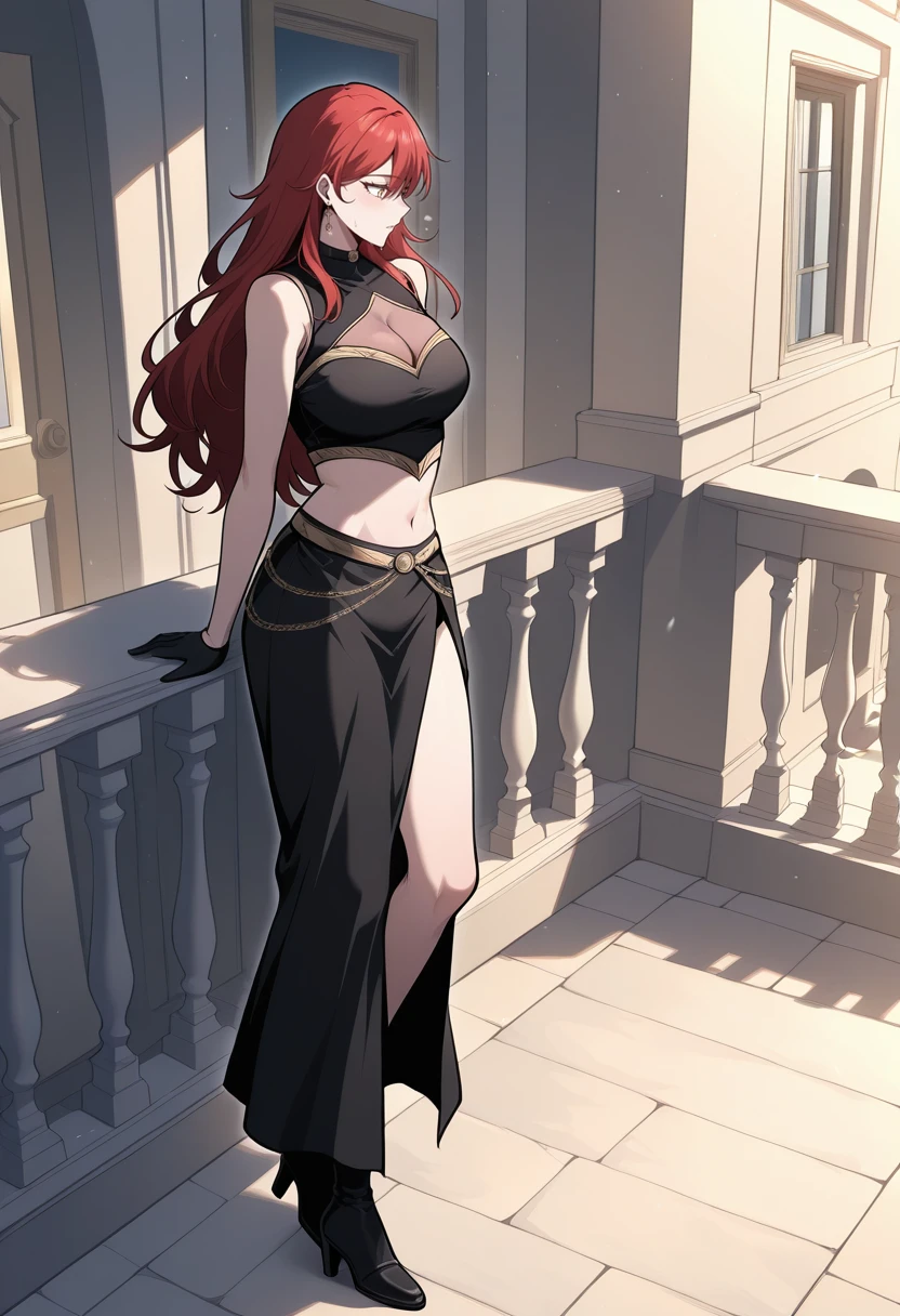KKay, 1girl, solo, long hair, red hair, yellow eyes, earrings, casual_outfit, black dress, black gloves, cleavage, cleavage cutout, clothing cutout, sleeveless, shoulders, midriff, navel, side slit, black high heel boots,