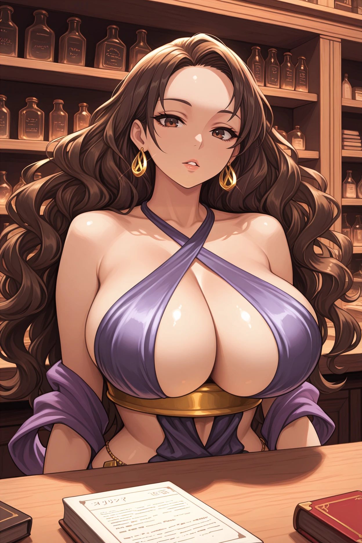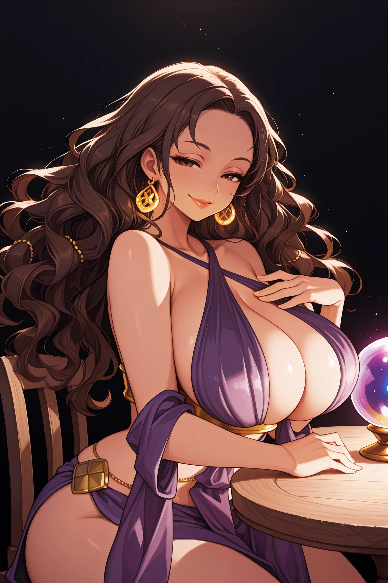 Add "gold earrings, criss-cross halter, halter dress, purple dress, center opening, cleavage, gold underbust, purple shawl, pelvic curtain" for her typical look.