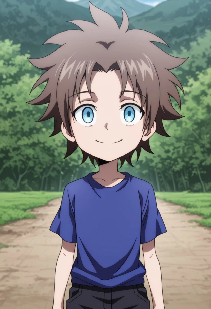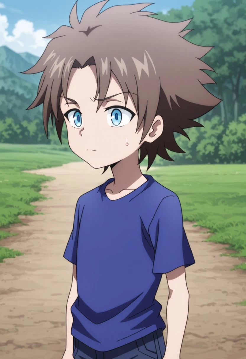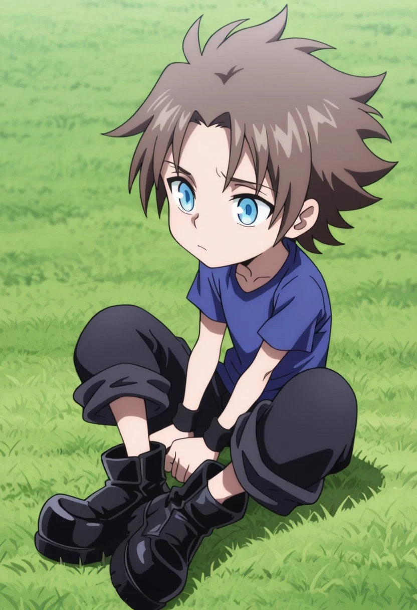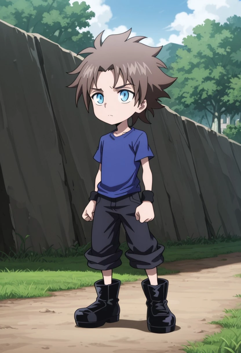 kurMuntz, 1boy, male focus, solo, blue eyes, brown hair, blue shirt, t-shirt, wristband, black pants, pants rolled up, boots, black footwear,
