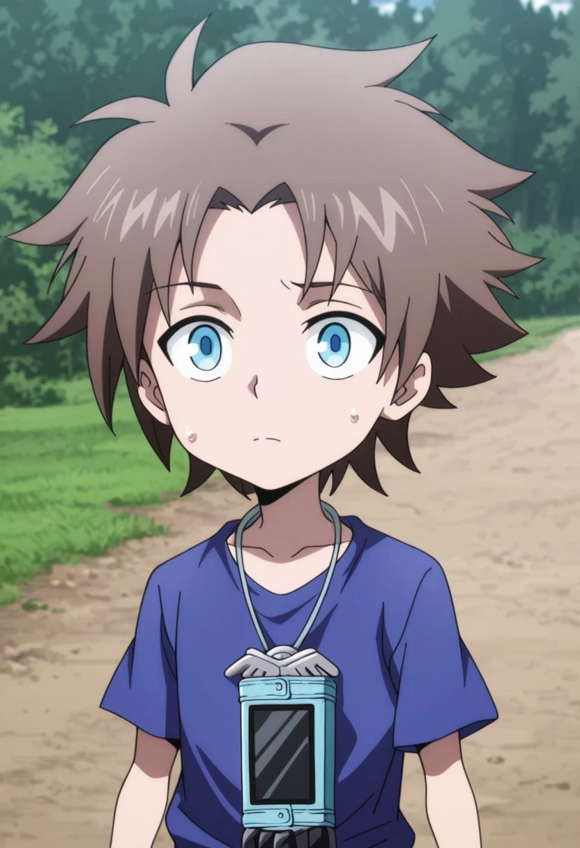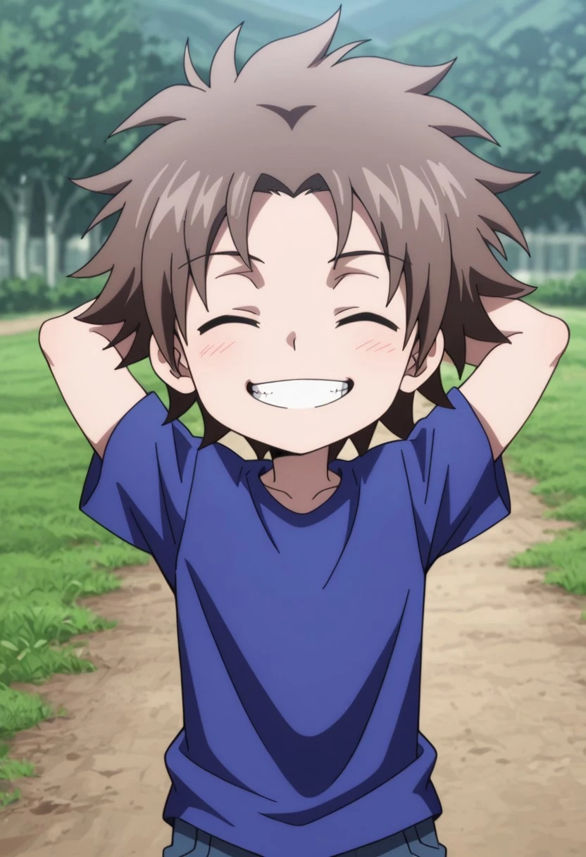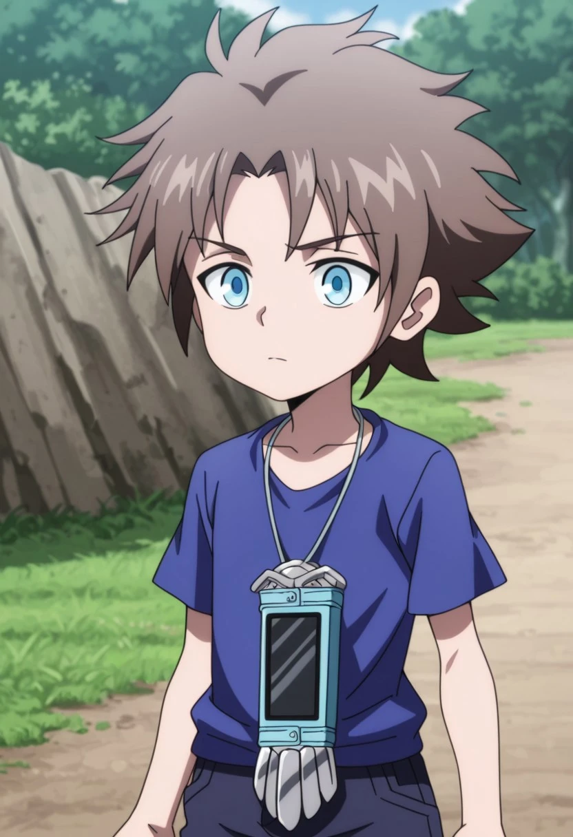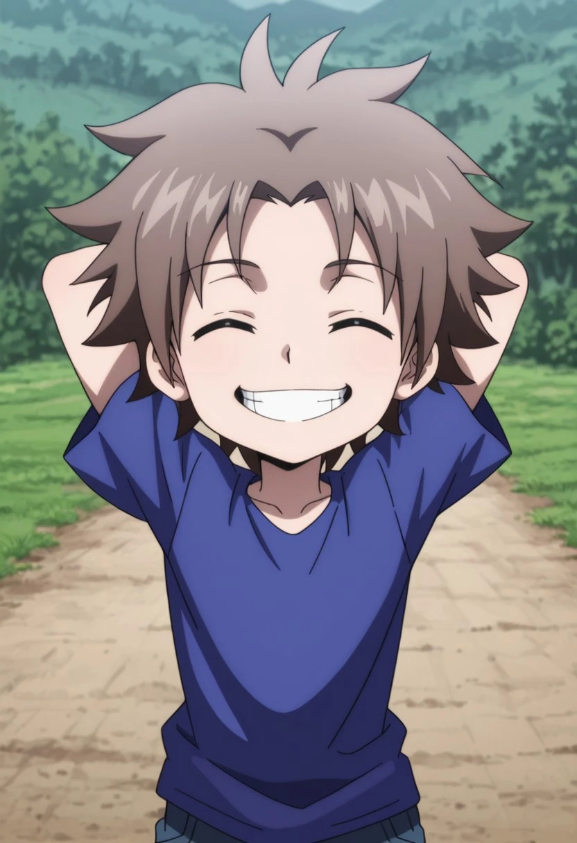 kurMuntz, 1boy, male focus, solo, blue eyes, brown hair, blue shirt, t-shirt, wristband, black pants, pants rolled up, boots, black footwear,