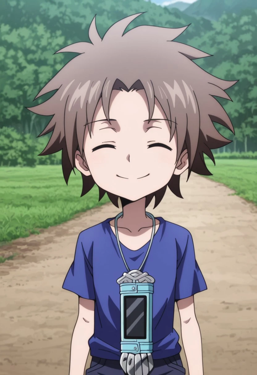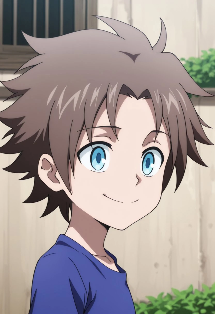 kurMuntz, 1boy, male focus, solo, aged up, blue eyes, brown hair, sidelocks, purple shirt, collared shirt, short sleeves, black apron, blue pants, sandals,