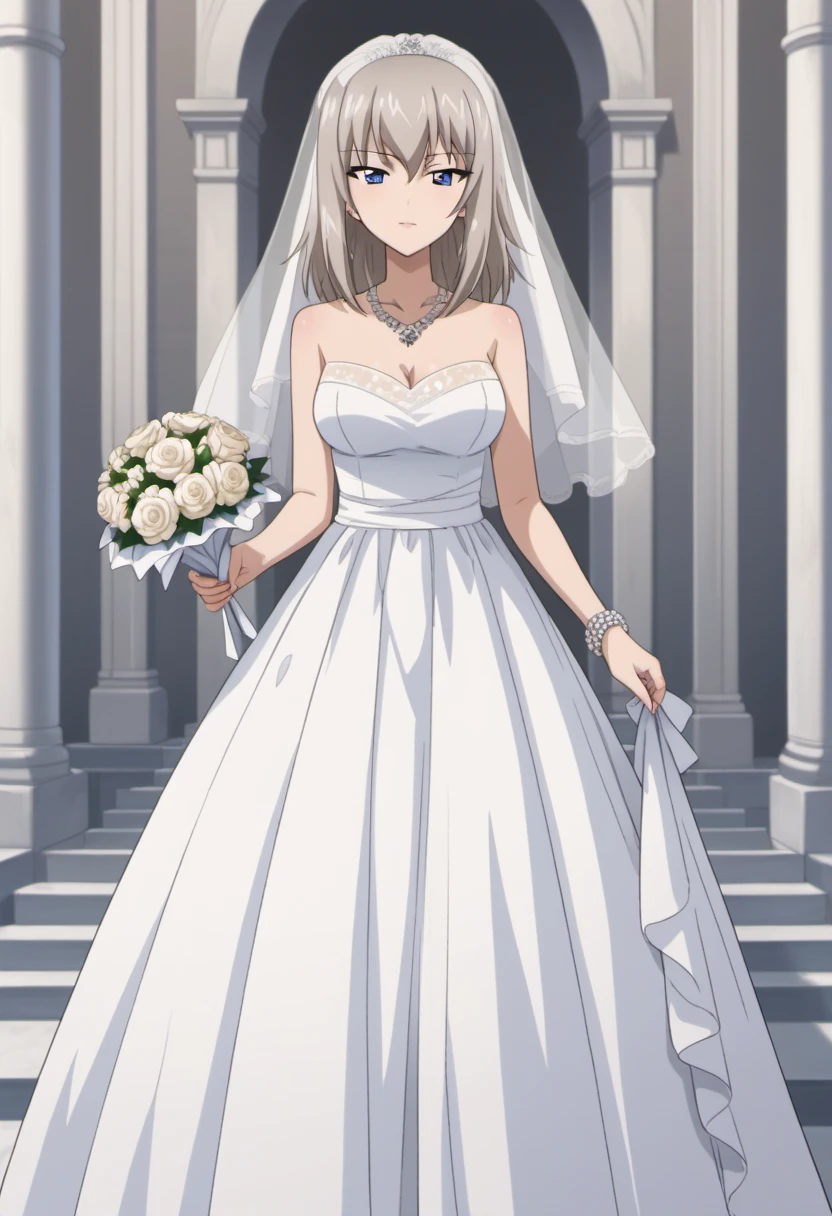 Trigger Words: itsumi erika, medium hair, grey hair, blue eyes
