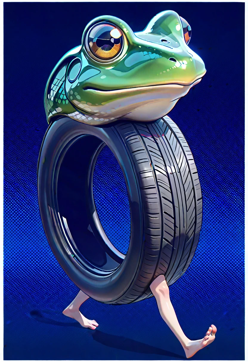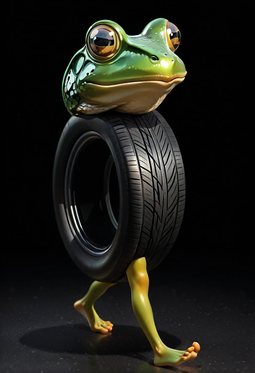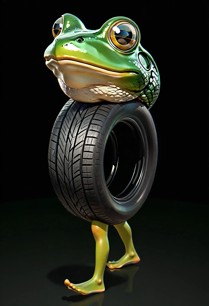 BonecaAmbalabu, surreal, black tire body, human legs, large frog head, black eyes, yellow sclera, organic and mechanical elements,