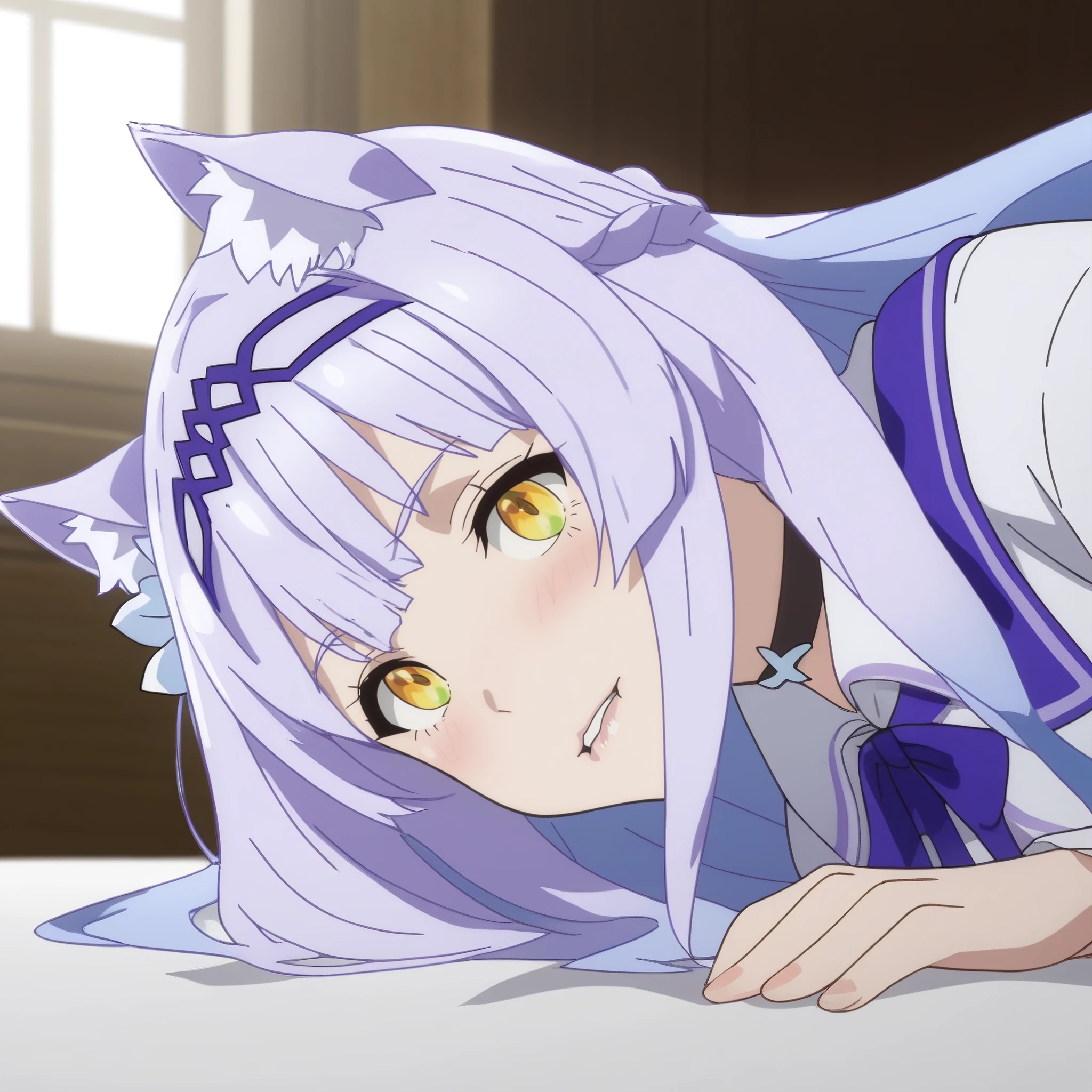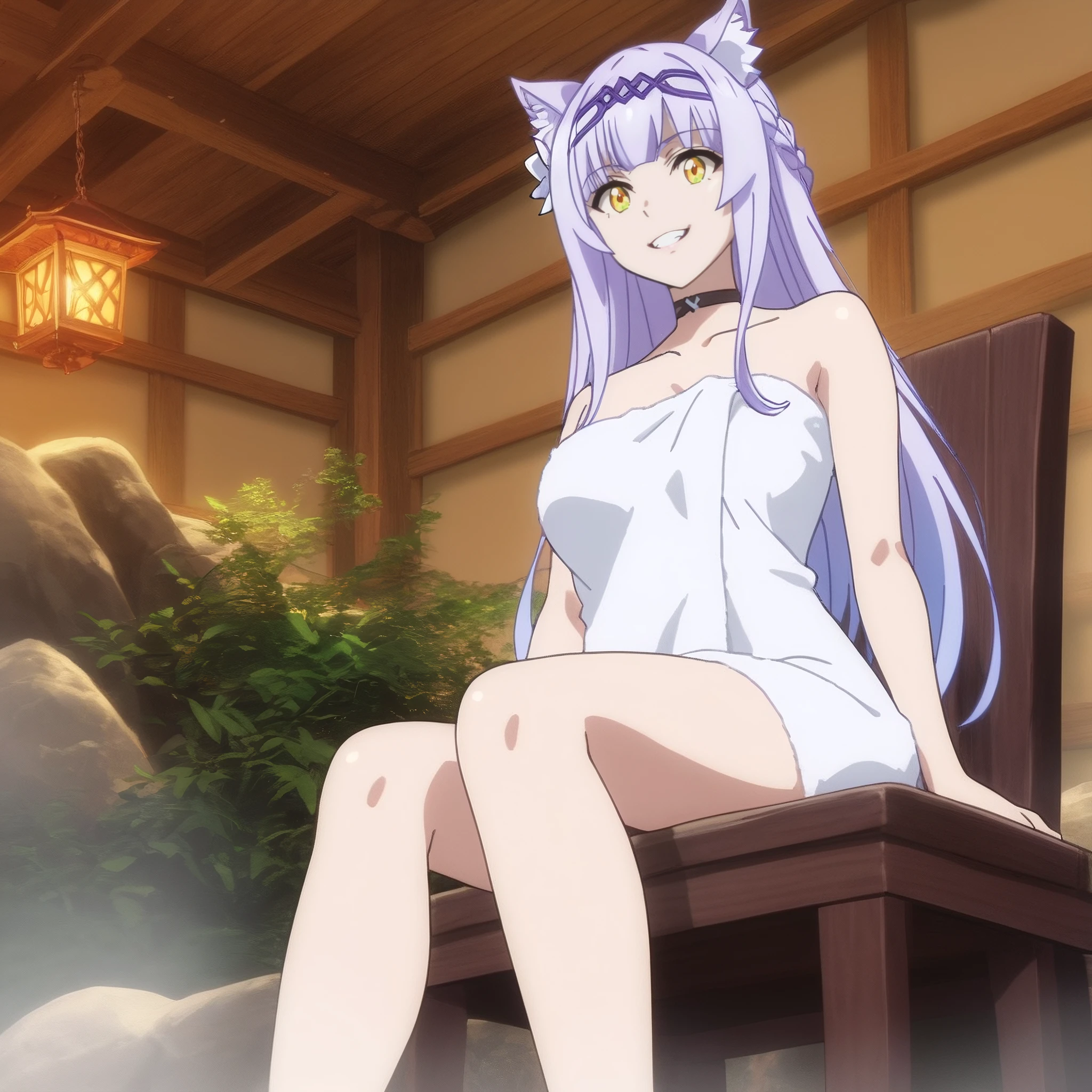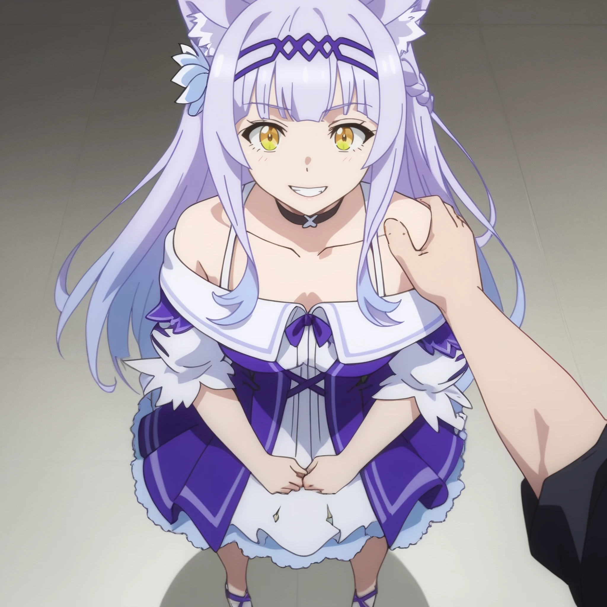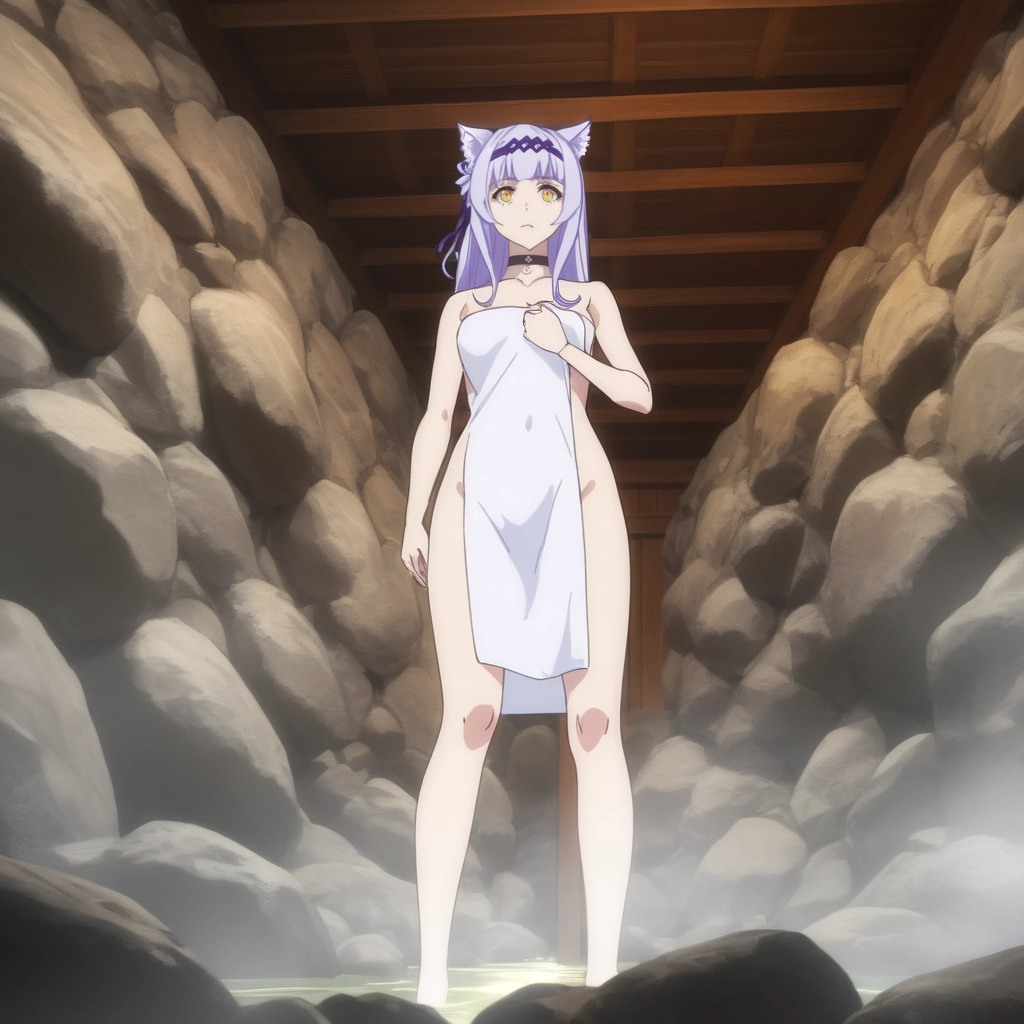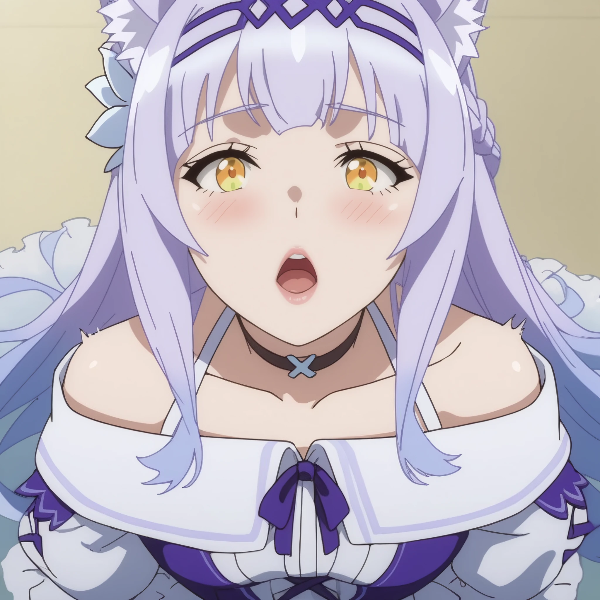 SRAClaire, purple hair, long hair, animal ears, black choker, yellow eyes, hairband, cat ears, animal ear fluff, hair ornament, white hair flower, braid, hair ribbon, sidelocks,