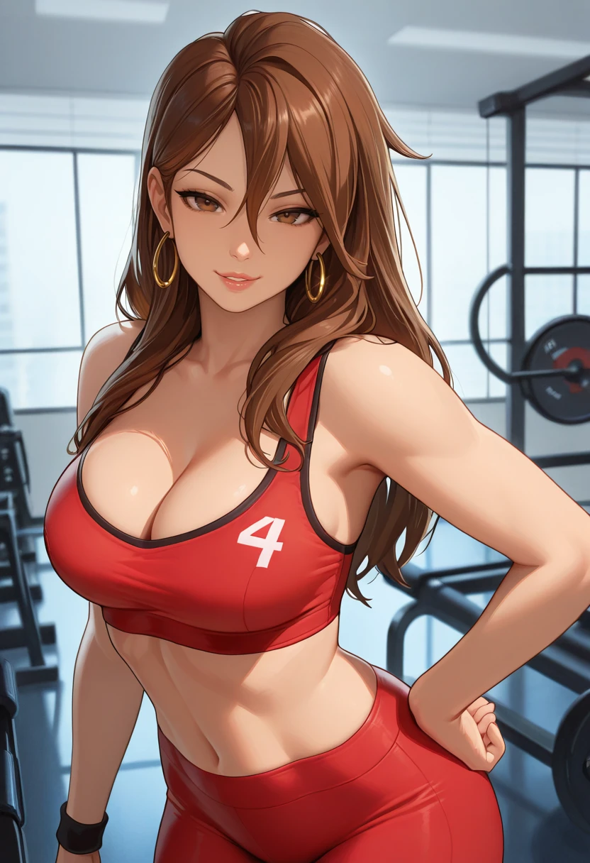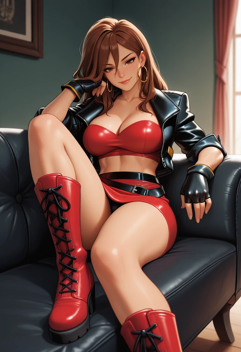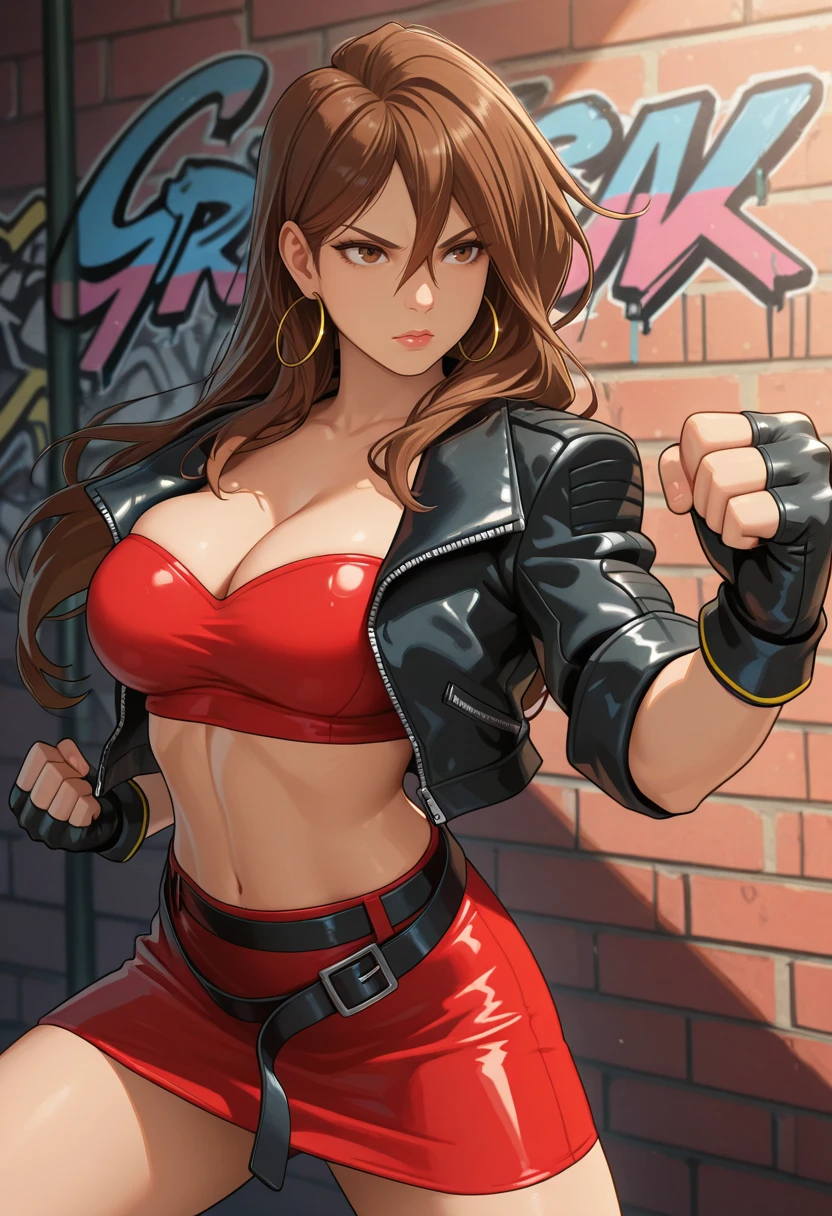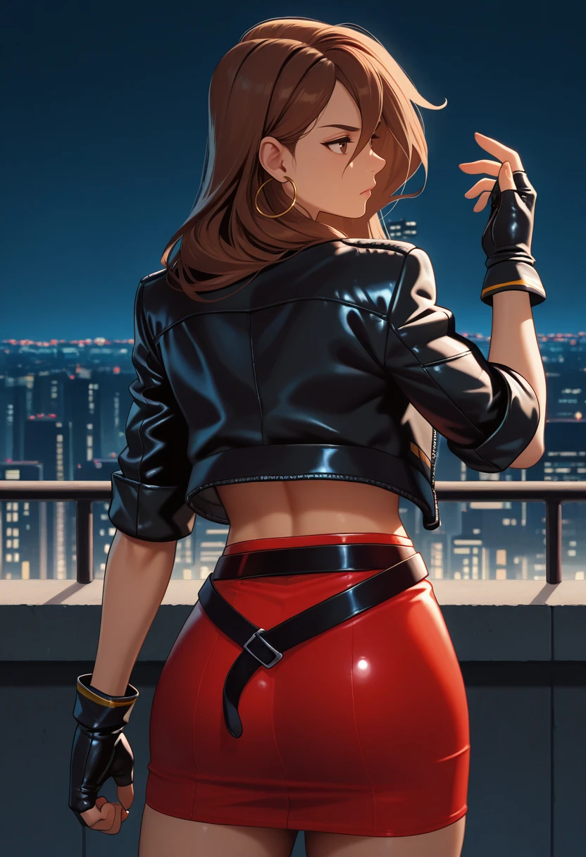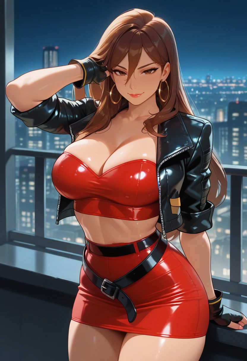 BL4ZF1LD, brown hair, long hair,hair between eyes, hoop earrings, brown eyes, black leather jacket, cropped jacket, sleeves rolled up, red crop top, red pencil skirt, belt, fingerless gloves,