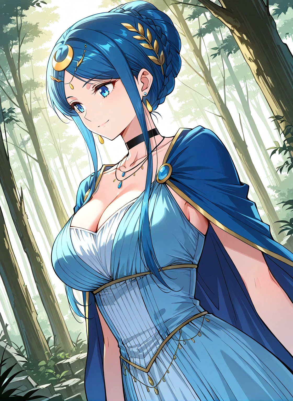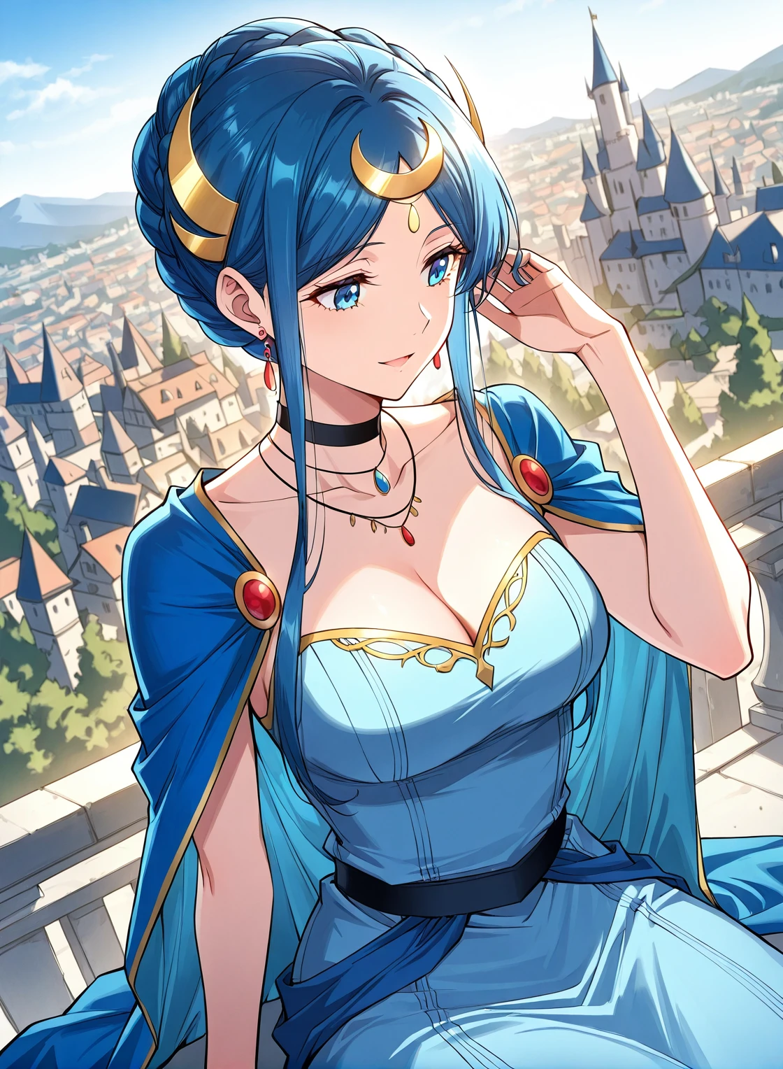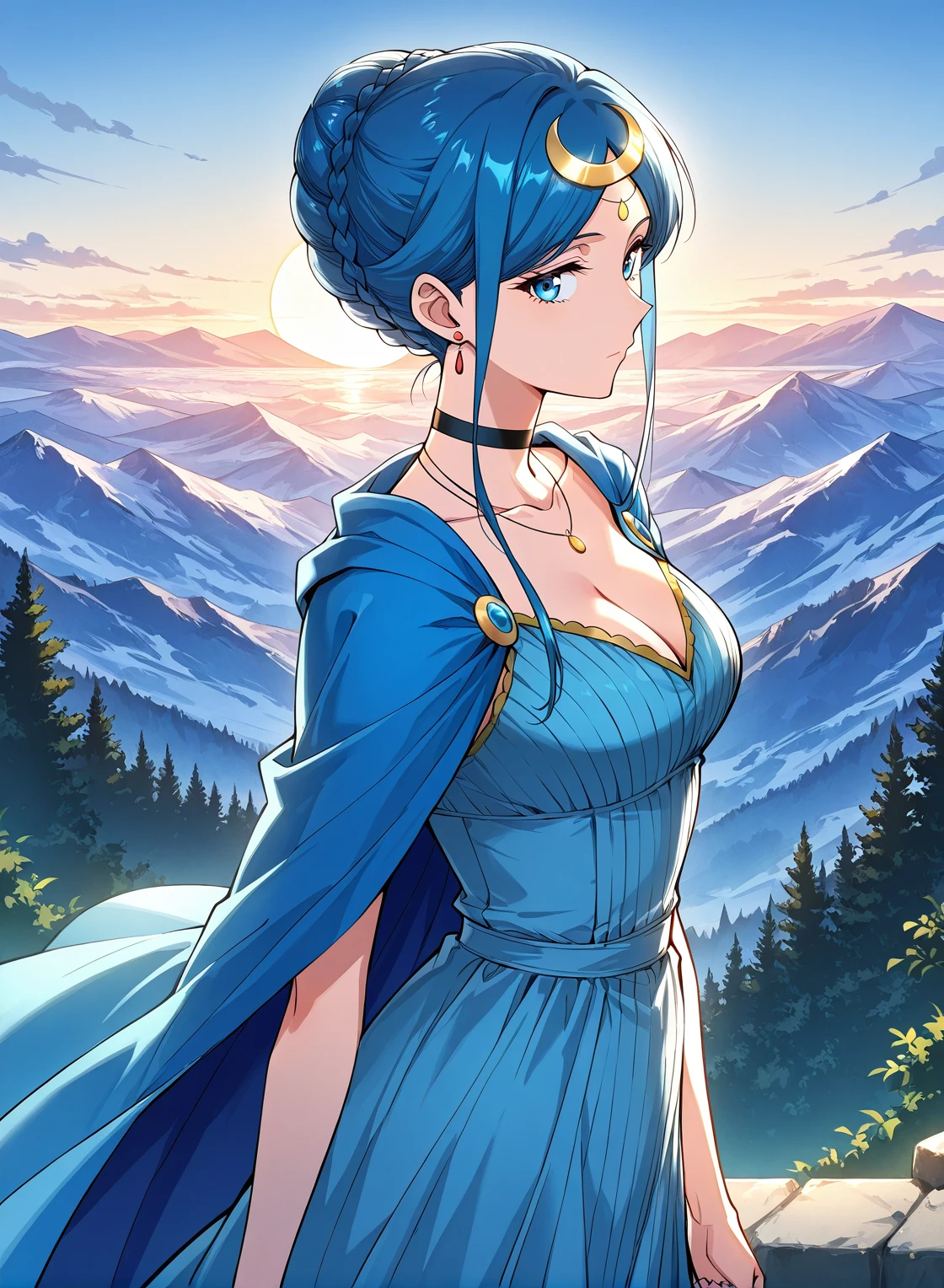 blue dress, jewelry, earrings, hair ornament, black choker, cleavage, sidelocks, crescent hair ornament, bracelete, necklace, blue cape, collarbone