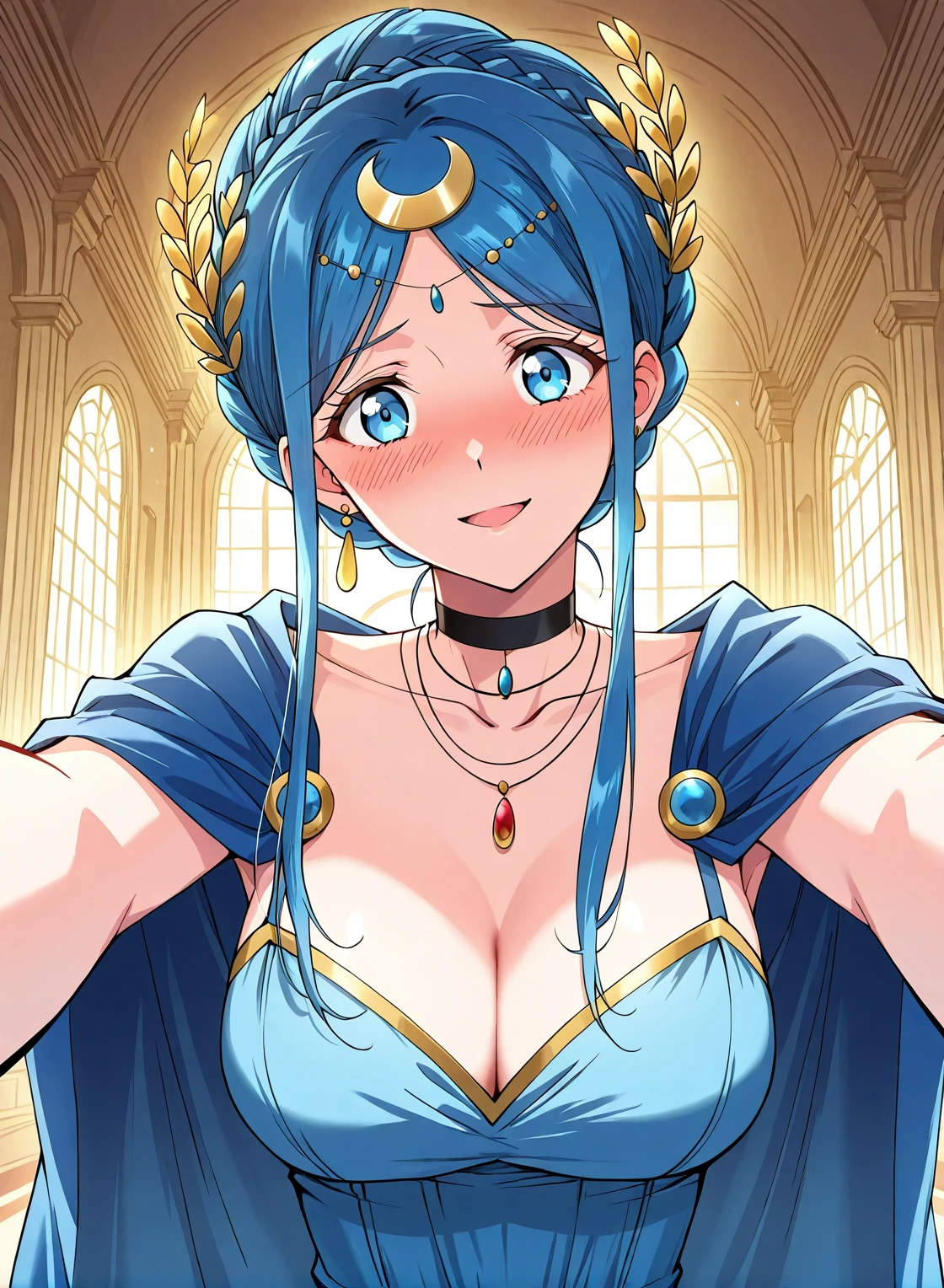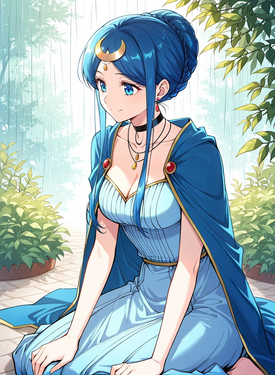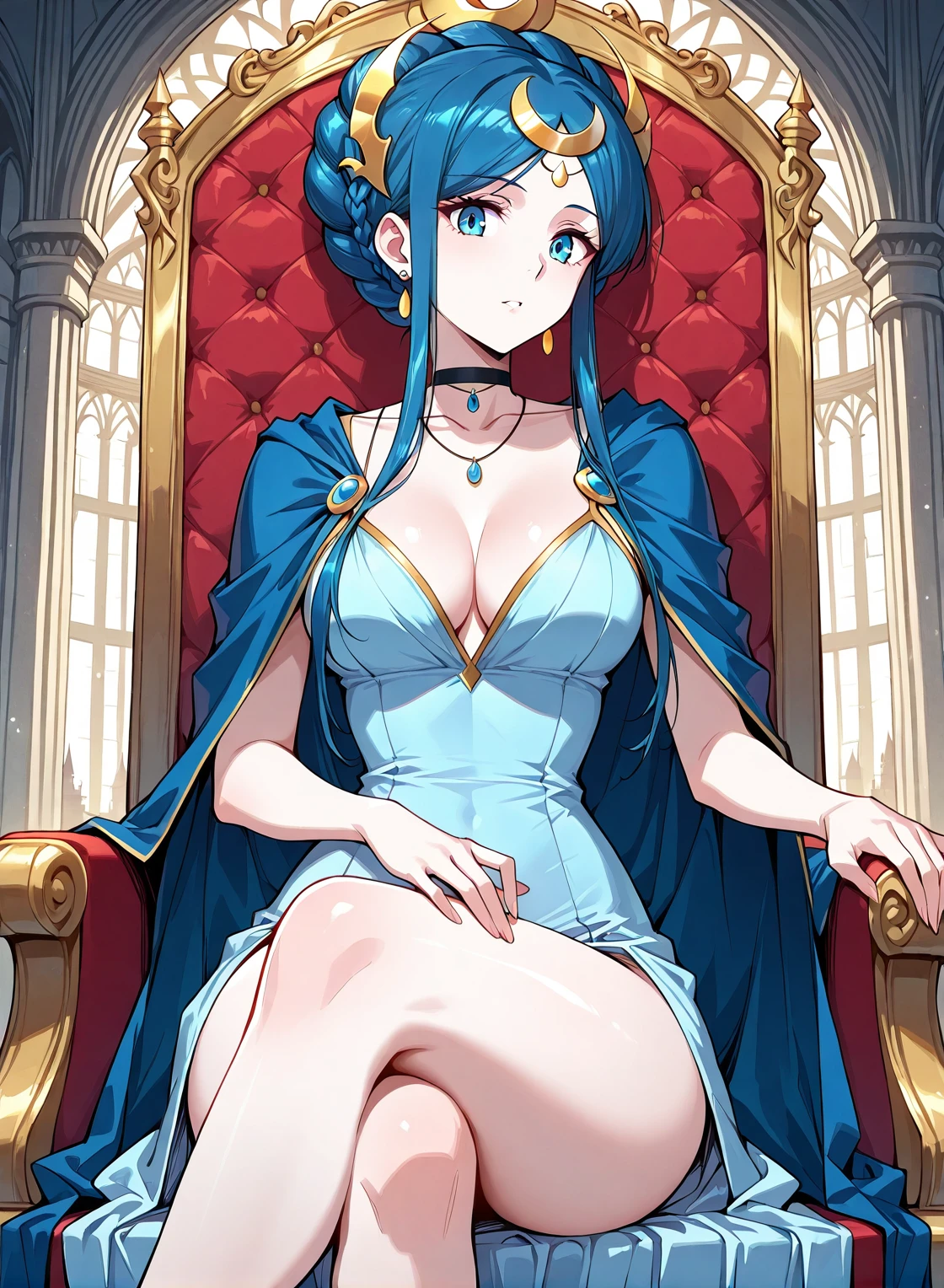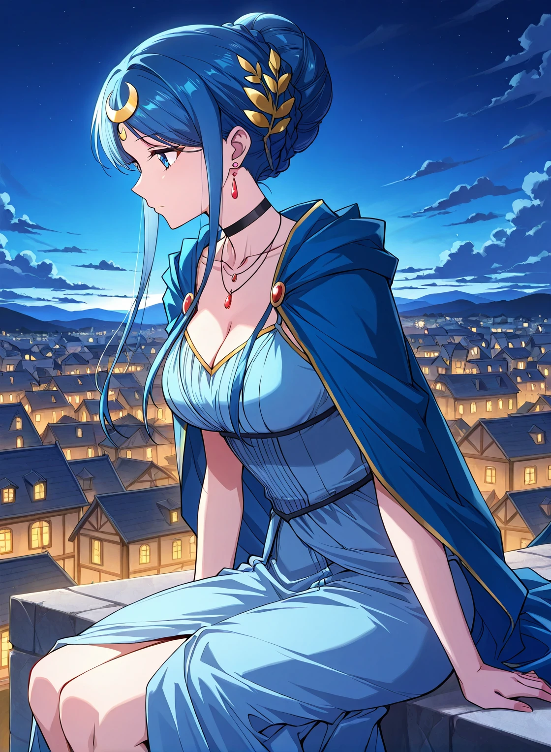 blue dress, jewelry, earrings, hair ornament, black choker, cleavage, sidelocks, crescent hair ornament, bracelete, necklace, blue cape, collarbone