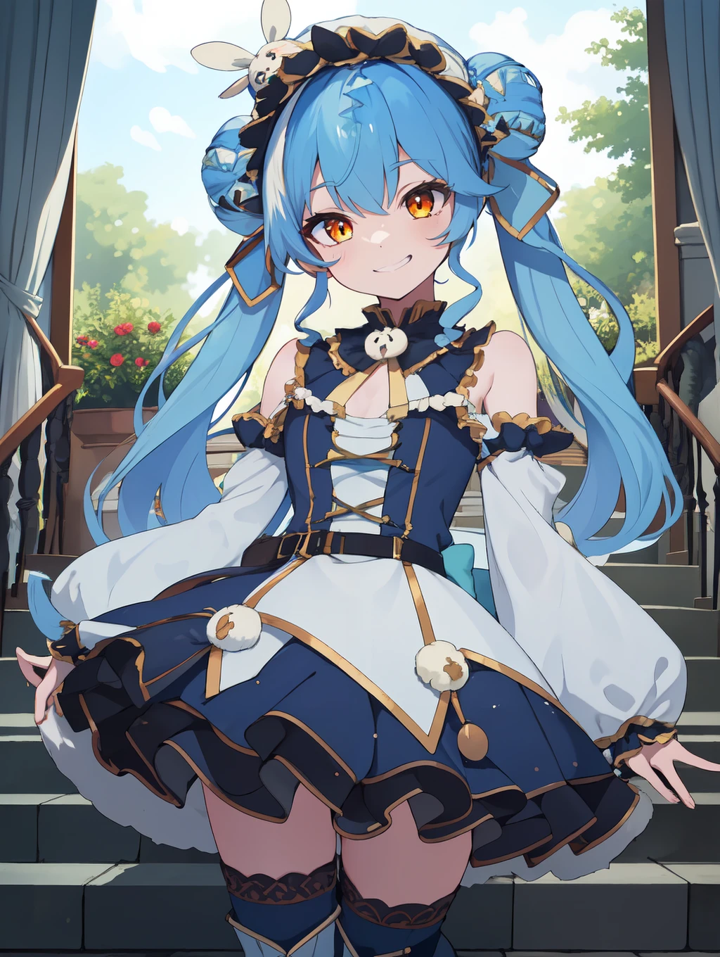 TwistyAmanozako, long hair, multicolored hair, light blue hair, white streaked hair, orange eyes, blunt bang, double hair bun,