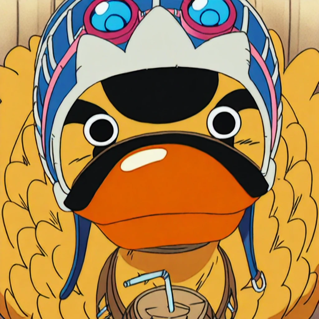 OPKaroo, duck, yellow feathers, orange beak, black tail, blue hat, goggles, goggles on headwear