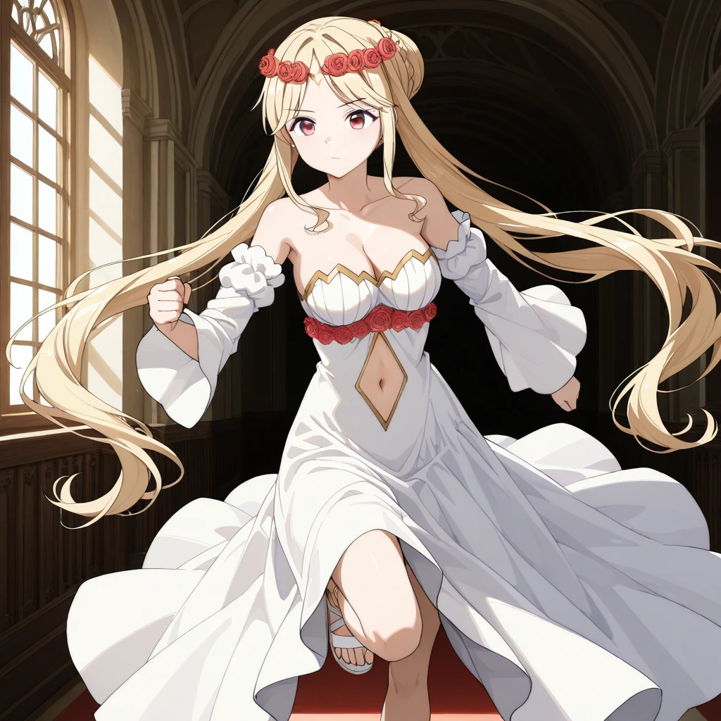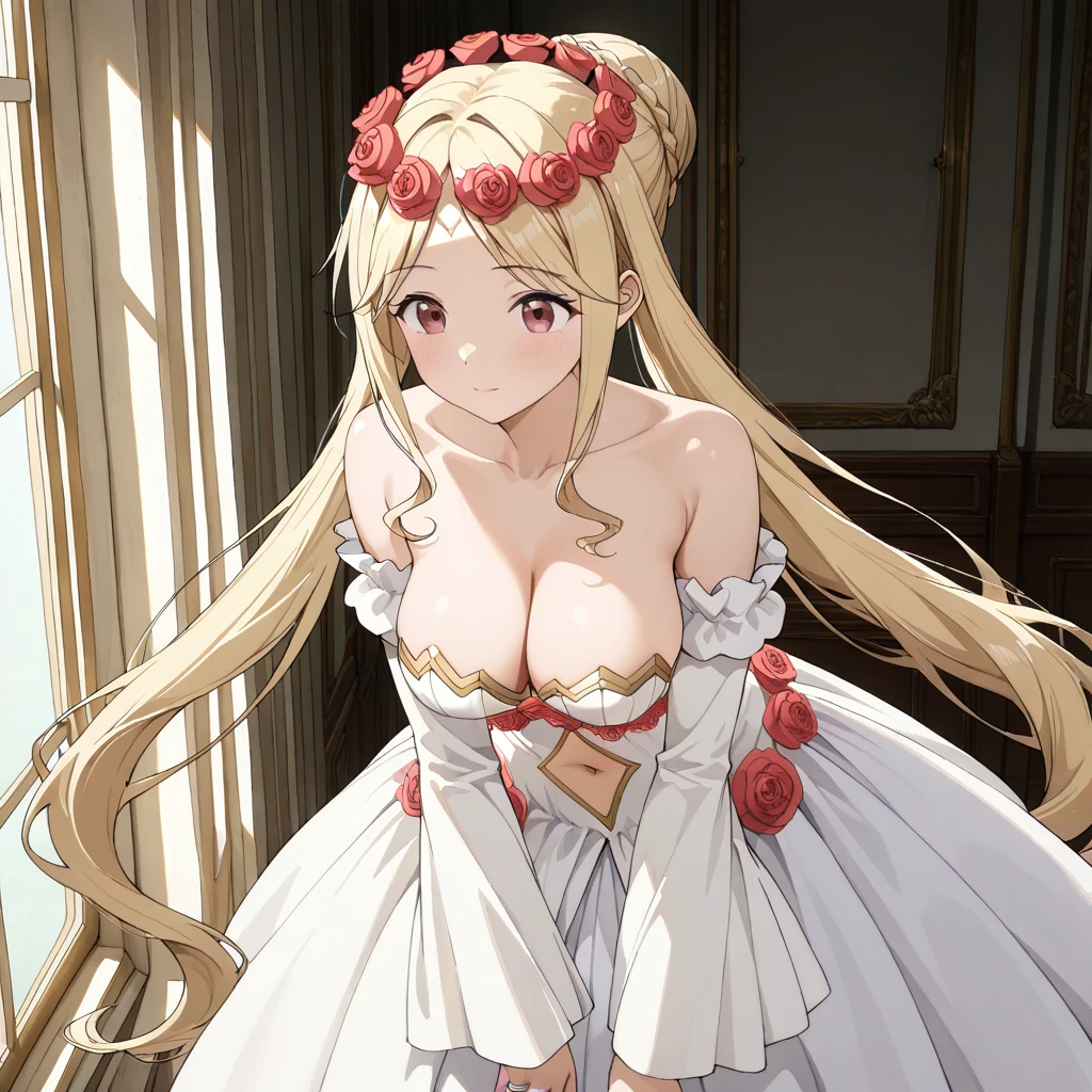 White Dress: (baseoutfit, strapless white dress, long dress, cleavage, bare shoulders, detached sleeves, navel cutout, rose underbust, white sandals)