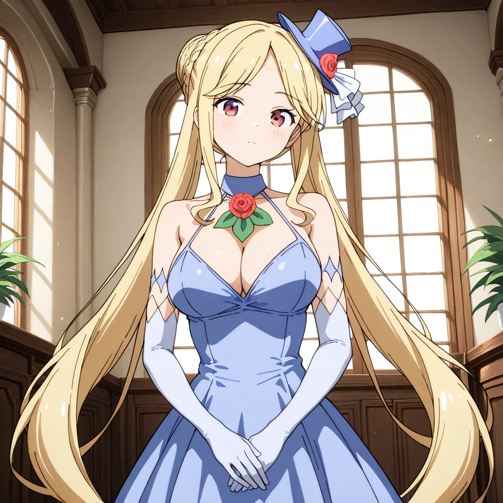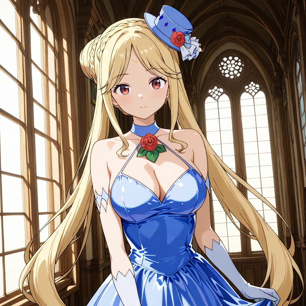 Blue Dress: (wedding, evening dress, cleavage, mini hat, bridal gloves, (rose brooch, green leaves))