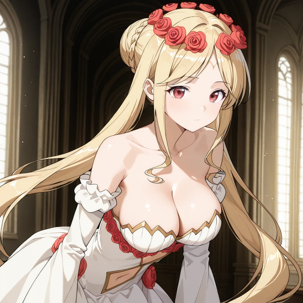 Character: (OriginSpirit, red eyes, blond hair, very long hair, twintails, sidelocks, crown braid, hair bun)