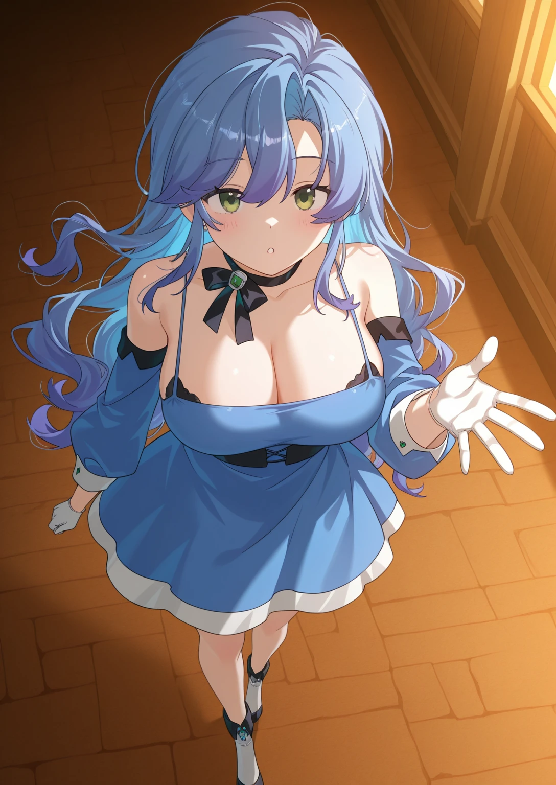 1girl, breasts, solo, detached sleeves, gloves, long hair, cleavage, blue hair, white gloves, dress, large breasts, blue dress, bare shoulders, Lillia