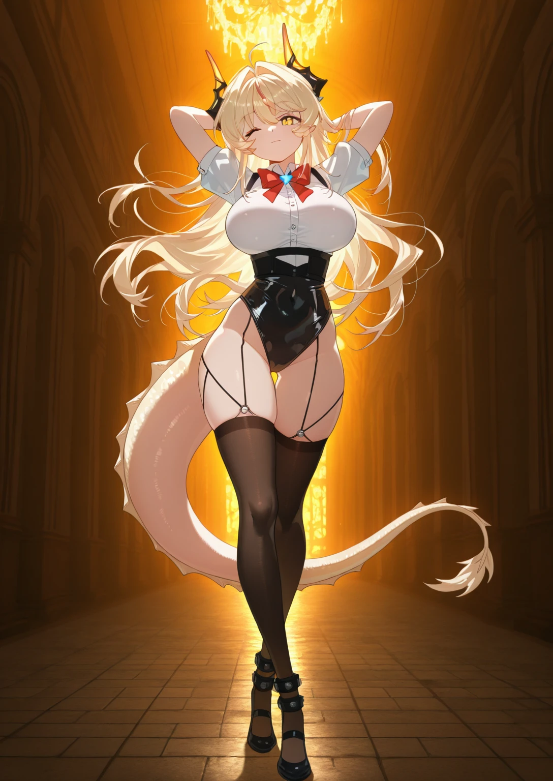 1girl, horns, thighhighs, solo, breasts, blonde hair, large breasts, long hair, tail, garter straps, leotard, yellow eyes, bow, Xiaoguang
