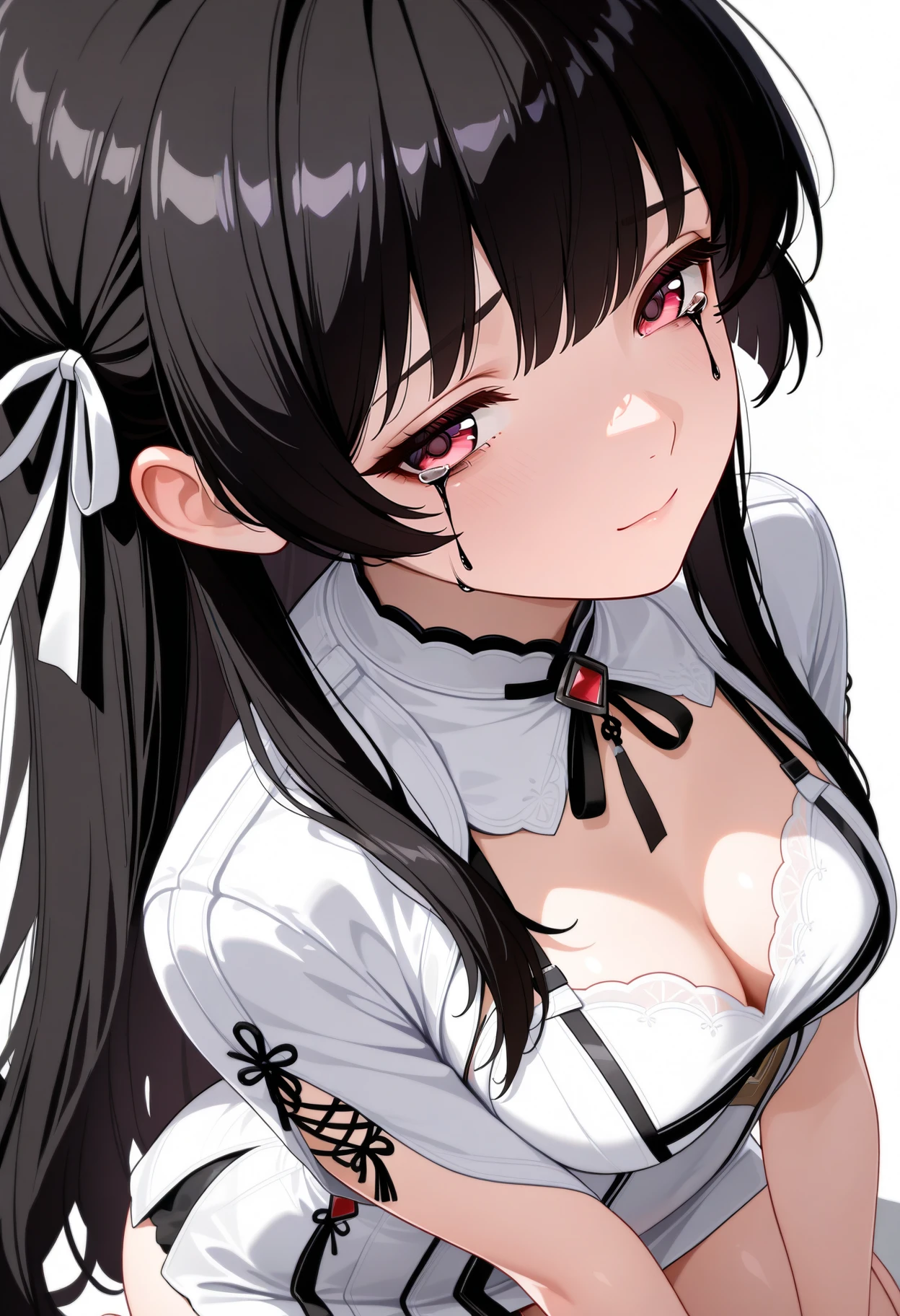 CHISA, 1girl, solo, bra, ?????????, black bra, upper body, hair ribbon, ????????????, ribbon, parted lips, armpits, looking at viewer, shirt, mole, mole under eye, collarbone, red ribbon, black shirt, lace trim, long sleeves, ??????????, cleavage, lace-trimmed bra, red background, jacket, arms up