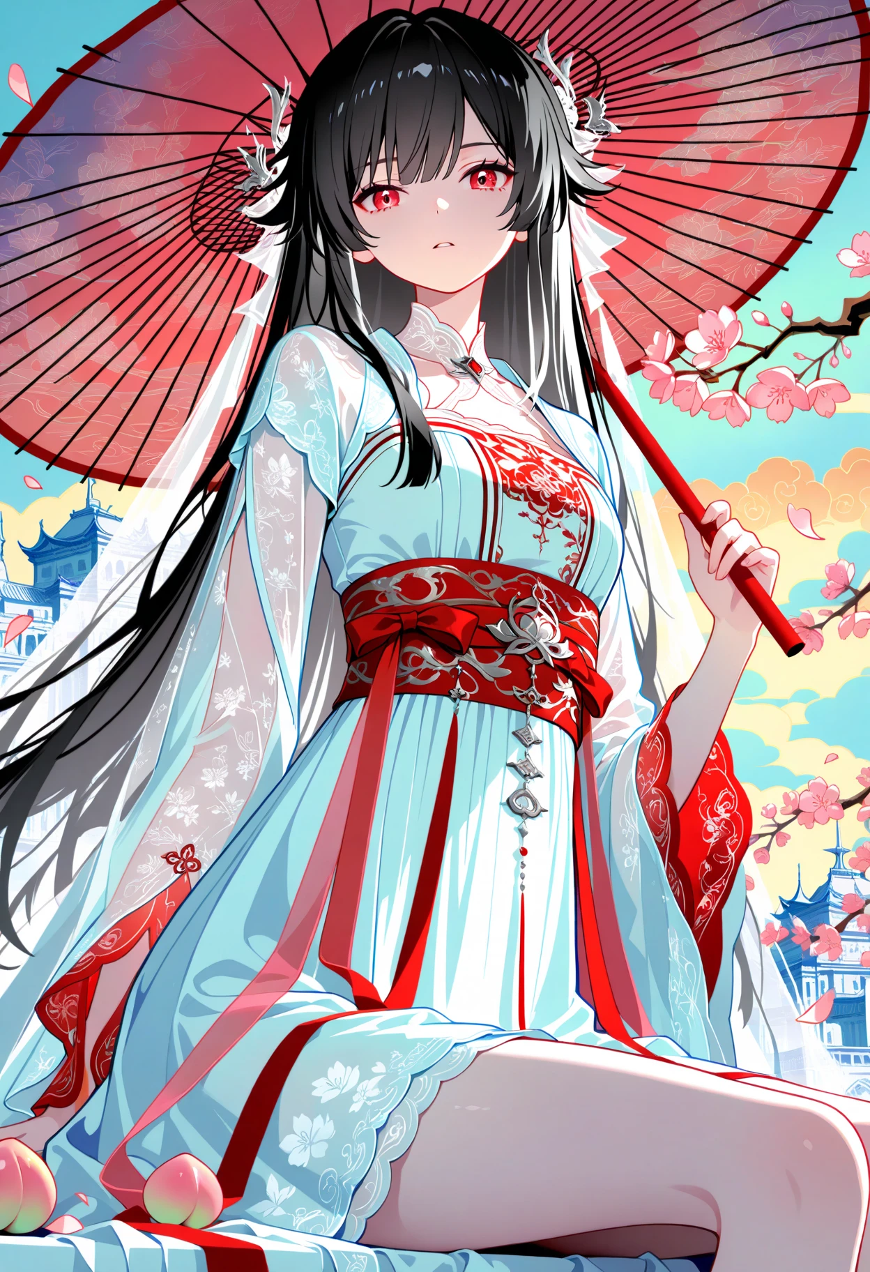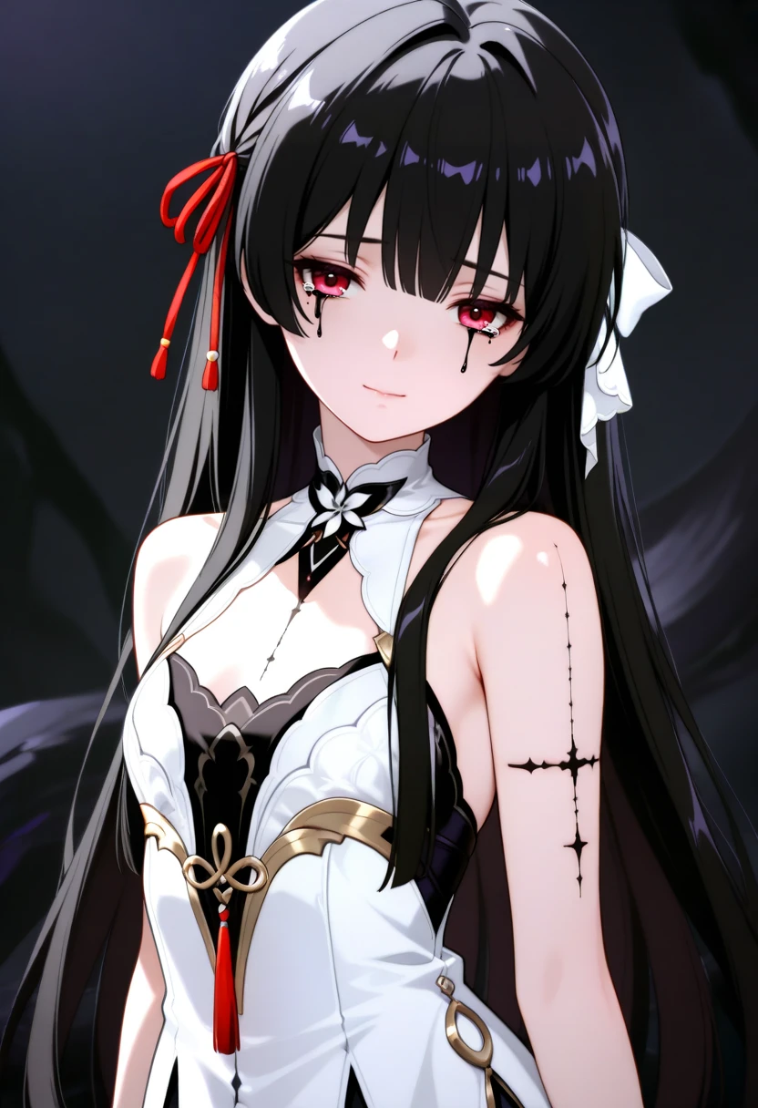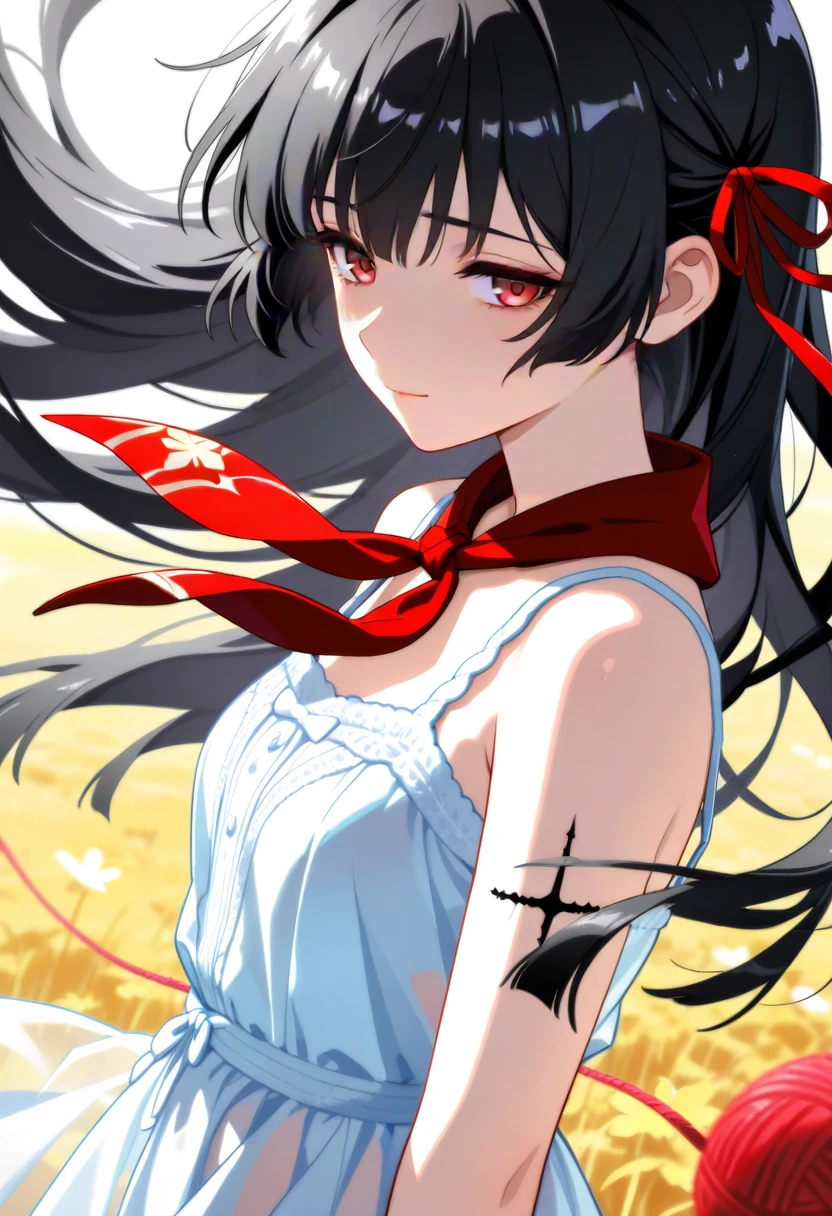 CHISA,(fine lines, delicate lines,masterpiece,best quality,more details),1girl, solo, spider lily, skirt, sitting, flower, black footwear, boots, tree, red flower, serafuku, school uniform, high heels, smile, looking at viewer, ribbon, pleated skirt, hair ribbon, choker, black serafuku, black skirt, sailor collar, red ribbon, high heel boots, shirt, black choker, long sleeves, black shirt, platform footwear, outdoors, in tree, red neckerchief, parted lips, red necktie, between legs, sitting in tree, hand on own face, neckerchief, legs