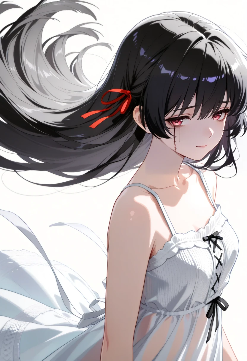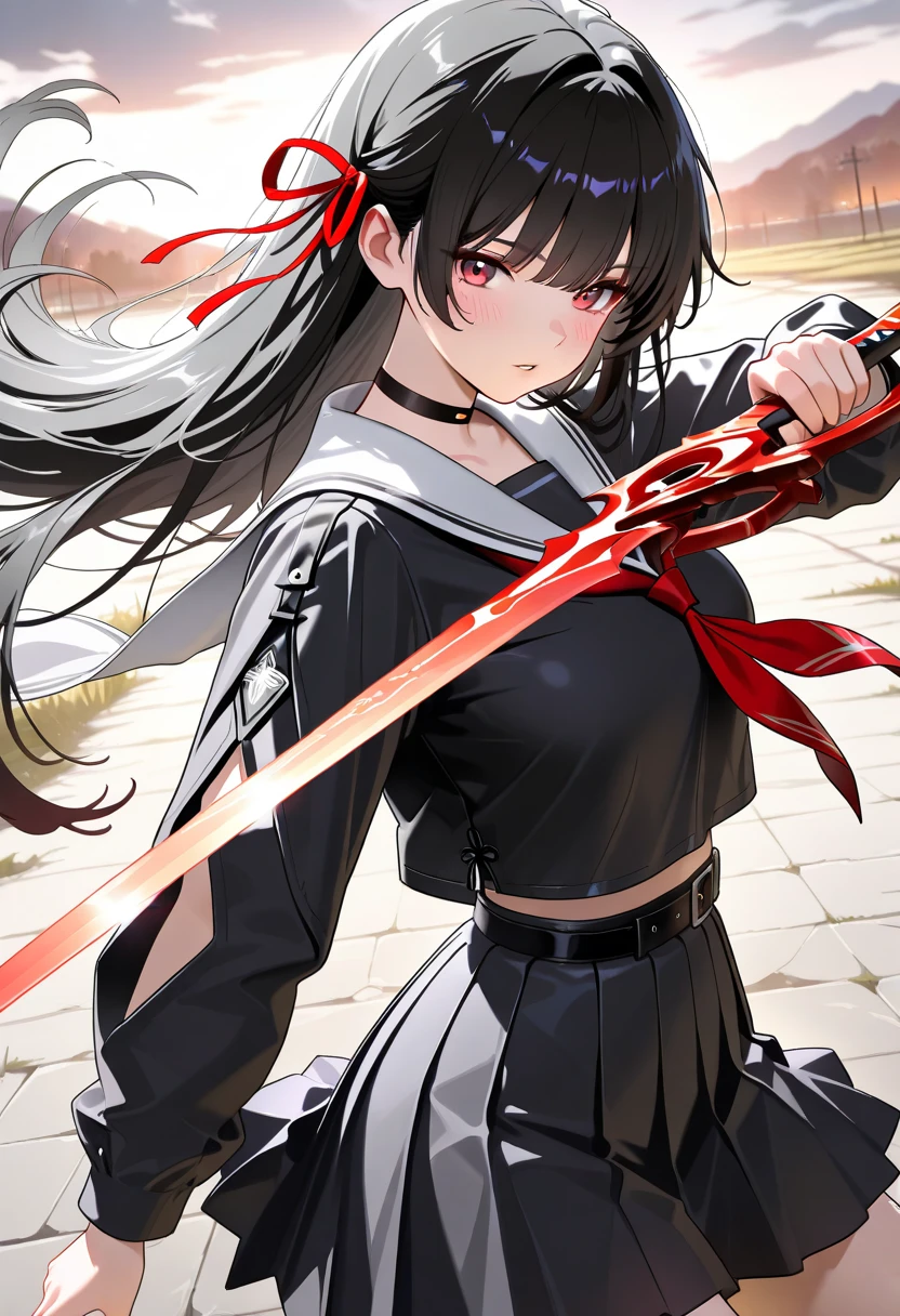 CHISA,(fine lines, delicate lines), 1girl, solo, skirt, weapon, sword, holding, school uniform, pleated skirt, holding weapon, holding sword, navel, thigh strap, serafuku, neckerchief, white background, looking at viewer, simple background, white sailor collar, sailor collar, midriff, socks, torn clothes, black skirt, closed mouth, shirt, red neckerchief, long sleeves, white socks, crop top, choker, ribbon, black serafuku, jacket, hair ribbon, thighs, black shirt, bandaid, ????????????, coat,