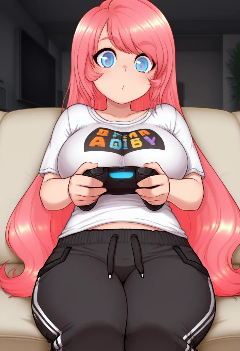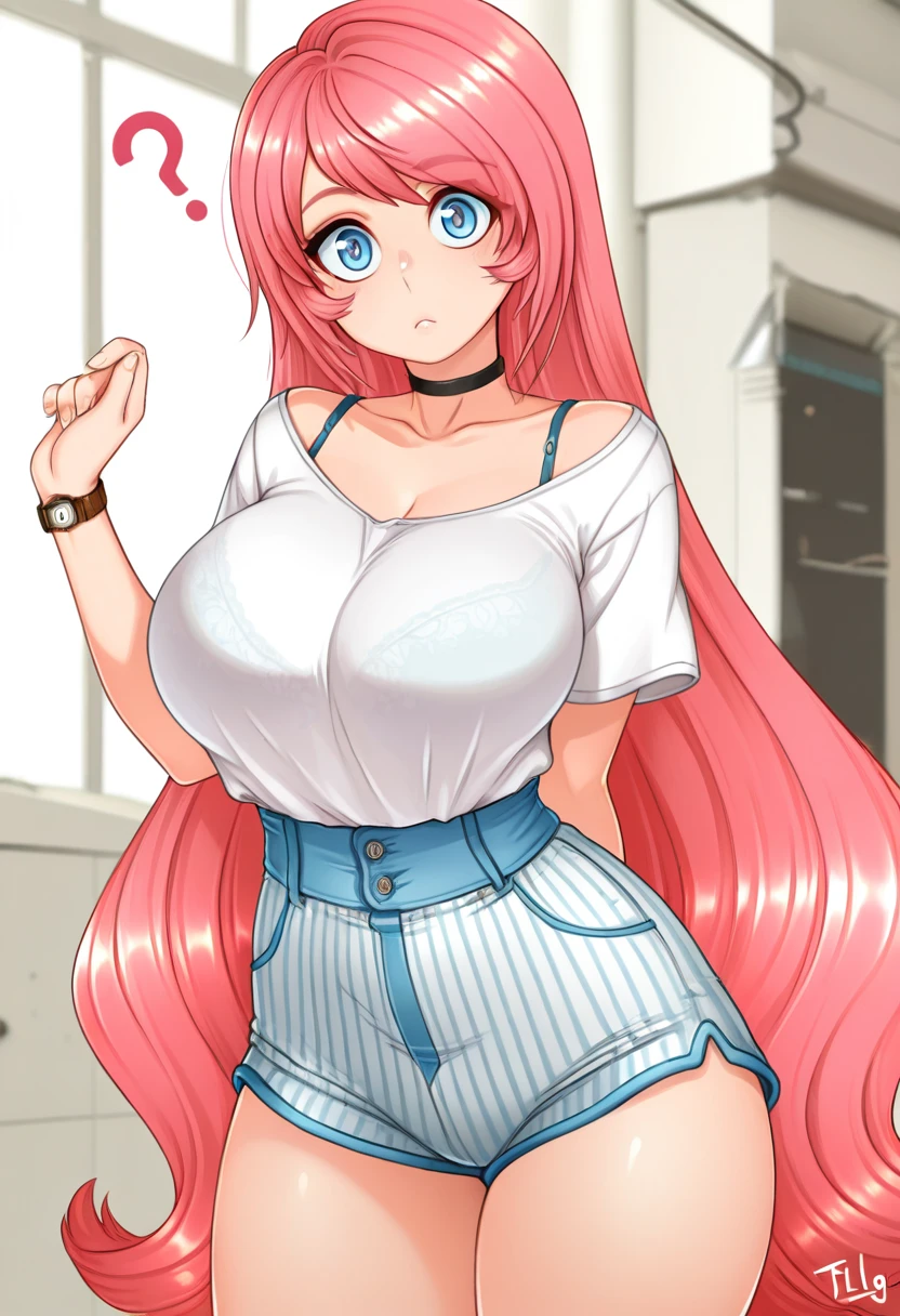 tifa_lugame, blue eyes, very long hair, pink hair, large breasts,You may want to add hair twirling to negative prompts.