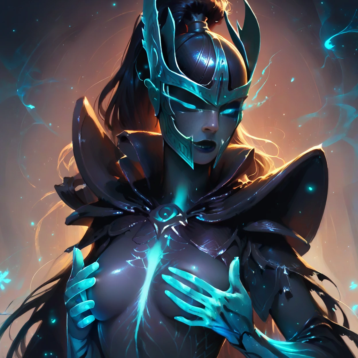 helmet, mask, ponytail, black skin, shoulder armor, bioluminescent, bodysuit, neon, glowing, blue particles from hands, particles emitting from eyes, corrupted glowing veins down chest, angular body patterns