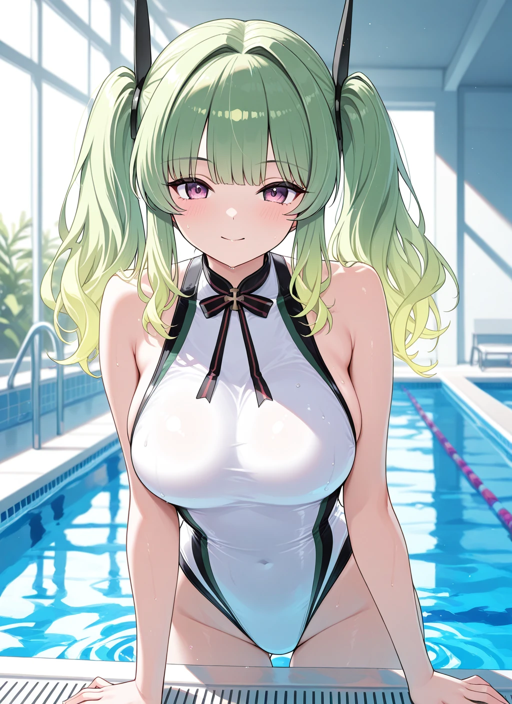 maggiore_baracca \(azur lane\),twintails,purple eyes,green hair,long hair,white one-piece swimsuit,