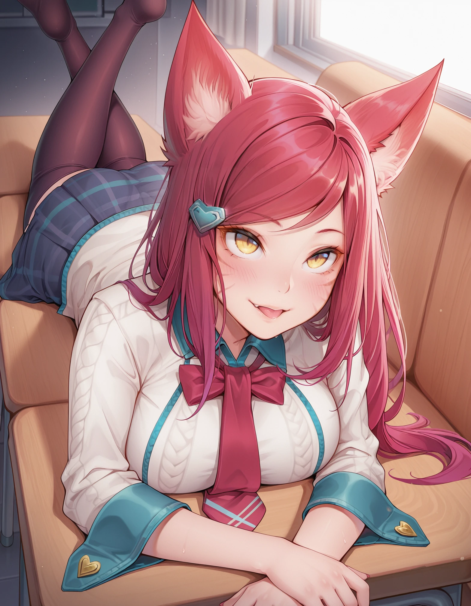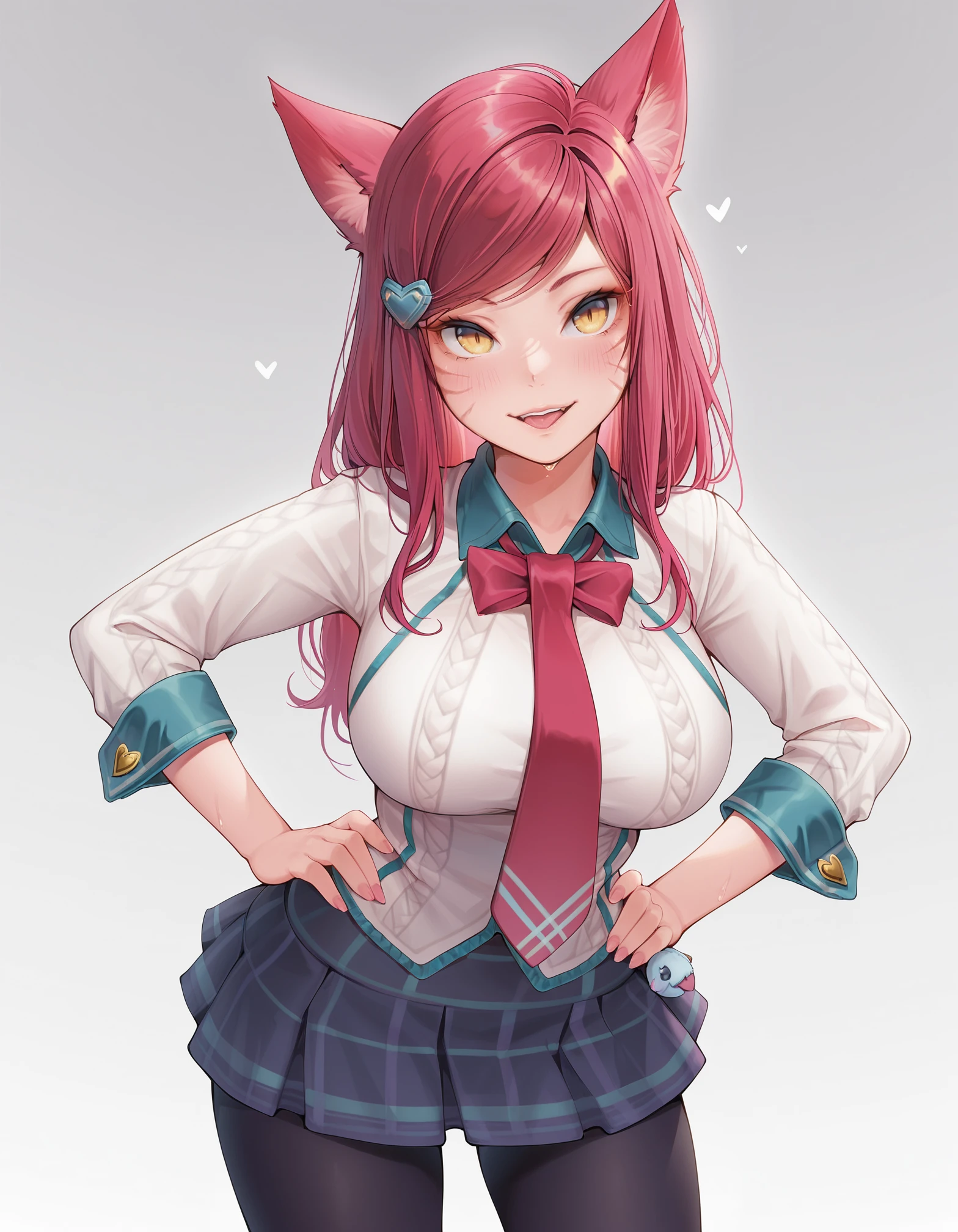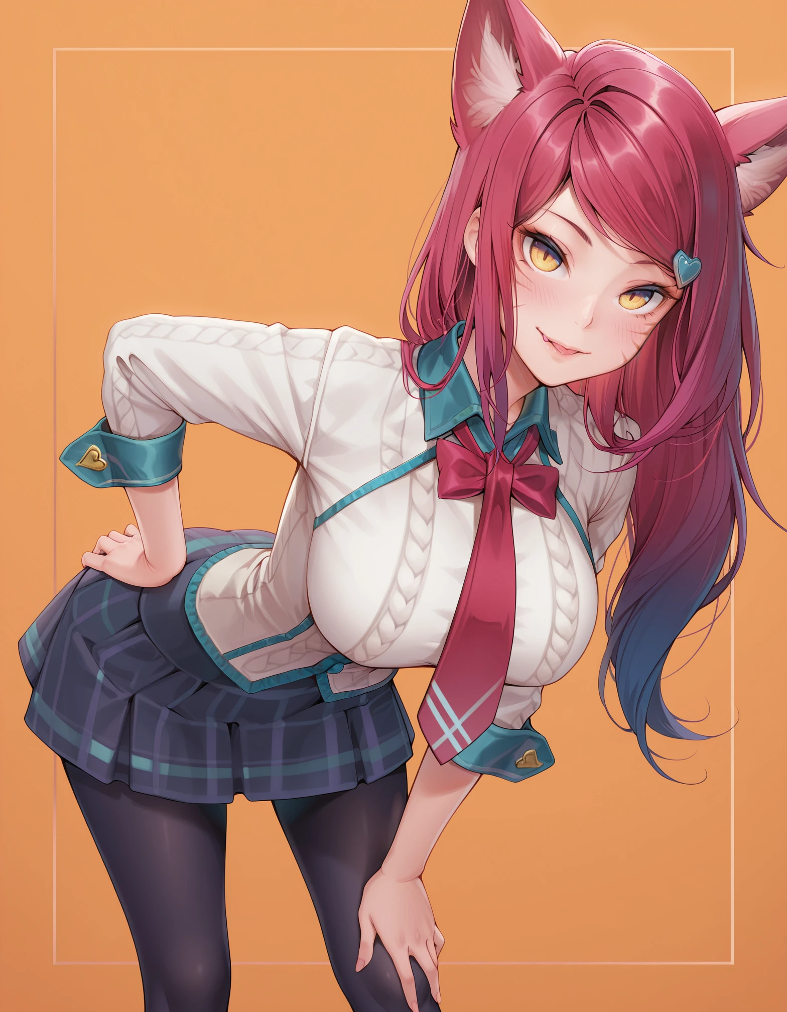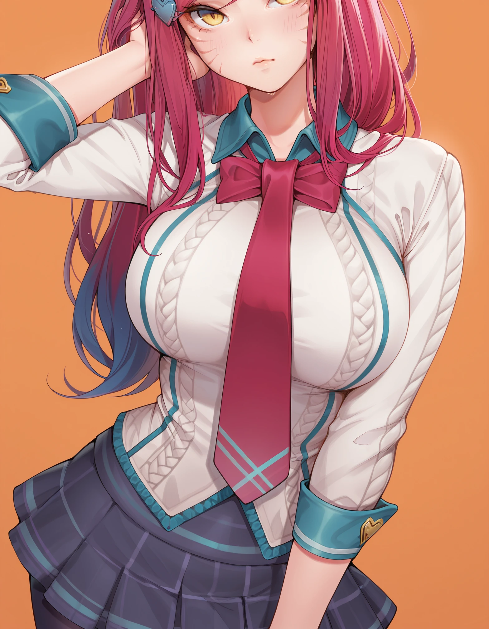 yellow eyes, red hair, collared shirt, necktie, skirt