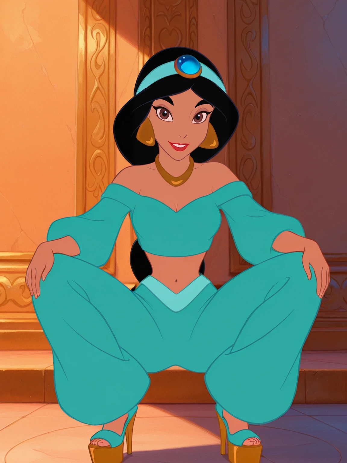 • original suit: "ja_n, 1girl, arabian woman, brown skin, black hair, red lips, brown eyes, ponytail hair, turquoise headband with sapphire, golden earrings, golden necklace, sky blue bedlah top, sky blue matching salwar pants"