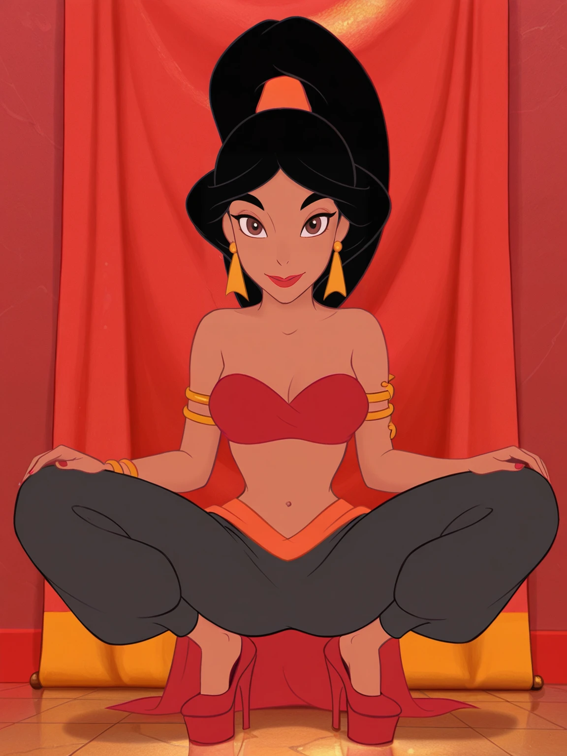 • slave suit: "ja_n, 1girl, arabian woman, brown skin, black hair, red lips, brown eyes, triangular gold earrings, high ponytail hair with band, golden snake armlet, red bandeau bikini top,red salwar pants + gold tiara"