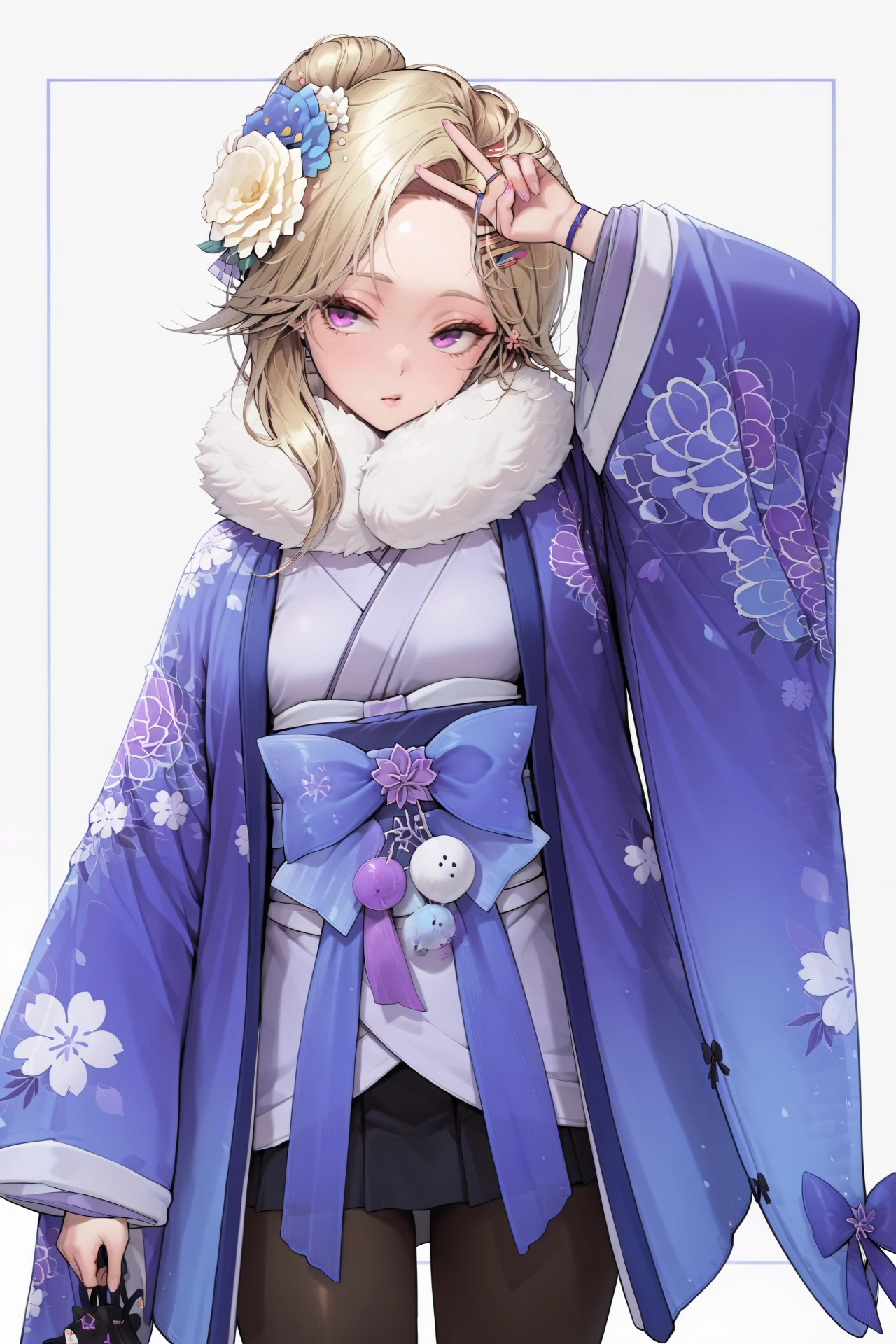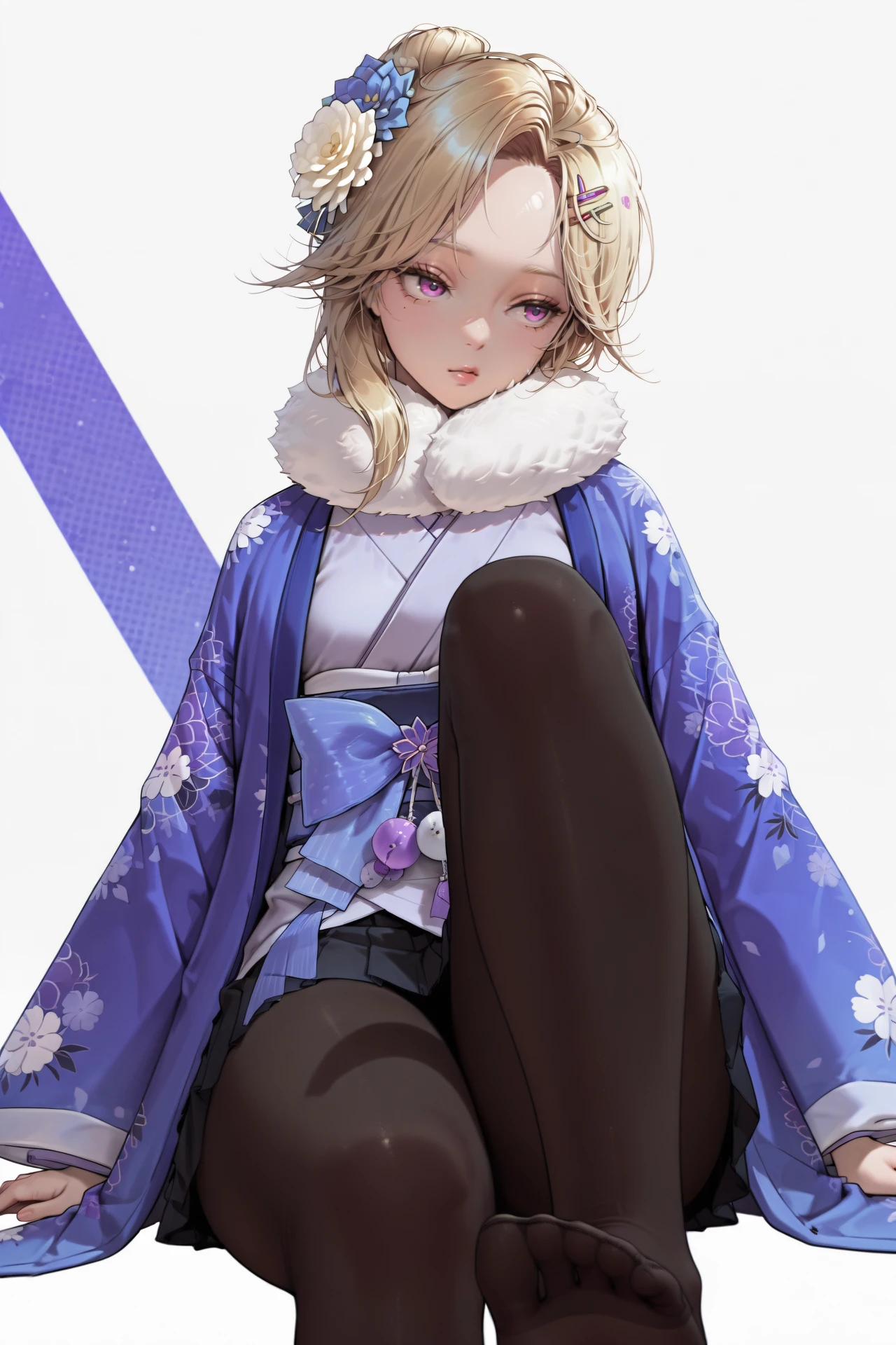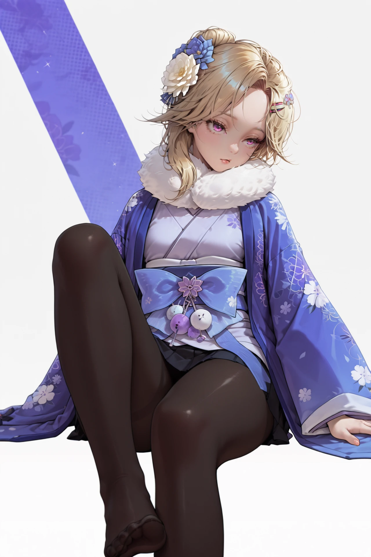 einskin, 1girl, japanese clothes, solo, pantyhose, kimono, hair ornament, hair flower, flower, blonde hair, white background, wide sleeves, stuffed toy, full body, looking at viewer, black pantyhose, tabi, stuffed animal, sash, simple background, white flower, blue kimono, standing, obi, bow, pink eyes, long sleeves, closed mouth, bangs, skirt