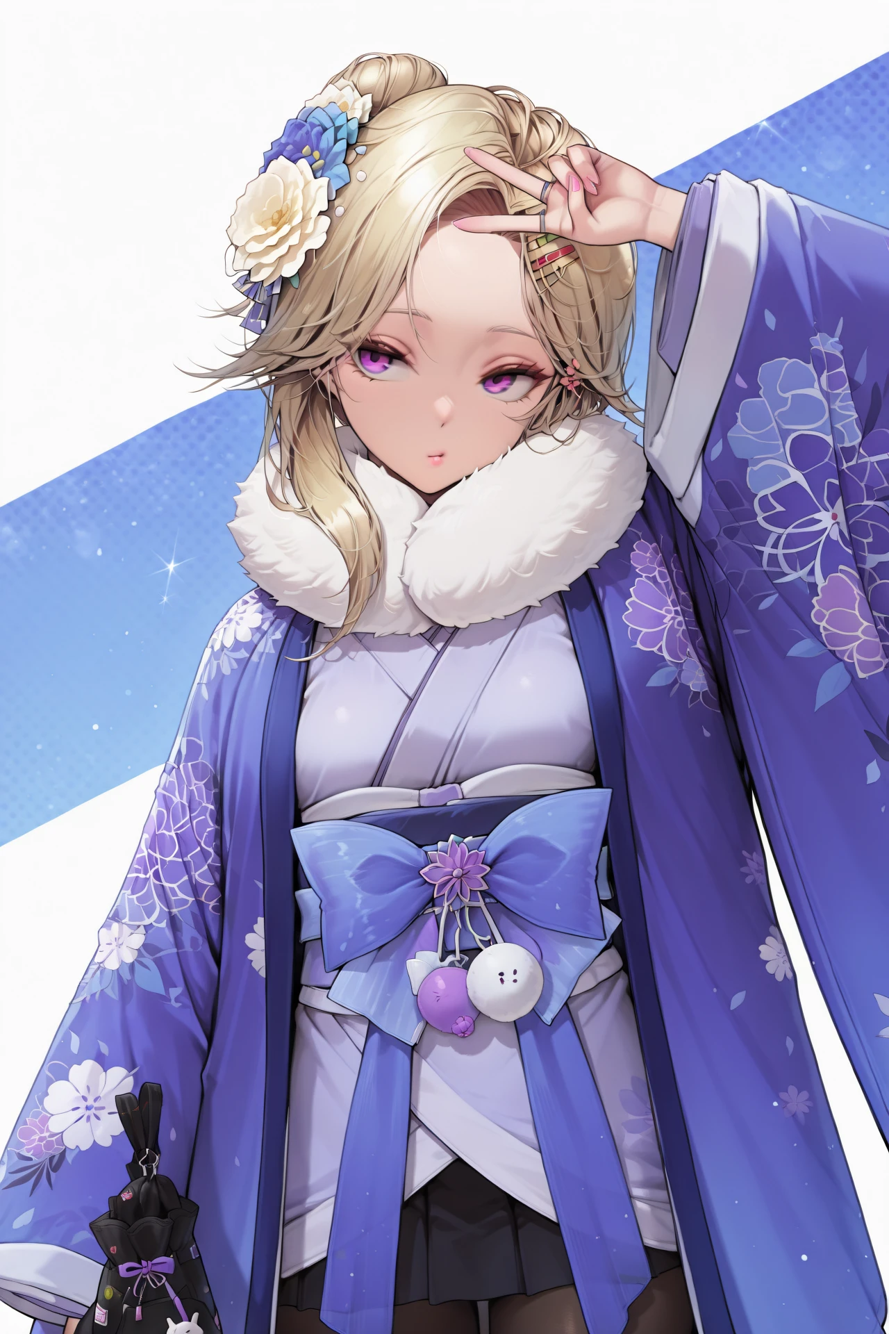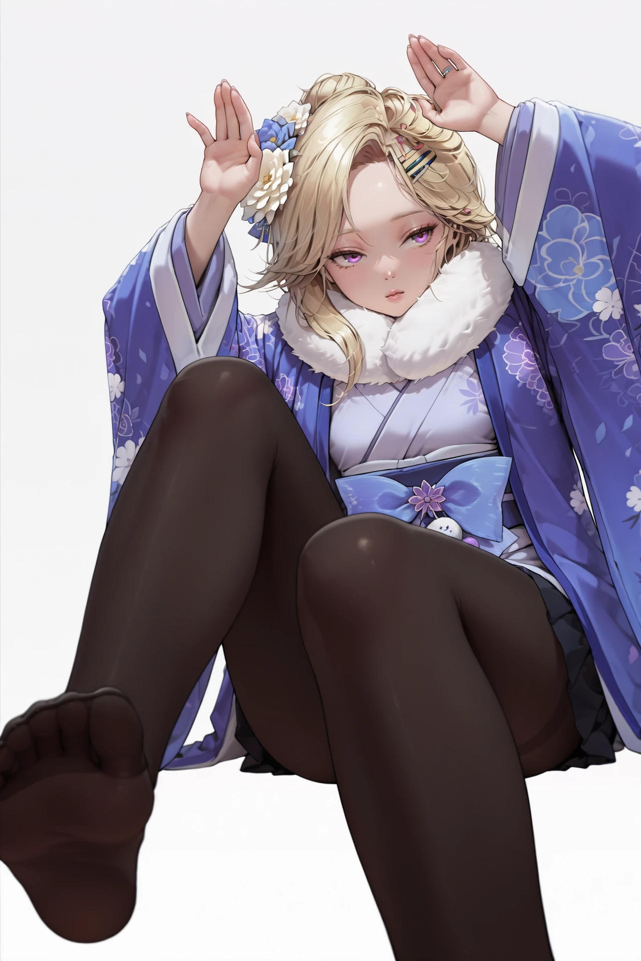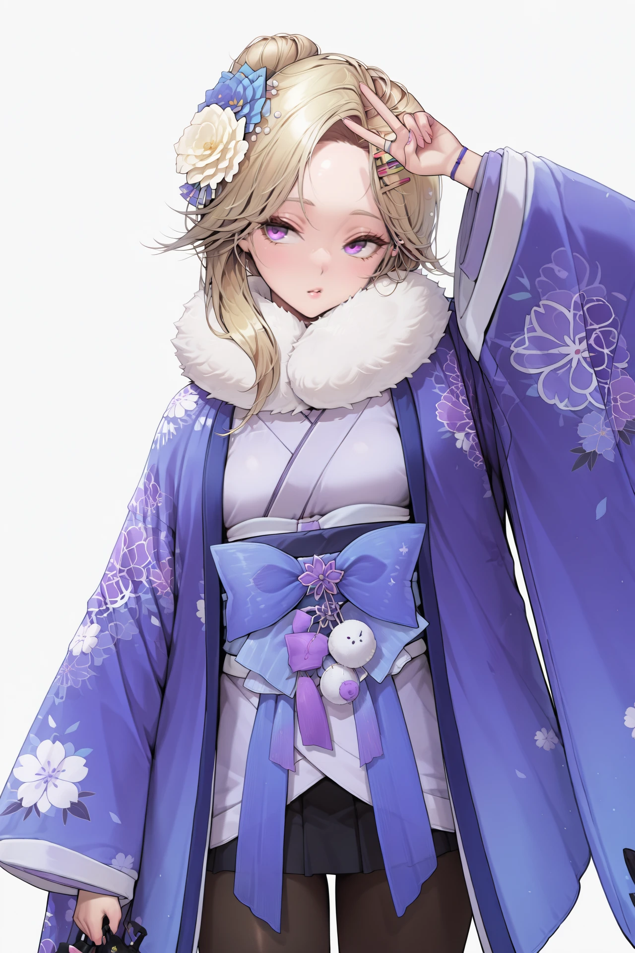 einskin, 1girl, japanese clothes, solo, pantyhose, kimono, hair ornament, hair flower, flower, blonde hair, white background, wide sleeves, stuffed toy, full body, looking at viewer, black pantyhose, tabi, stuffed animal, sash, simple background, white flower, blue kimono, standing, obi, bow, pink eyes, long sleeves, closed mouth, bangs, skirt