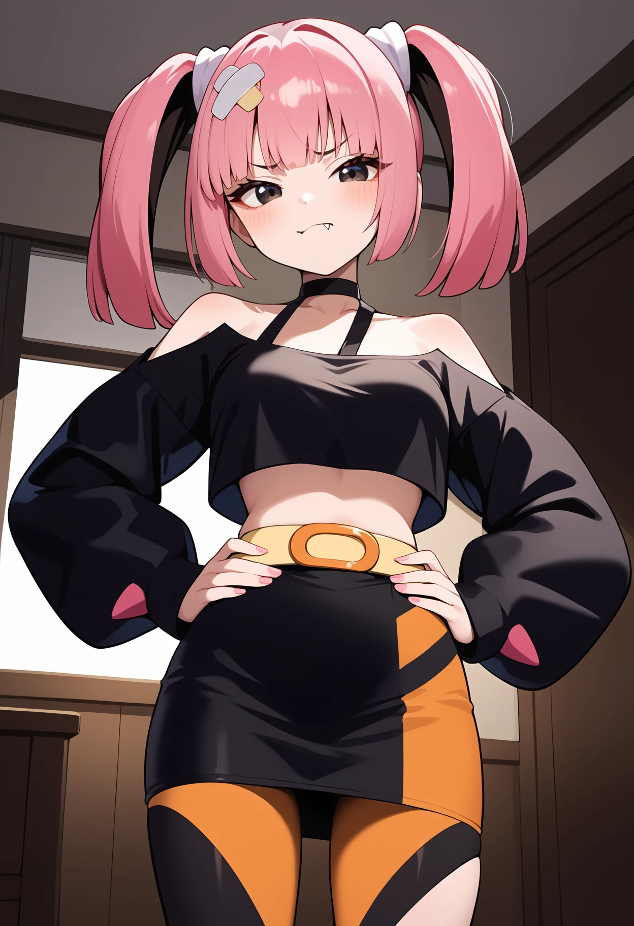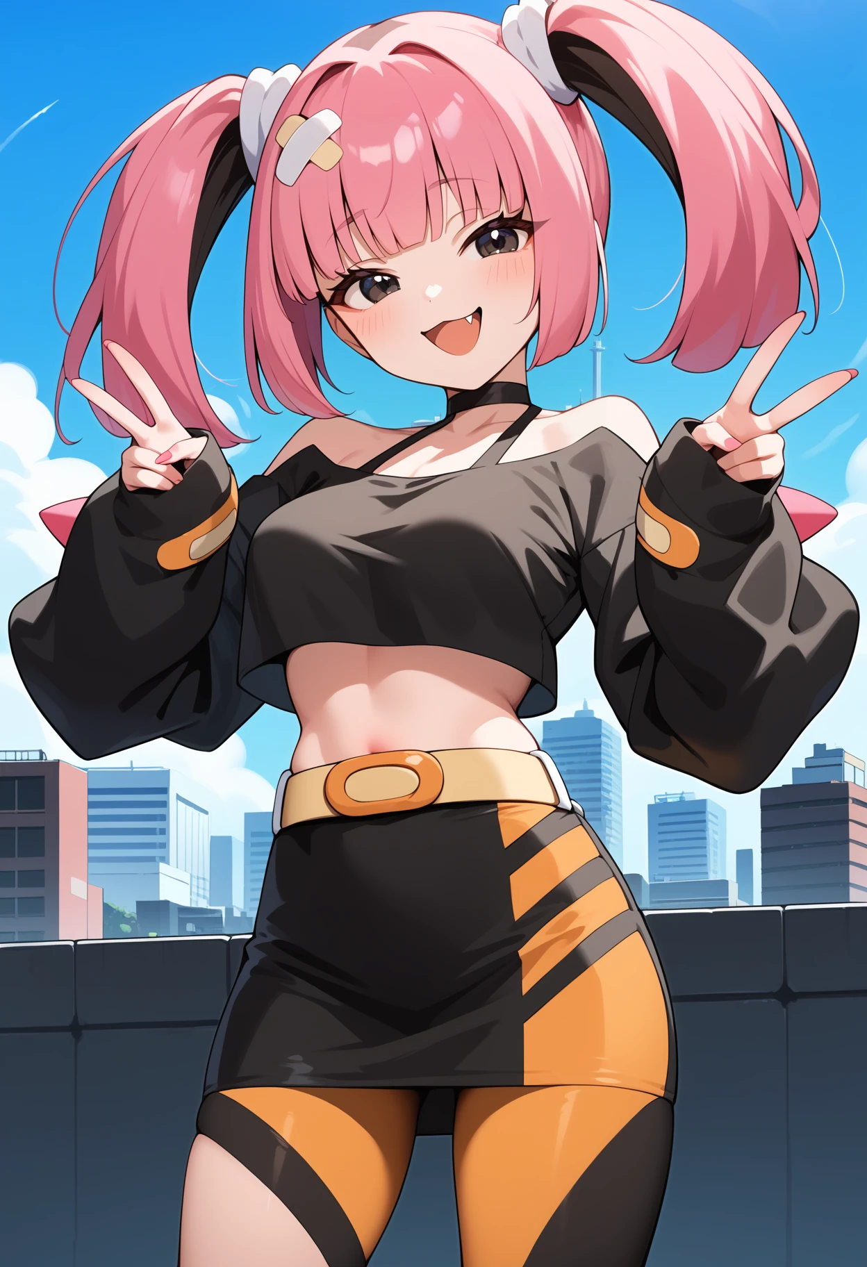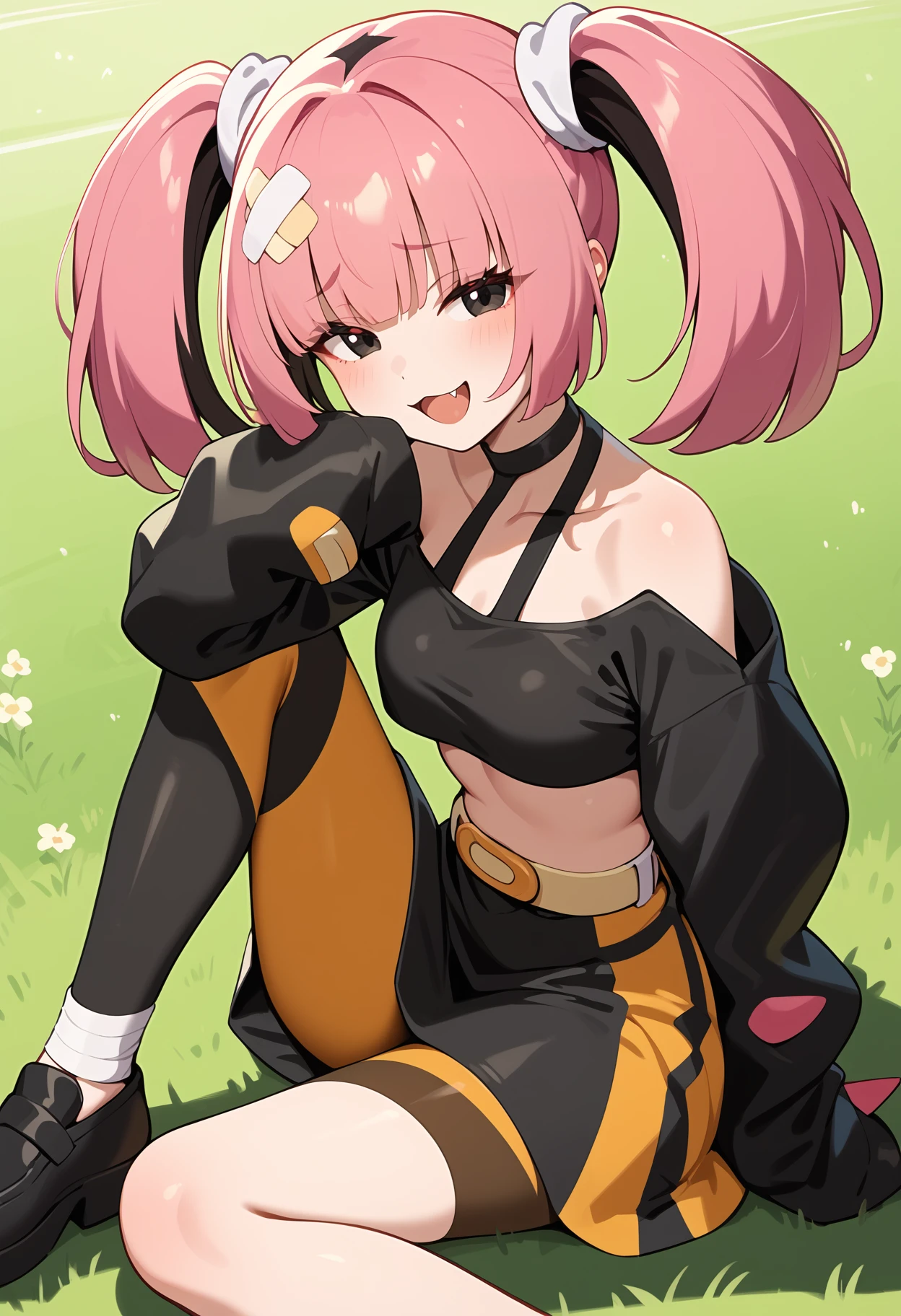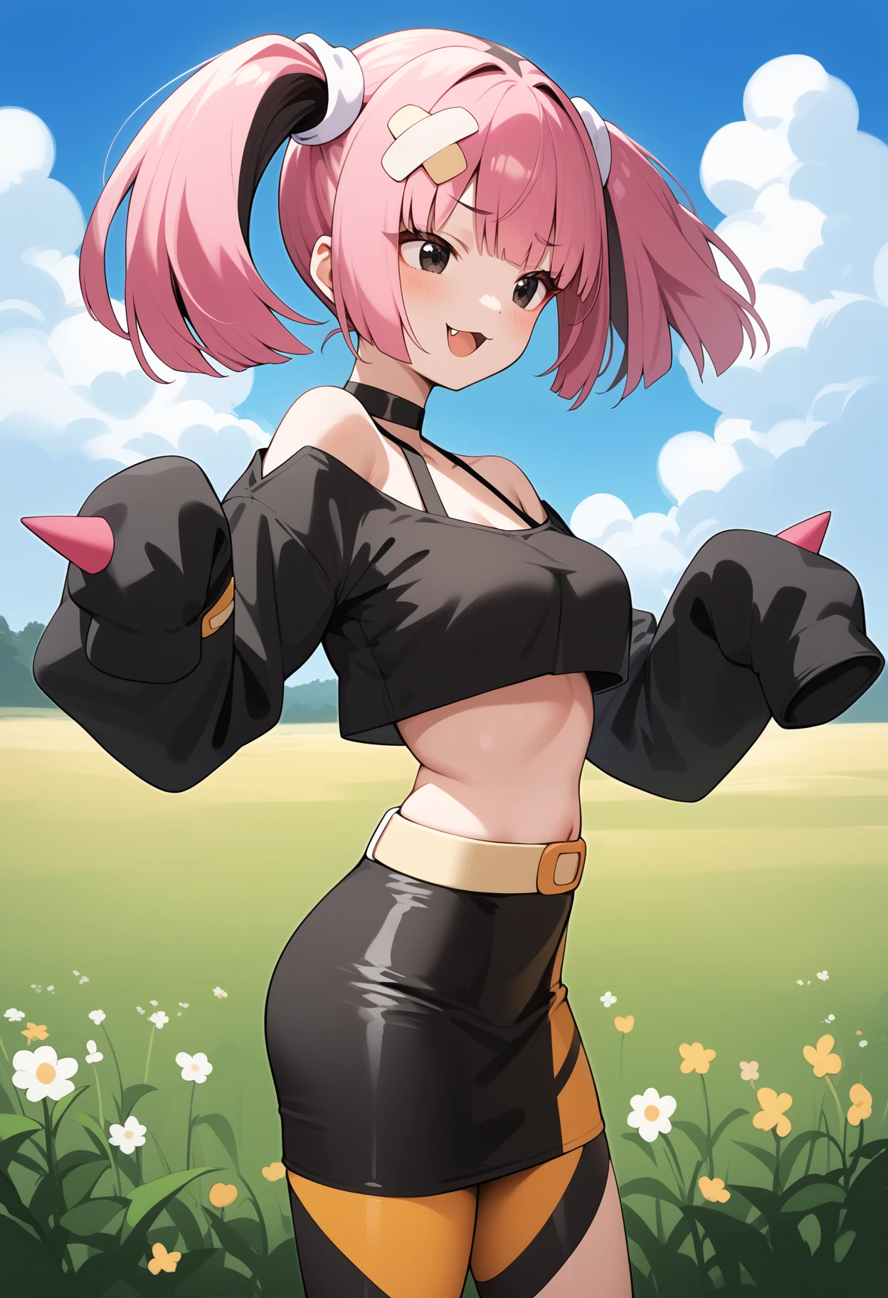outfit1aacoral, multicolored hair, pink hair, twintails, hair ornament, bandaid, black eyes, fang, breasts, choker, off shoulder, black shirt, long sleeves, sleeves past wrists, midriff, belt, black skirt, asymmetrical legwear, single leg pantyhose