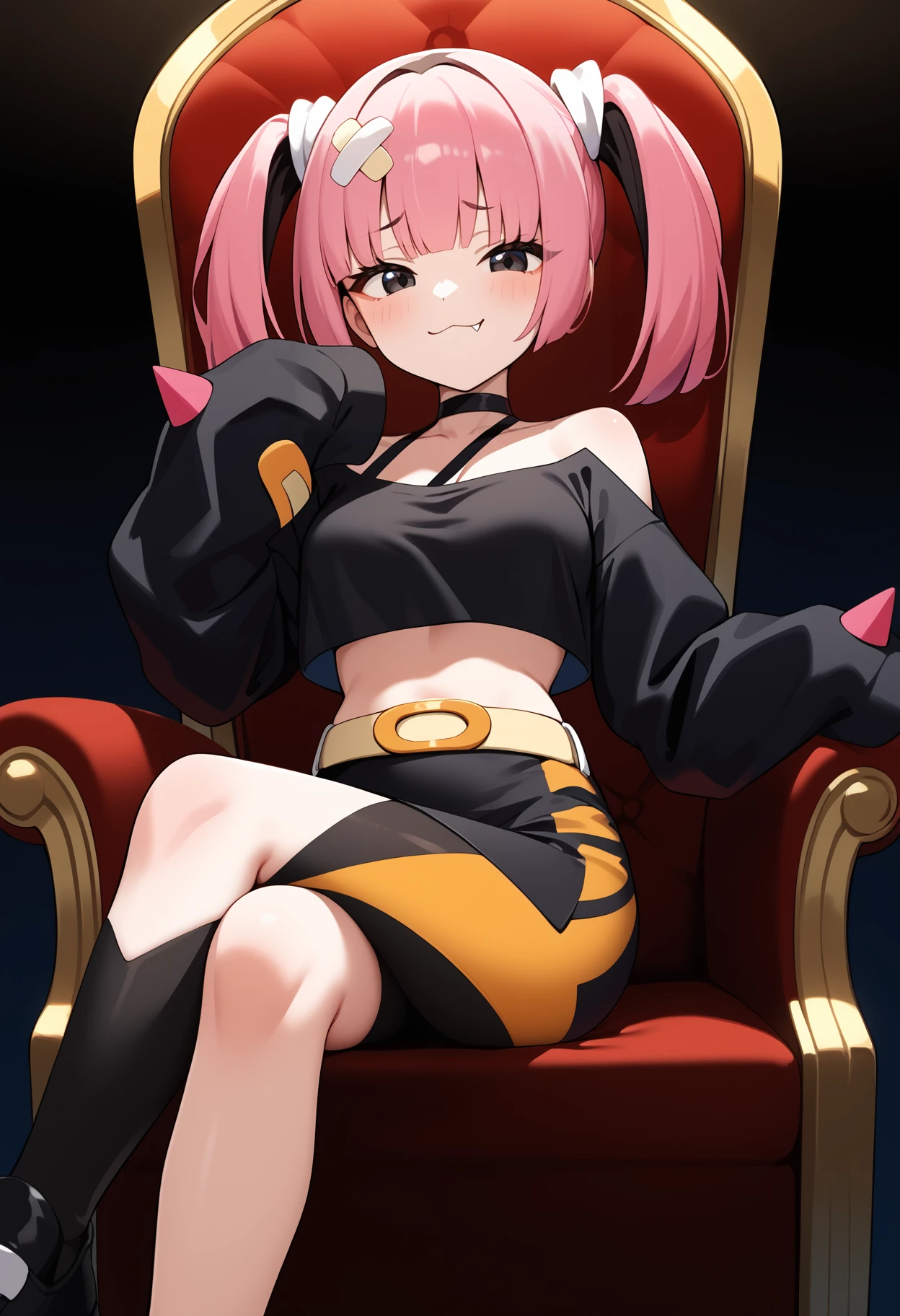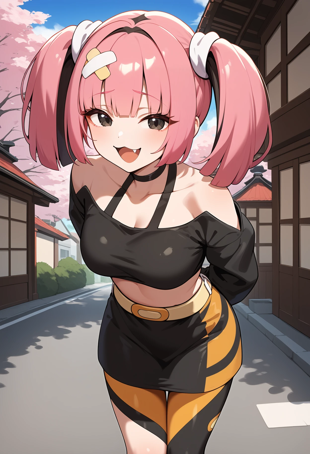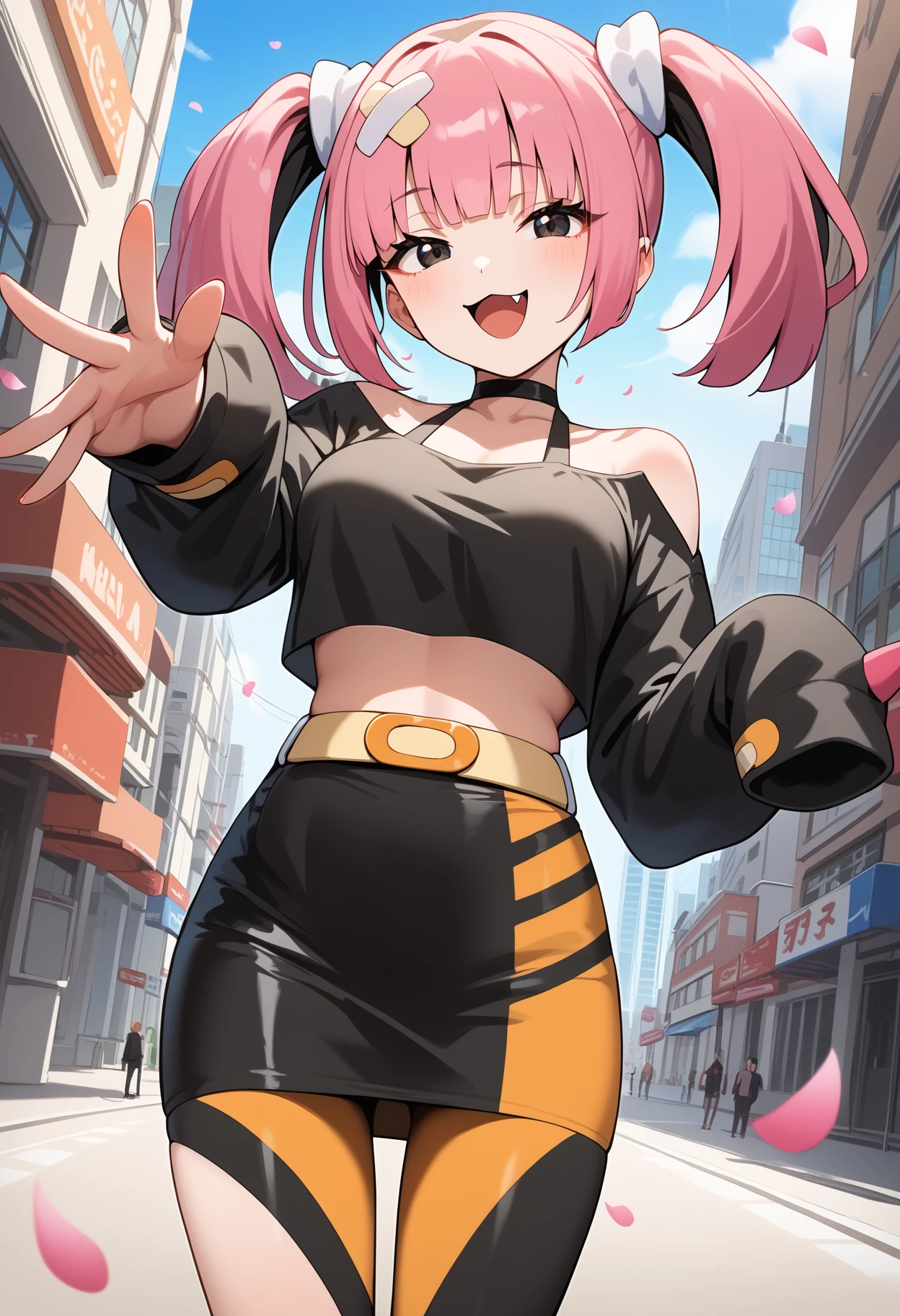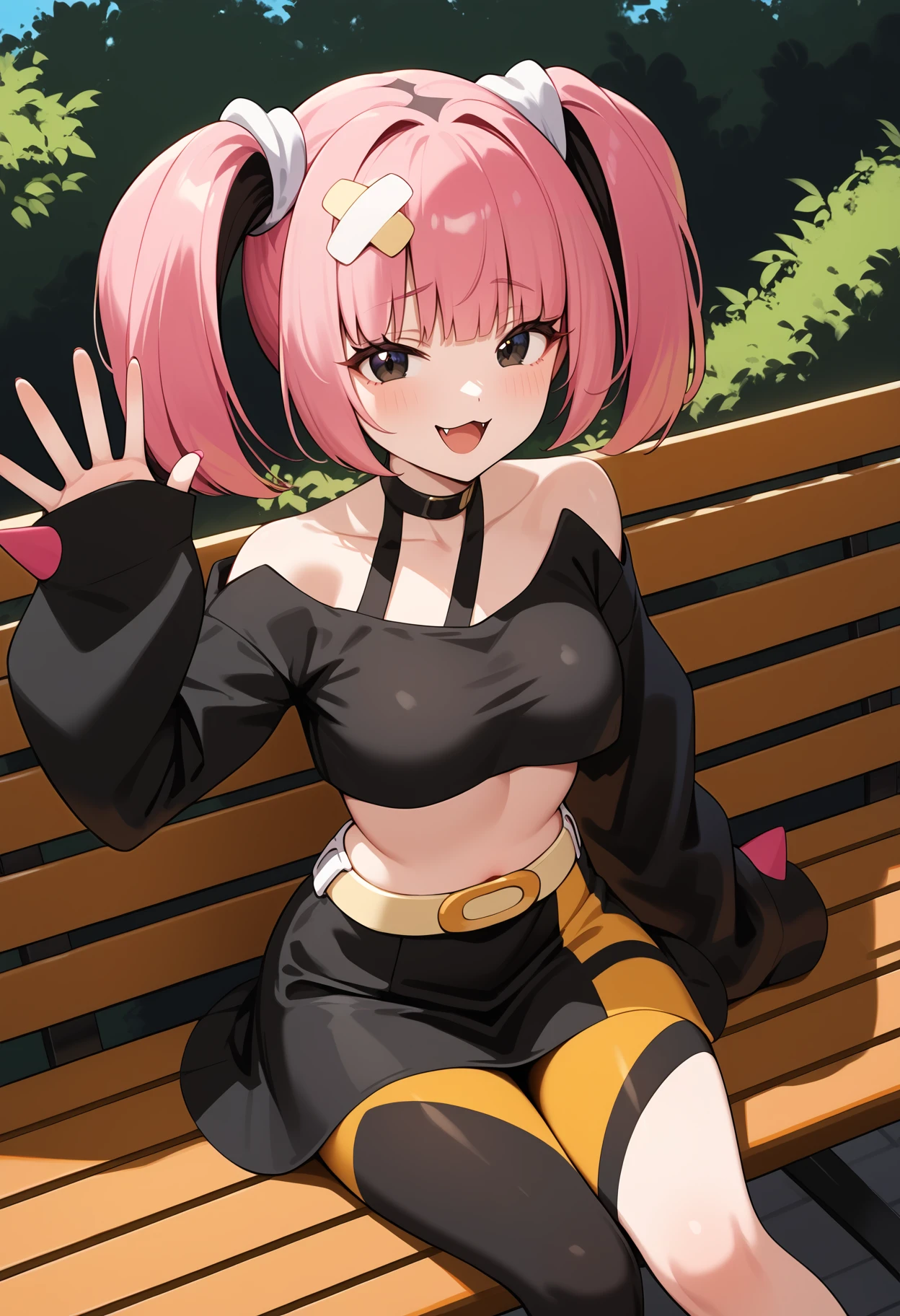 outfit1aacoral, multicolored hair, pink hair, twintails, hair ornament, bandaid, black eyes, fang, breasts, choker, off shoulder, black shirt, long sleeves, sleeves past wrists, midriff, belt, black skirt, asymmetrical legwear, single leg pantyhose