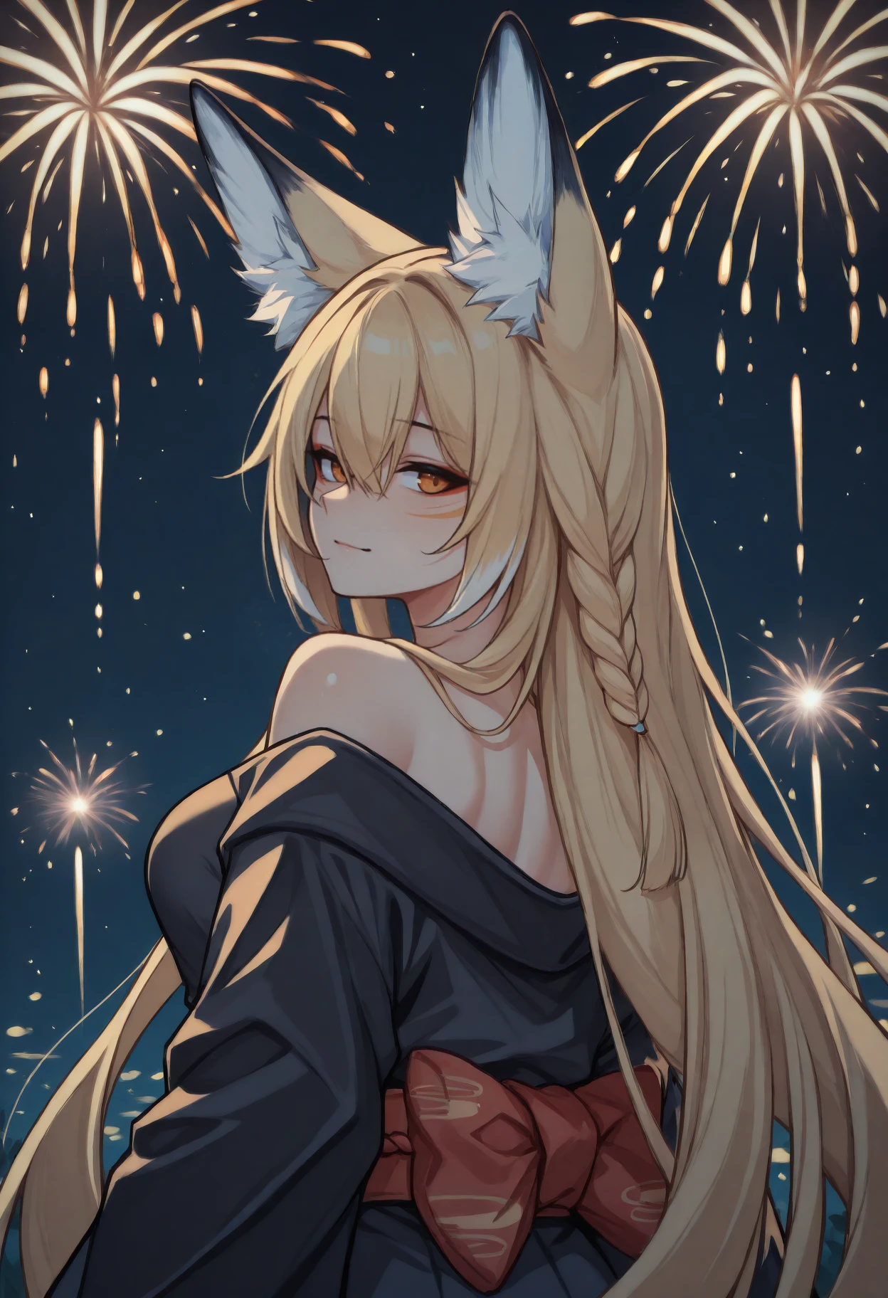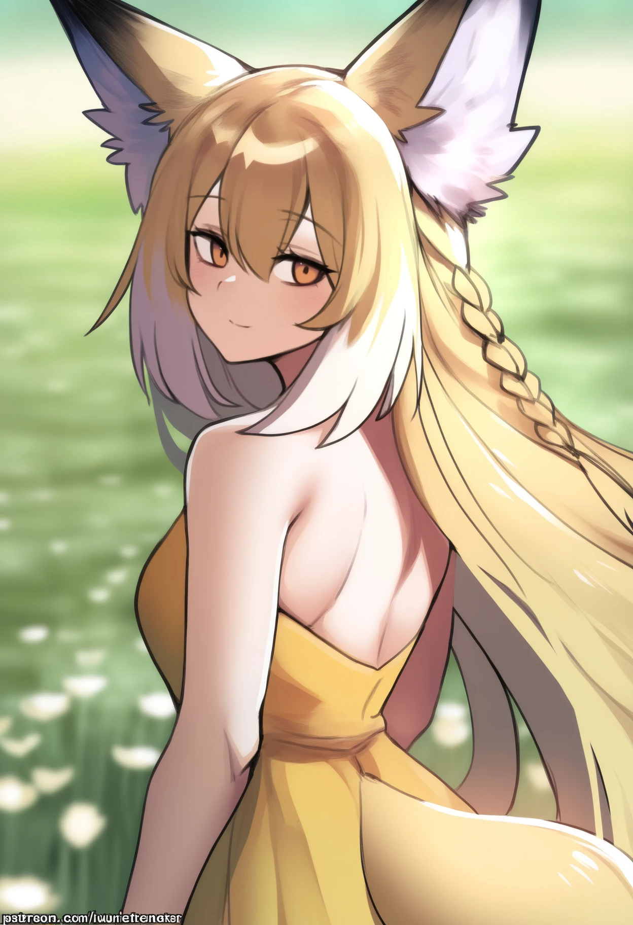 vulpisfoglia, fox girl, long hair, blonde hair, hair between eyes, braid, animal ears, animal ear fluff, orange eyes