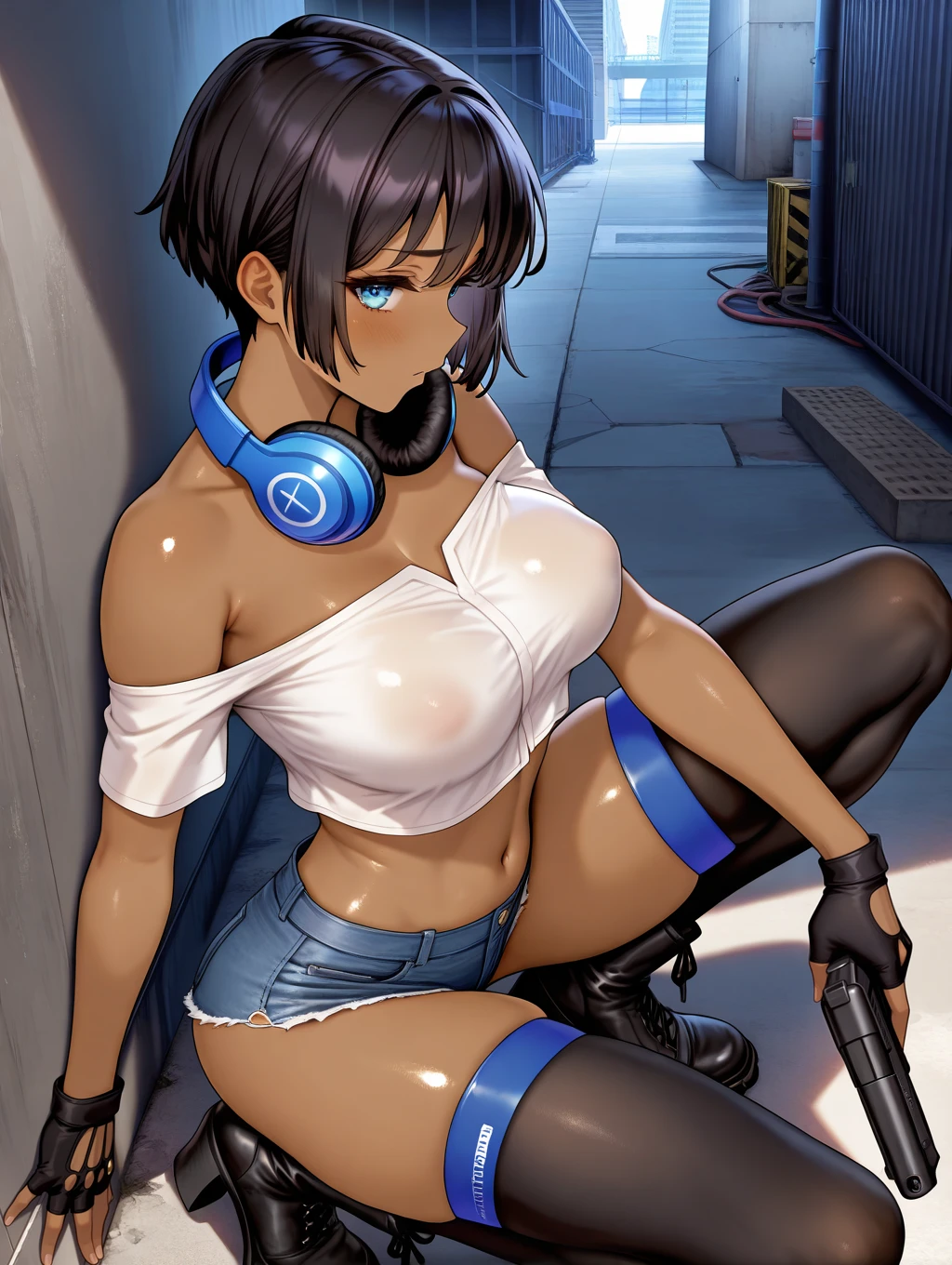 G1,blue eyes,black hair,hairband,dark-skinned female,shiny skin,