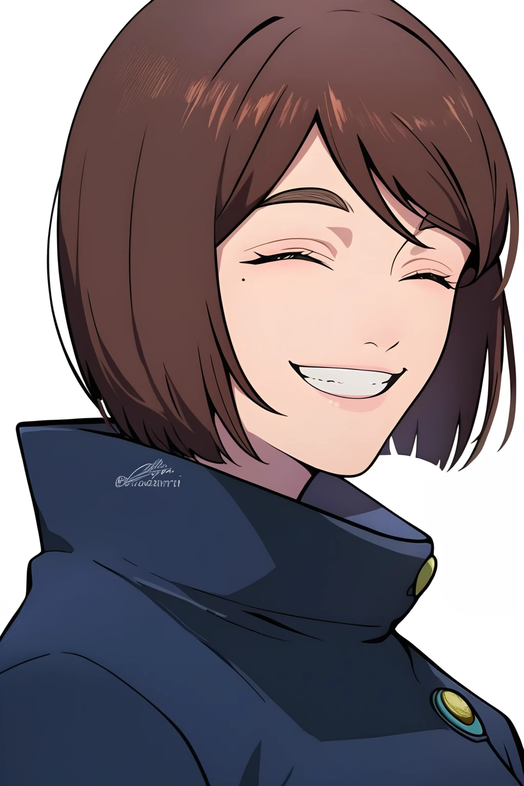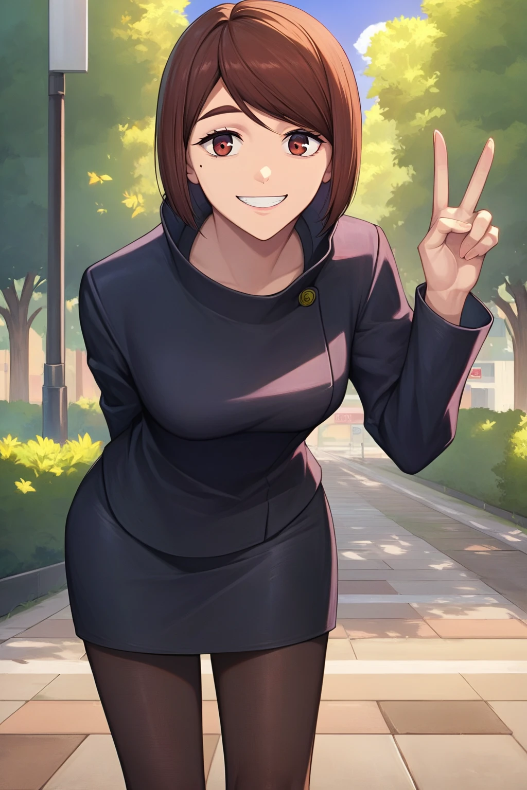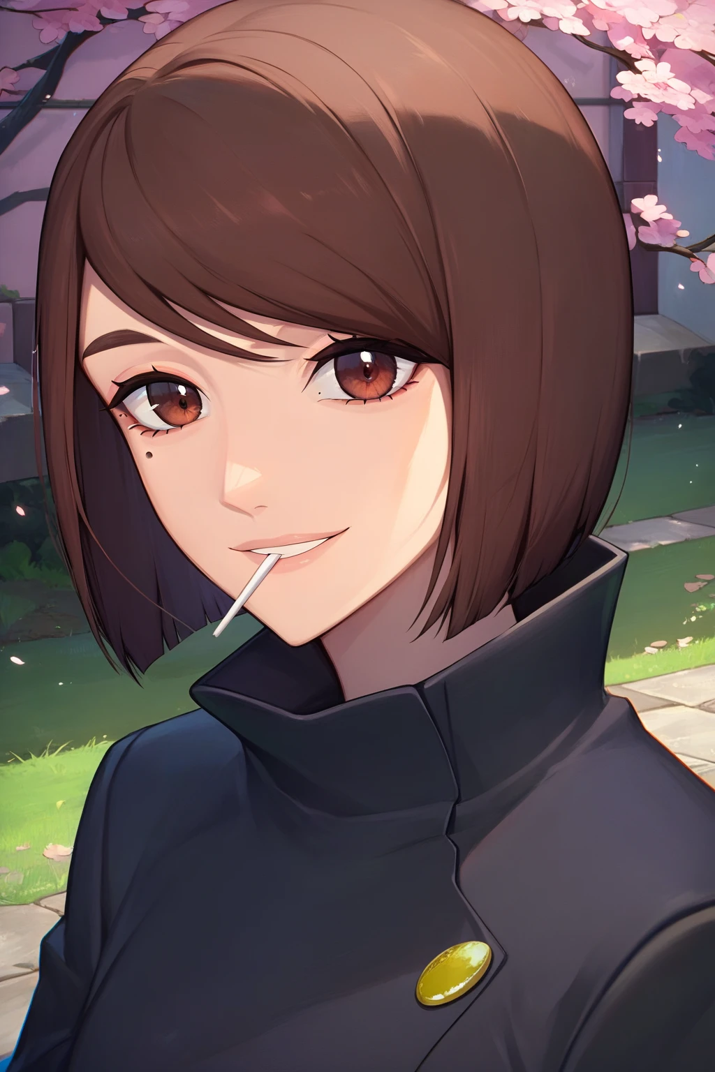 shoko ieiri, 1girl, short hair, brown hair, bob cut, brown eyes, mole under eye, school uniform, black jacket, gakuran, black skirt, pantyhose