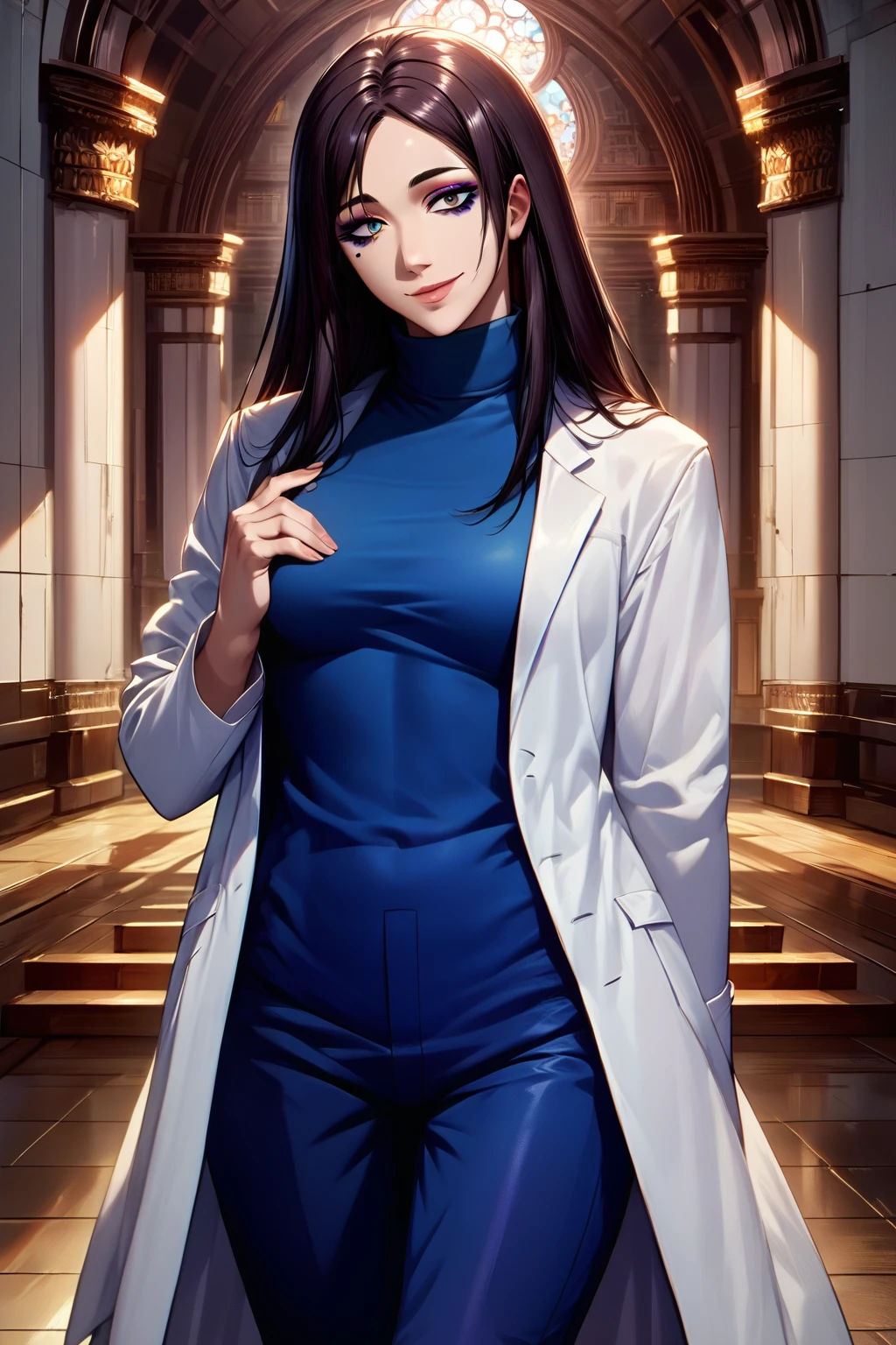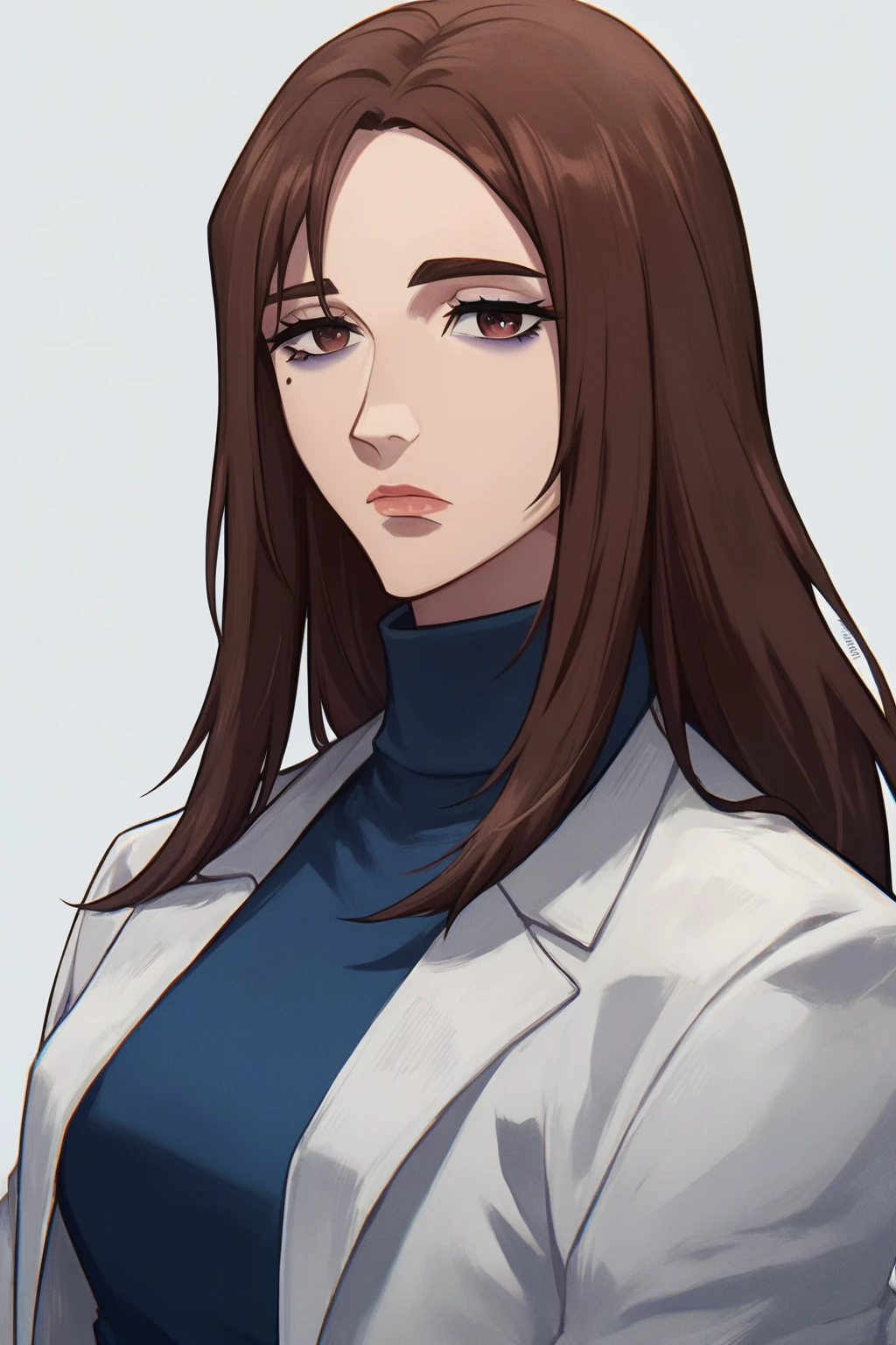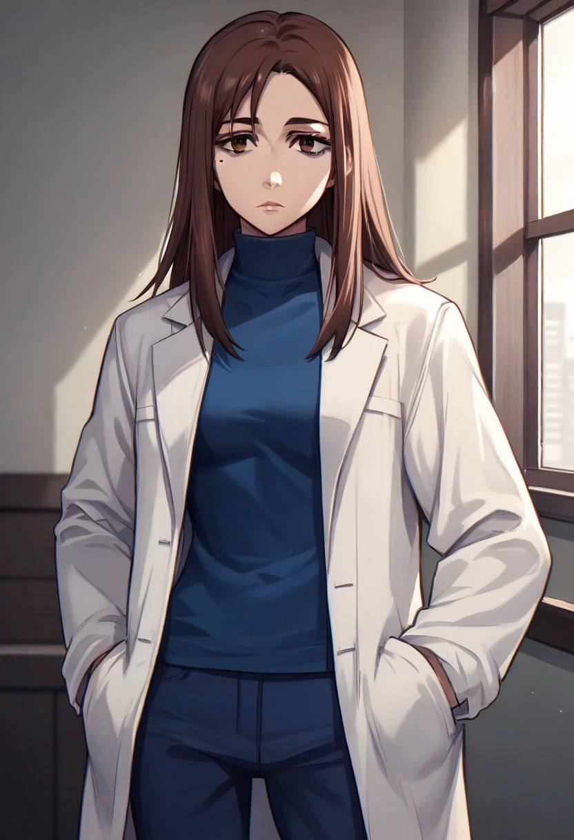 shoko ieiri, 1girl, long hair, brown hair, brown eyes, mole under eye, lips, makeup, white coat, long sleeves, blue shirt, turtleneck, blue pants