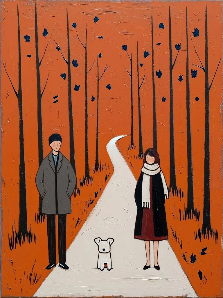 two figures and small white dog in orange forest with winding white path, bold color‑field abstraction, thick impasto strokes, elongated dark trees, expressive palette‑knife textures, atmospheric surrealism