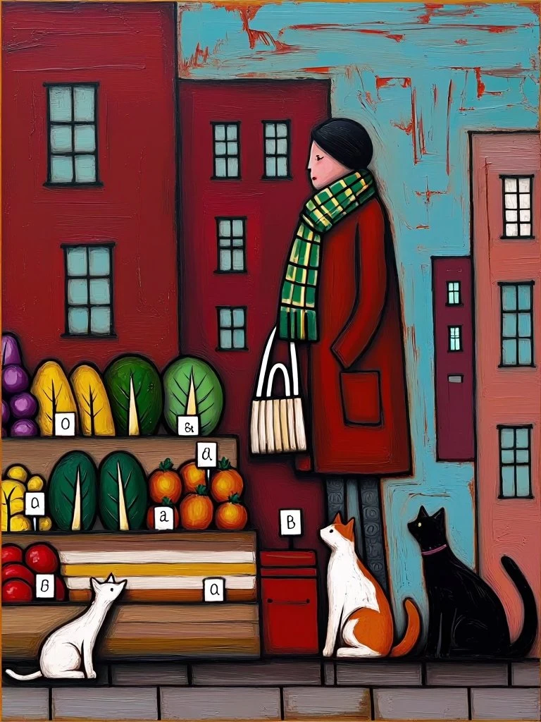 market stall scene with stylized produce and cats, dense impasto layers, abstracted architecture, rough palette‑knife strokes, saturated reds and turquoise blocks, expressive distortions, tactile mixed‑media textures